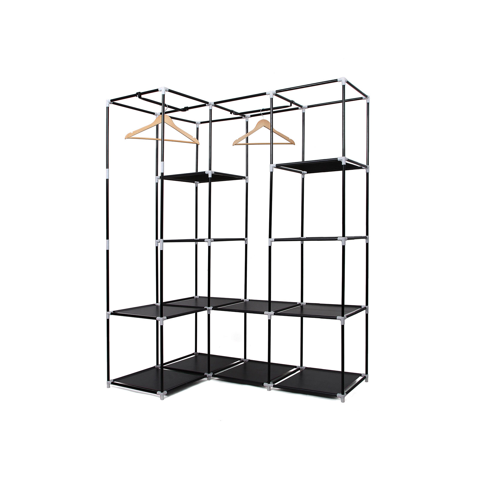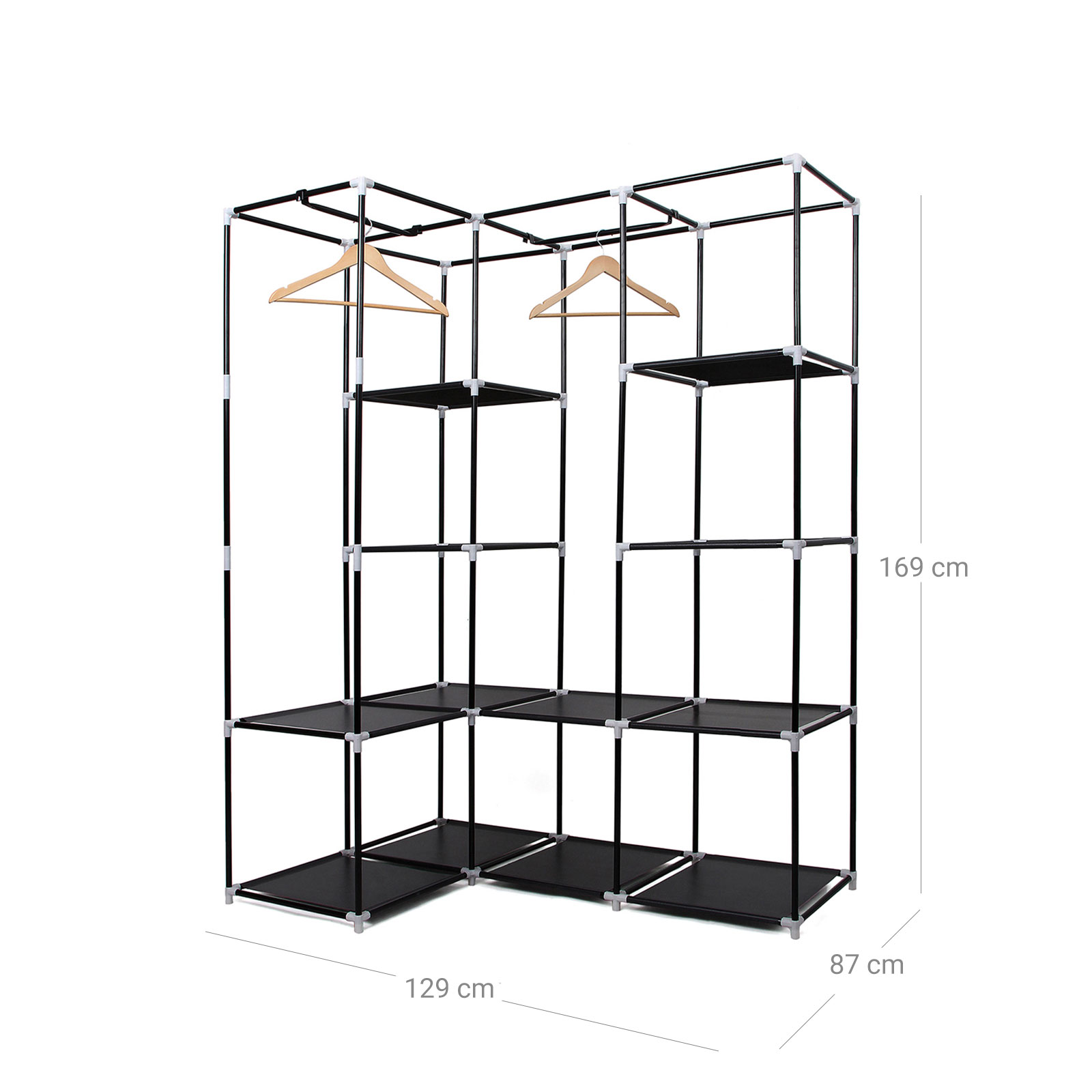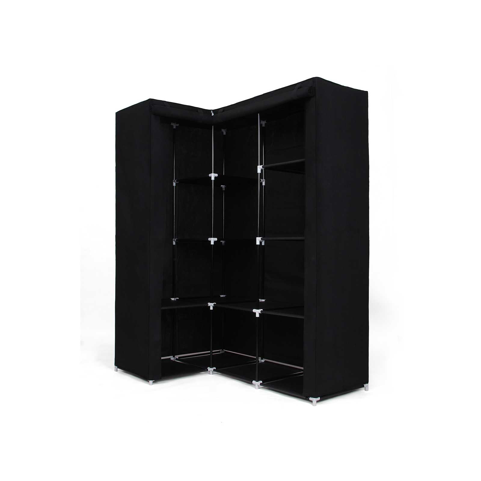 Are you always annoyed by clothes lying around everywhere? And do you never have enough space for your belongings when you change your wardrobe according to the season? The Songmics corner wardrobe is the perfect solution for you, helping you to get your home tidy again. The wardrobe offers plenty of space, it is a real “space saver,” it fits a lot inside and stores a lot. You can store all kinds of things in it, such as bedding, winter/summer clothes, shoes, and similar items. The clothes rail and shelves also allow for practical organization, making the wardrobe super functional. Notes: -If the tubes are difficult to insert into the plastic connectors, please try immersing the plastic connectors in warm water. – The product should be protected from direct sunlight, otherwise its service life may be shortened. Please store in a cool, dry place to prevent mold. – Please avoid using force when unpacking and assembling the product. If you encounter any problems during assembly, please contact our customer service team. We will be happy to help you solve the problems or offer you free replacement parts. Product details: – Color: black – Dimensions: approx. 129 x 169 x 87 cm (W x H x D) – Material: non-woven fabric, steel tube – Cover: non-woven fabric (75g/m²) – Cloth shelf: non-woven fabric (75g/m²) laminated with PE film – Tubing: iron (Ø 15 mm) – Packaging dimensions: 64 x 35 x 50 cm – Weight: 5 kg Scope of delivery: – 1 x corner fabric wardrobe
