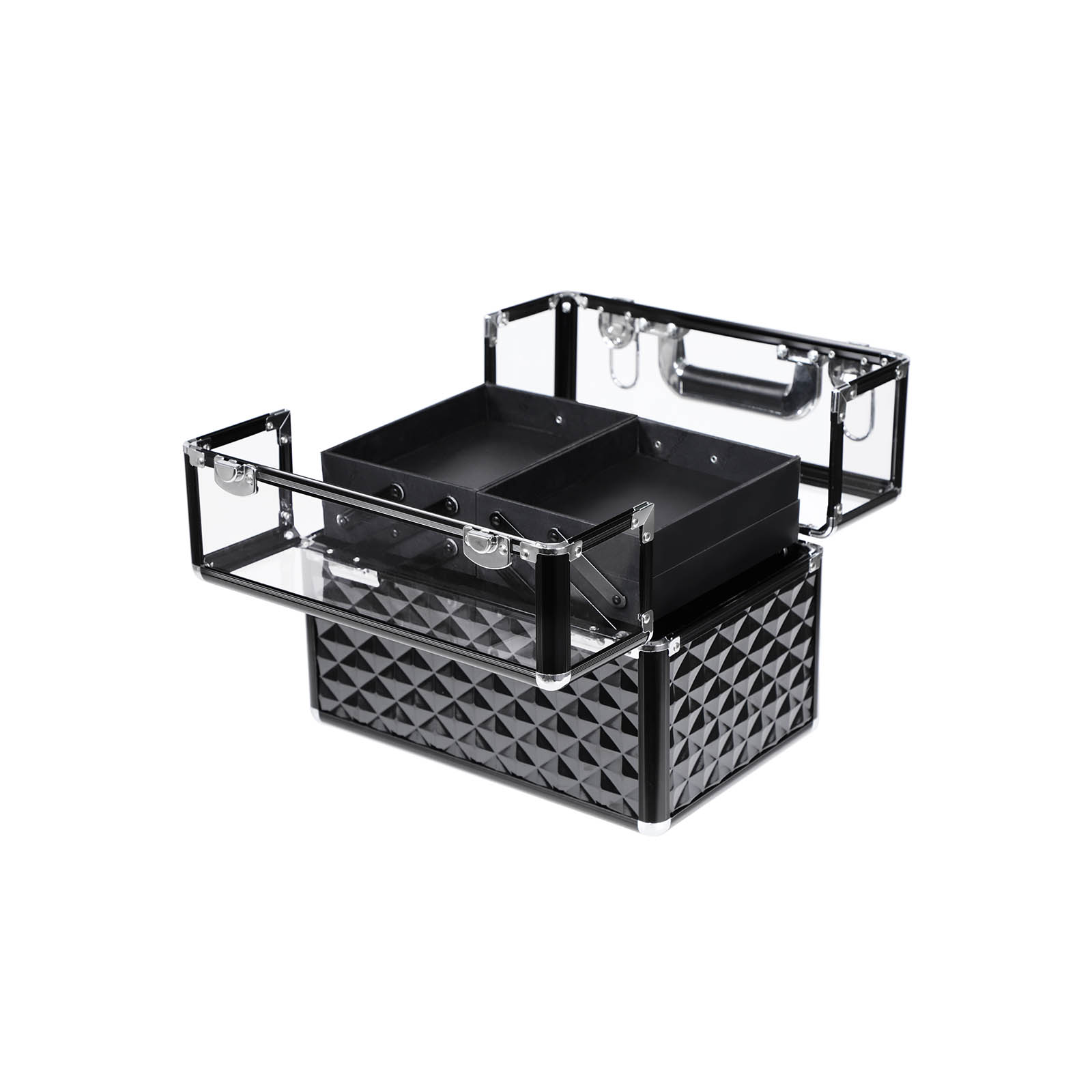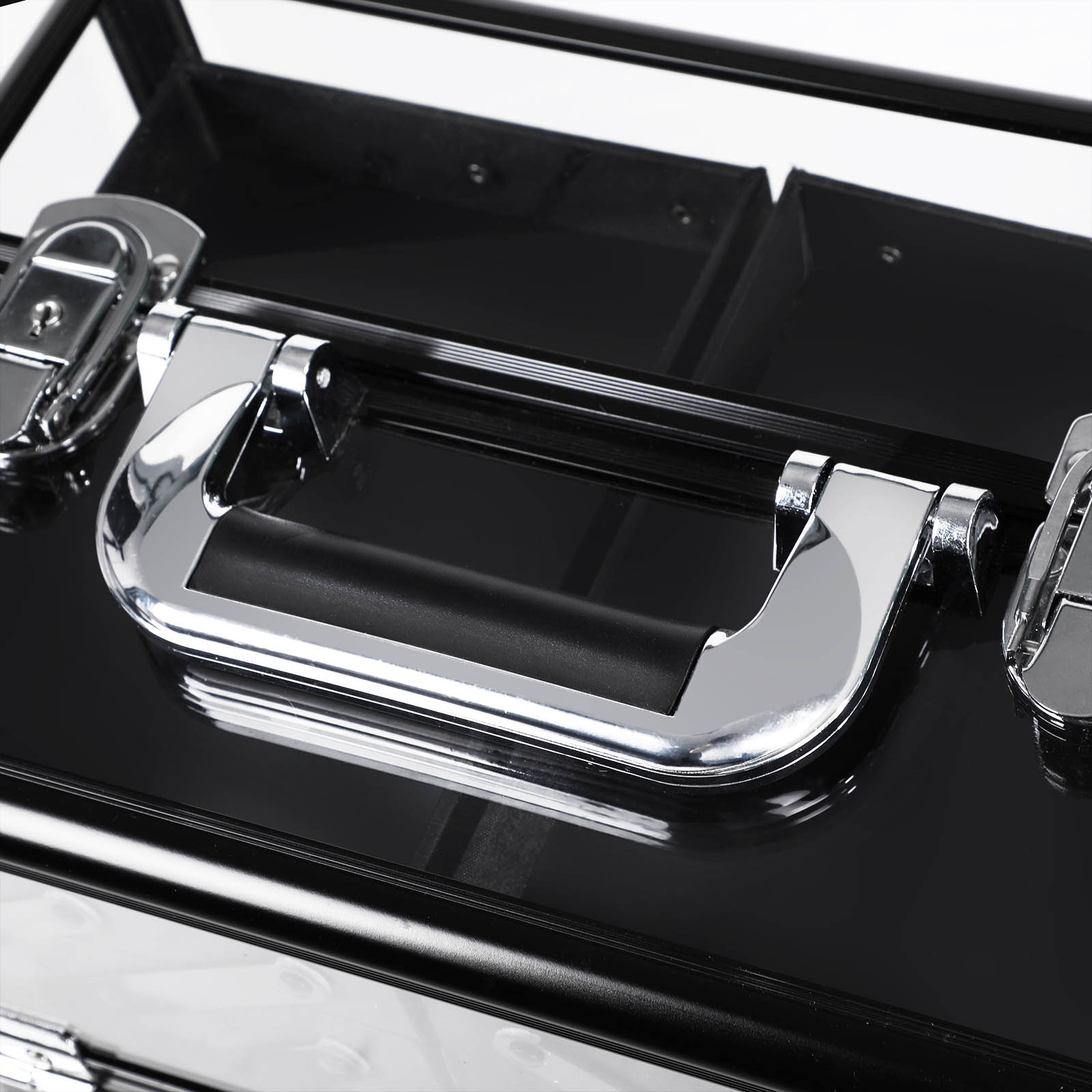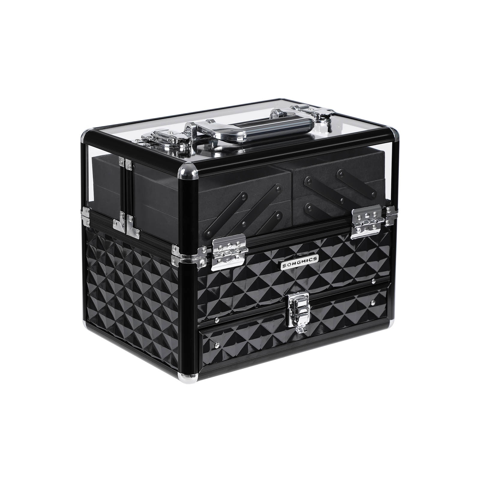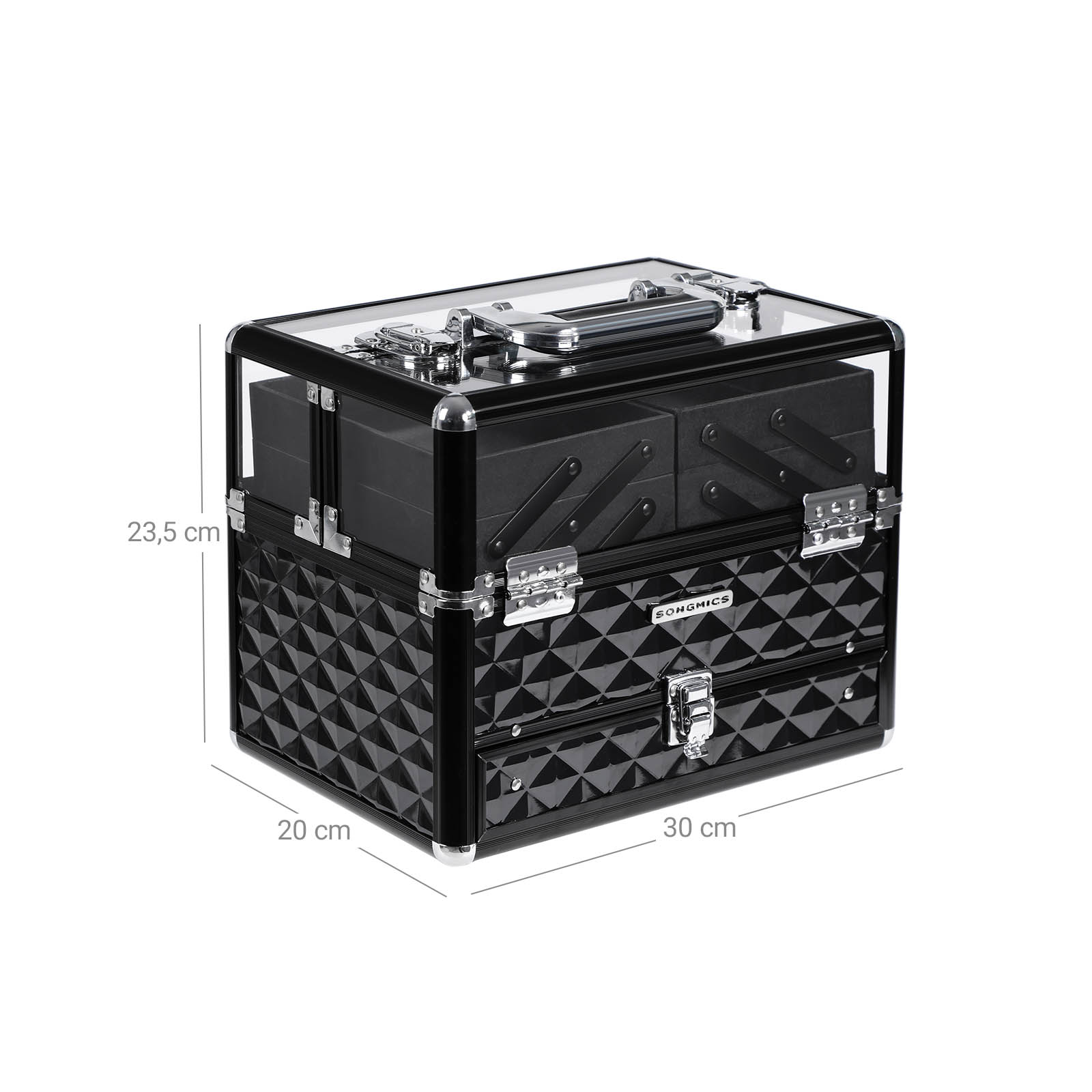 Notes: Please handle the product with care to prevent it from being knocked or dropped. Not washable, wipe gently with a damp cloth to clean. Before closing, you must align the groove with the spring on the edge of the case.To close the case properly, please do not place items that are too tall inside it. Before purchasing, please check the exact external and internal dimensions of the case on the website to ensure you receive a suitable cosmetic case. If you have any questions, please do not hesitate to contact us. Product details: Material: aluminum, acrylic glass, ABS plastic, E1 MDF, umbrella fabric Dimensions (total): 30 x 23.5 x 20 cm (W x H x D) Internal dimensions of the lower compartment: 28.5 x 7.3 x 18.5 cm (W x H x D) Internal dimensions of the fold-out compartment: 17.8 x 3 x 13.3 cm (W x H x D)Drawer dimensions: 25 x 3.7 x 17 cm (W x H x D)Net weight: 2.9 kgGross weight: 3.3 kgColor: blackScope of delivery:1 x cosmetic case2 x keys