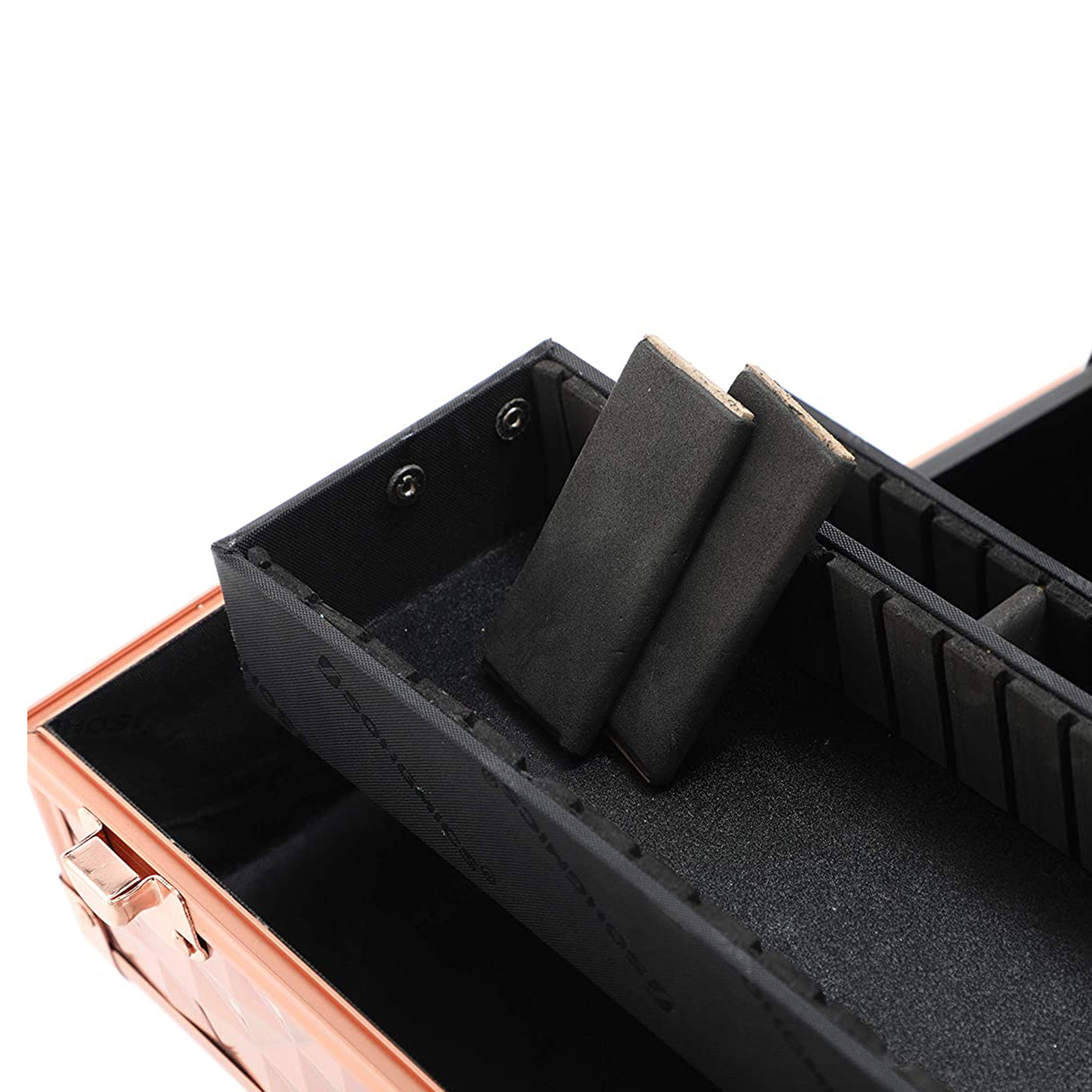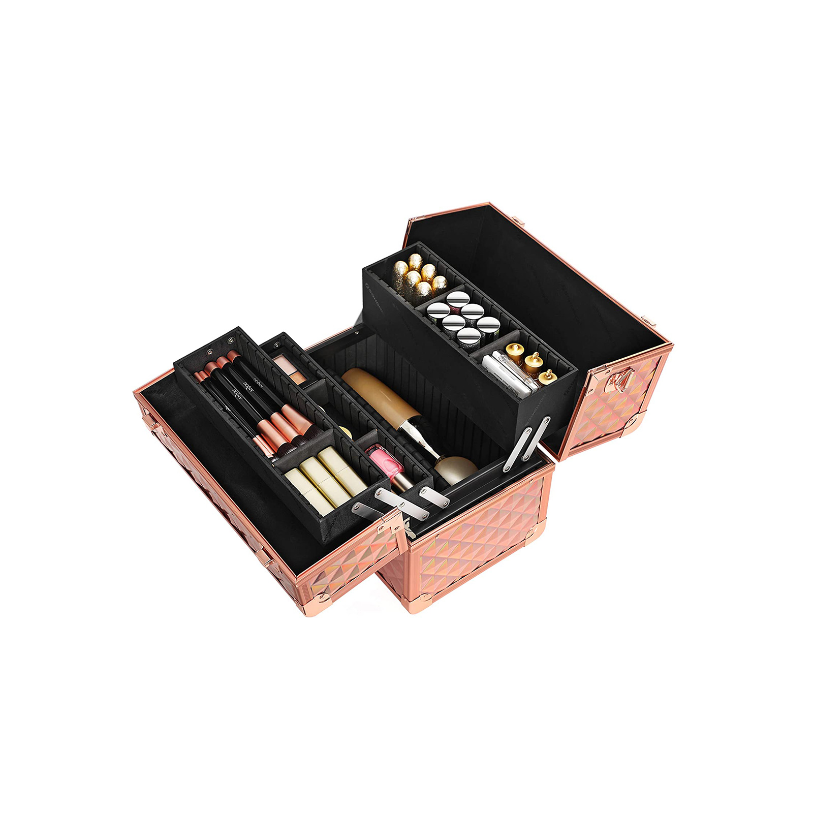 From now on, you no longer have to rummage through your dressing table drawer to find your blush or eyeliner under a pile of makeup. Equipped with plenty of storage space, this cosmetic case is even suitable for professional makeup artists. Cosmetics lovers can expect the following benefits: – Unique hologram look; the makeup case shimmers in different colors depending on the angle. – Spacious box with a perfect layout. – Made from high-quality materials; aluminum-coated edges, reinforced metal corners; particularly durable. – A “click” sounds when opening and closing. – Includes a shoulder strap for easy transport. Product details:- Color: rose gold metallic – Material: MDF (medium-density fiberboard), PVC, PE, ABS plastic, aluminum – Size: 30 x 19 x 24 cm (L x W x H) – Weight: 2.2 kg Scope of delivery: – 1 x cosmetic case – 1 x carrying strap – 2 x keys SONGMICS notes:- Please do not expose the product to direct sunlight. – Please do not bring the product into contact with sharp or pointed objects to avoid damage. – The keys are very small. Therefore, keep them out of the reach of children in a safe place to avoid health hazards from inhaling or swallowing the keys. Product description