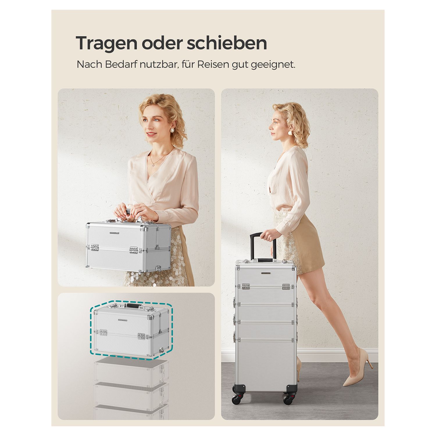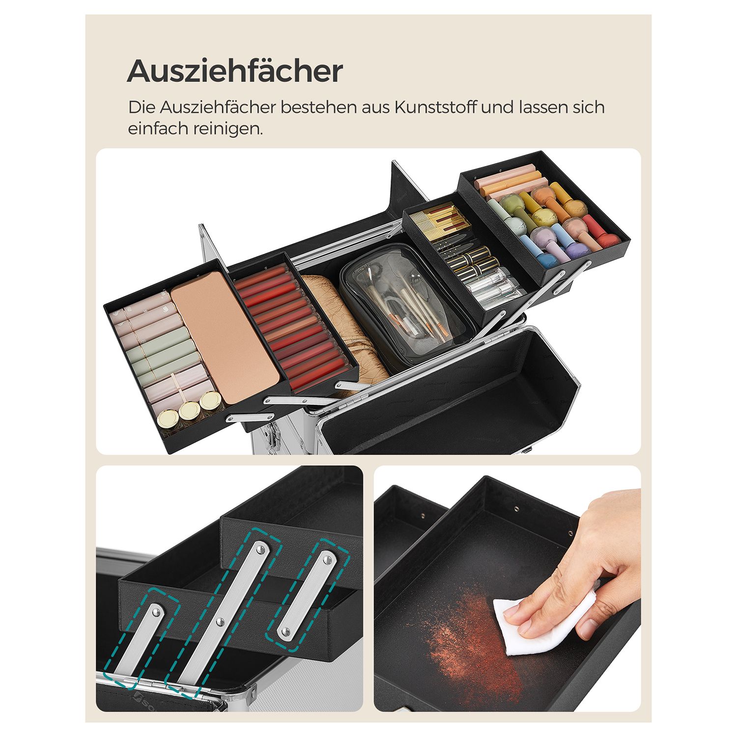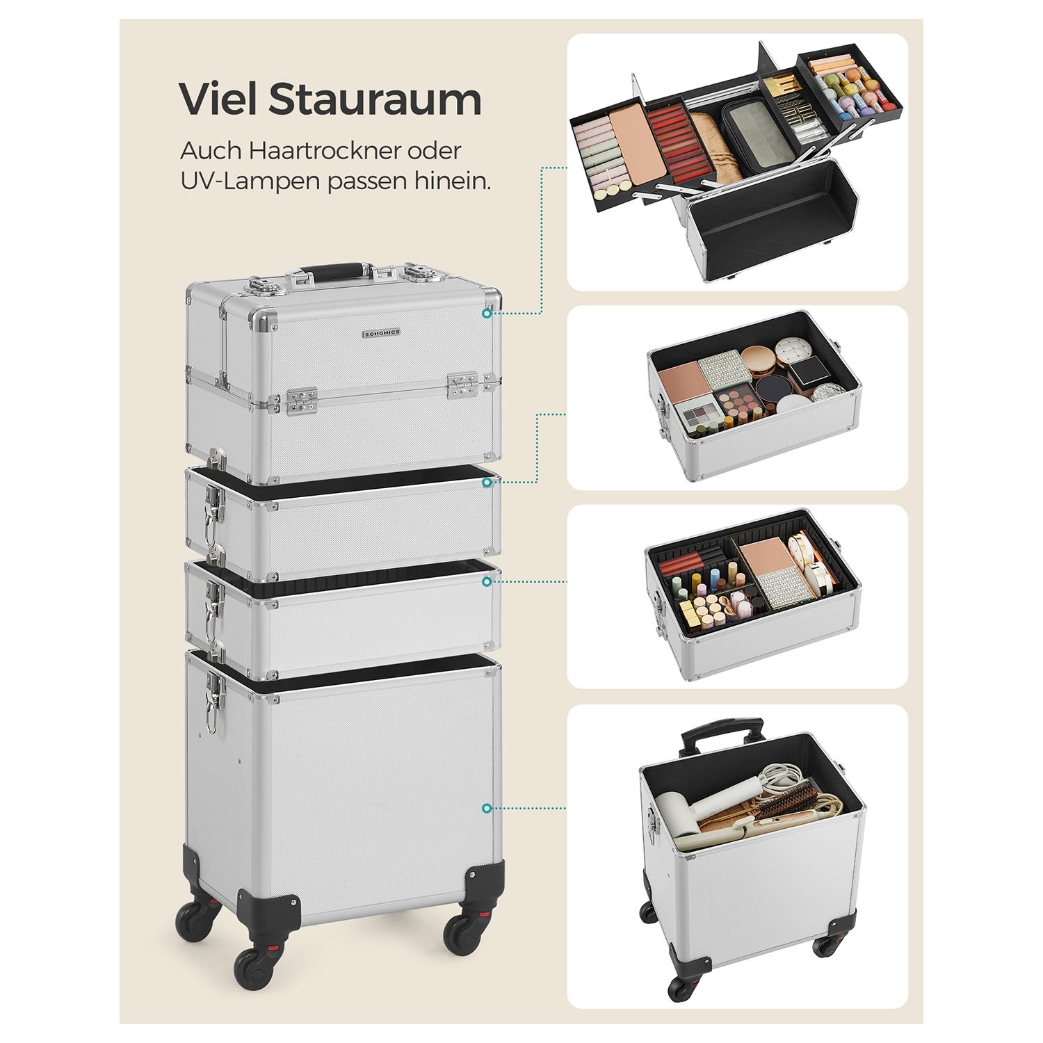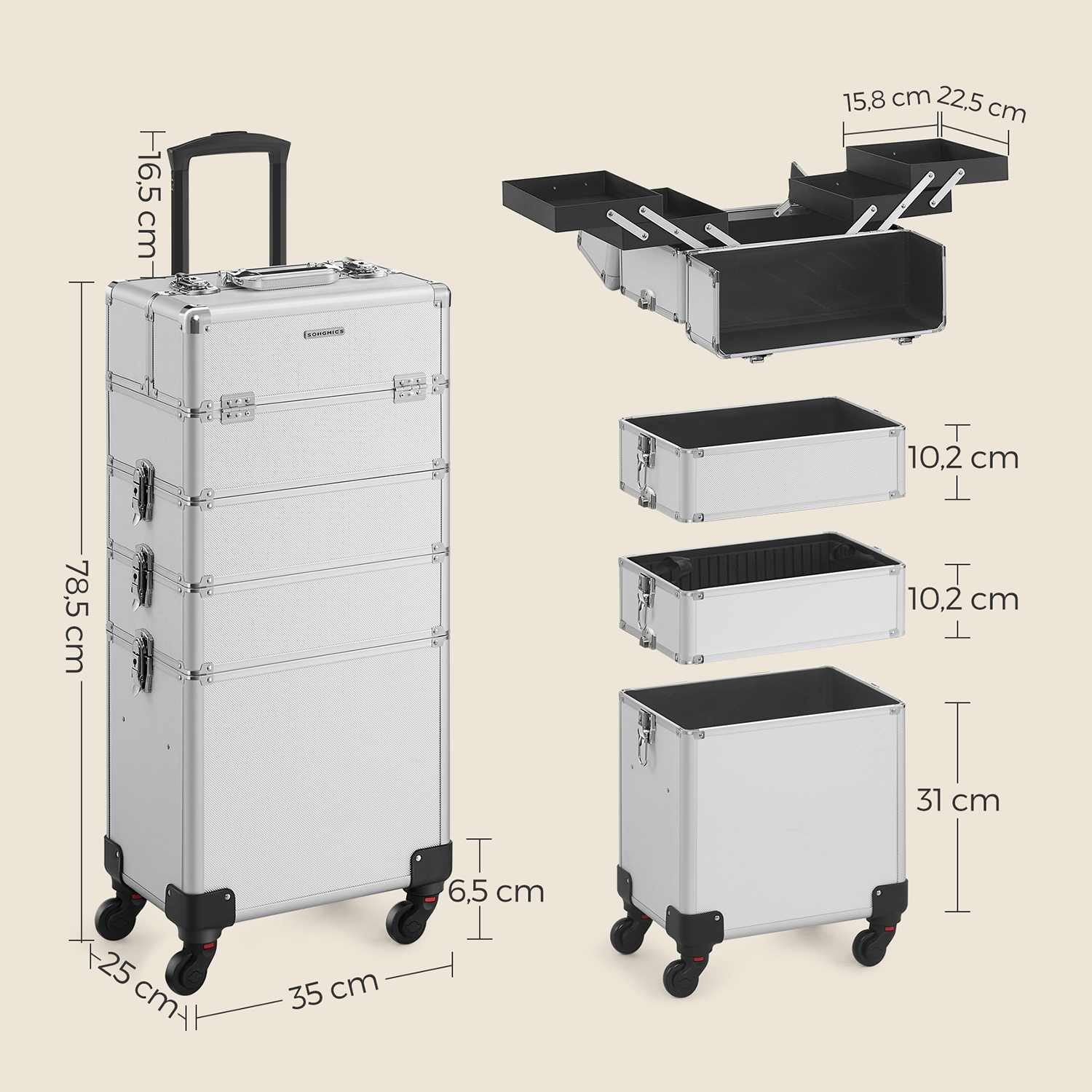 Product details: Color: Silver Material: Aluminum strips, MDF, plastic Size: Overall size (with casters): 35 x 25 x 78.5 cm (L x W x H) Overall size (without casters): 35 x 25 x 72 cm (L x W x H) Size of the first level (one small case): 35 x 25 x 22 cm (L x W x H) Size of the compartment in the lower section of this small case: 35 x 25 x 8.5 cm (L x W x H) Size of one pull-out compartment (4x): 22.5 x 15.8 x 3.3 cm (L x W x H) Size of the second level: 35 x 25 x 10.2 cm (L x W x H) Size of the third level: 35 x 25 x 10.2 cm (L x W x H) Size of the fourth level (an open box): 35 x 25 x 31 cm (L x W x H) Size of the insert in the fourth level: 33 x 21 x 7.5 cm (L x W x H) Weight: 7.4 kg Scope of delivery: 1 x makeup case 4 x universal casters 4 x keys SONGMICS Notes:Due to manufacturing tolerances, the product may vary slightly (less than one millimeter) from the dimensions we have specified. Please note the dimensions of the product. This product may have a slight odor when unpacked. In this case, please place it in a cool, well-ventilated place for a while before using it.