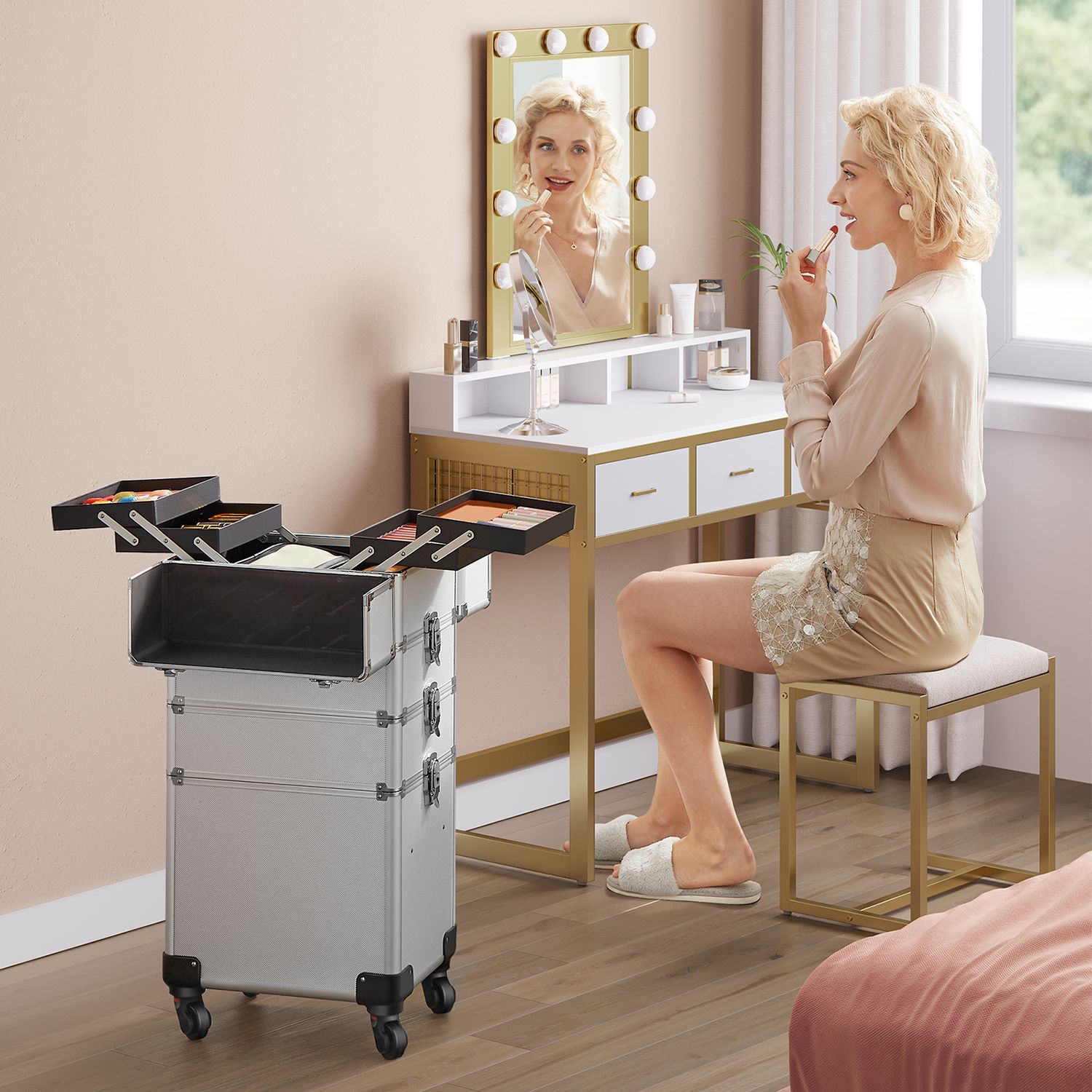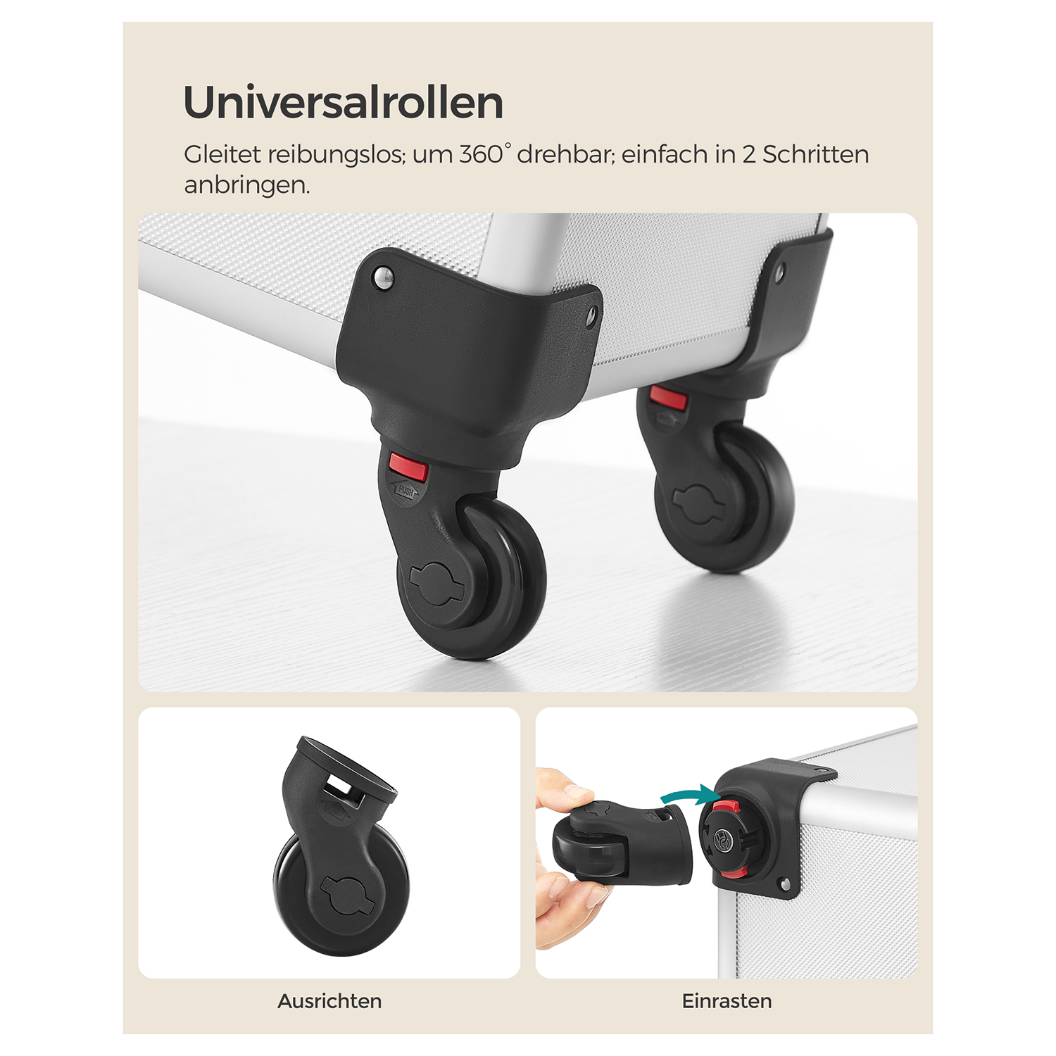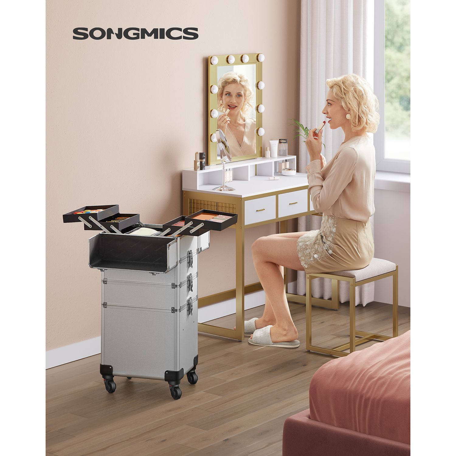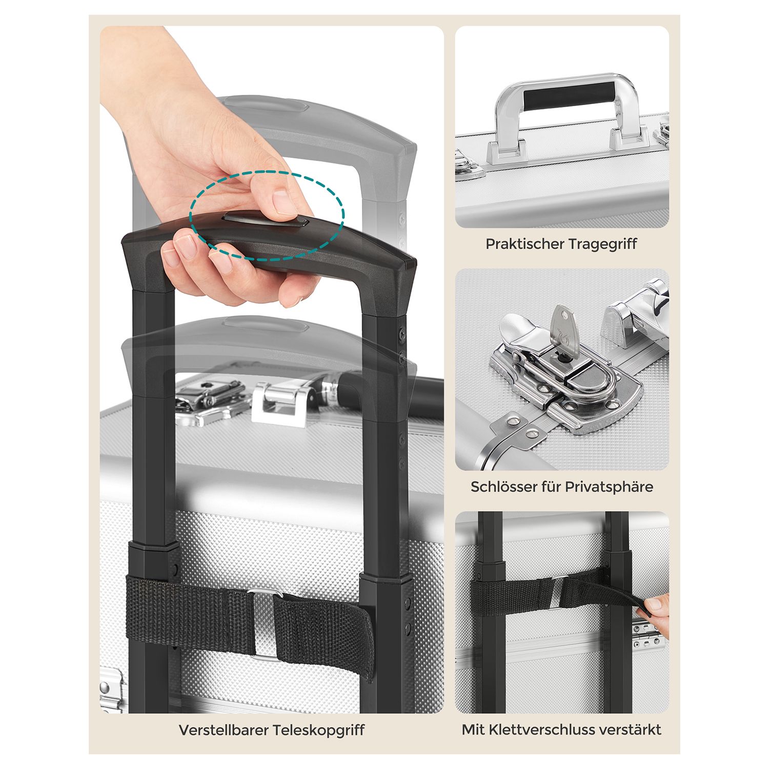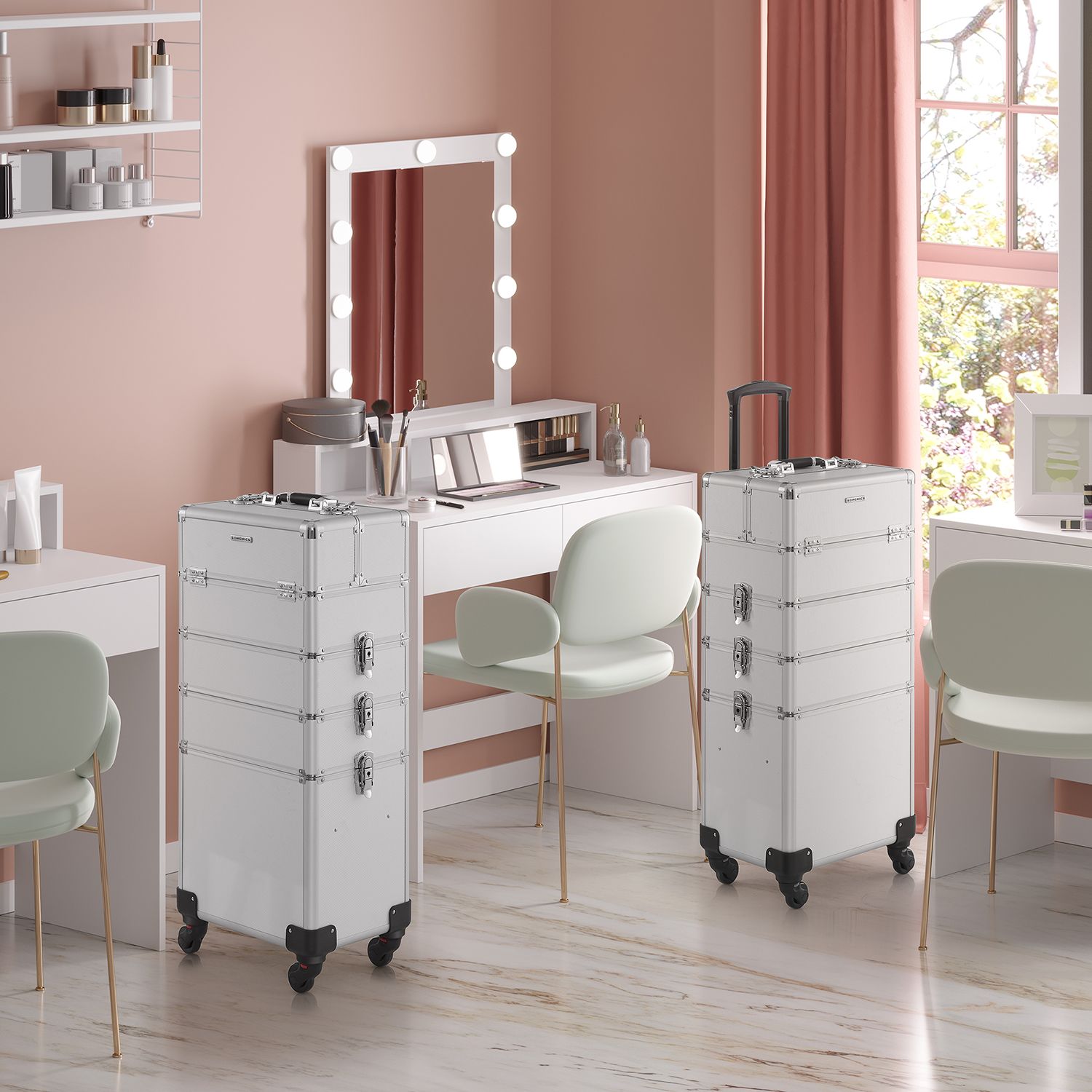 Product details: Color: Silver Material: Aluminum strips, MDF, plastic Size: Overall size (with casters): 35 x 25 x 78.5 cm (L x W x H) Overall size (without casters): 35 x 25 x 72 cm (L x W x H) Size of the first level (one small case): 35 x 25 x 22 cm (L x W x H) Size of the compartment in the lower section of this small case: 35 x 25 x 8.5 cm (L x W x H) Size of one pull-out compartment (4x): 22.5 x 15.8 x 3.3 cm (L x W x H) Size of the second level: 35 x 25 x 10.2 cm (L x W x H) Size of the third level: 35 x 25 x 10.2 cm (L x W x H) Size of the fourth level (an open box): 35 x 25 x 31 cm (L x W x H) Size of the insert in the fourth level: 33 x 21 x 7.5 cm (L x W x H) Weight: 7.4 kg Scope of delivery: 1 x makeup case 4 x universal casters 4 x keys SONGMICS Notes:Due to manufacturing tolerances, the product may vary slightly (less than one millimeter) from the dimensions we have specified. Please note the dimensions of the product. This product may have a slight odor when unpacked. In this case, please place it in a cool, well-ventilated place for a while before using it.