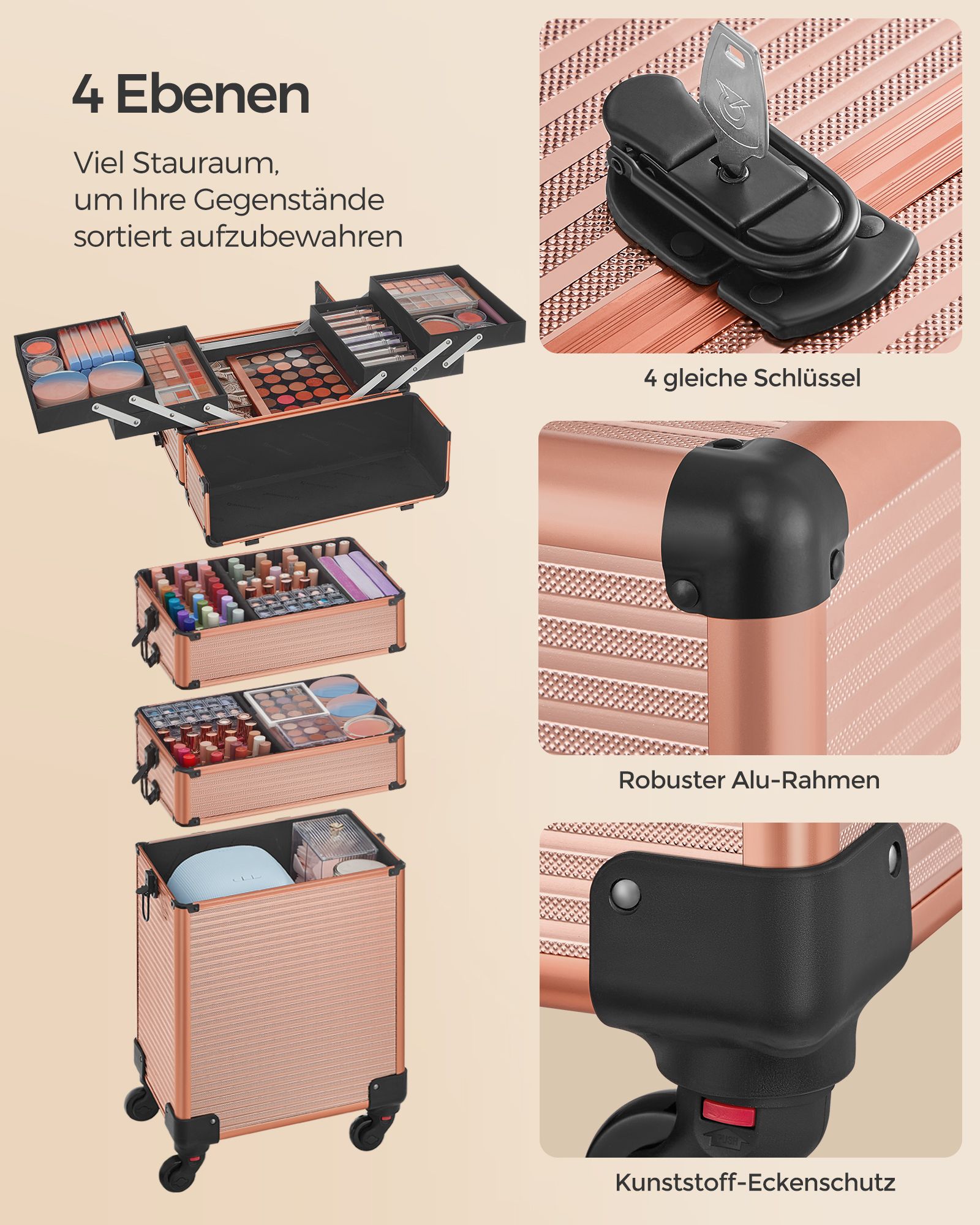 SONGMICS Cosmetic Case, Trolley, 4-in-1 Makeup Case, Extra Large, Hairdresser’s Case, 34 x 24 x 79.3 cm, Lockable, Makeup Case, 360° Swivel Casters, For Travel, Gift Idea, Black JHZ015B01