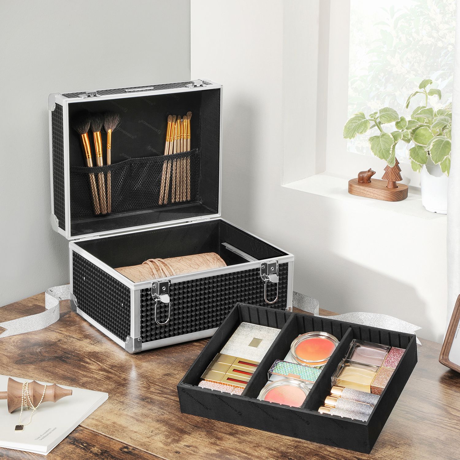 Scores points for its long service life Durable MDF panels, robust ABS plastic surface, and sturdy aluminum strips – this cosmetic case promises a long service life. Plenty of storage space The storage compartment, which is equipped with flexible dividers, allows you to neatly store your makeup or other accessories. The case also has 2 locks so you can easily lock it to protect your valuables from prying hands. Product details: – Color: Black – Material: MDF (medium-density fiberboard), aluminum, ABS plastic – Size: 30 x 24 x 19 cm (L x W x H) – Weight: 1.7 kg Scope of delivery:- 1 x cosmetic case – 2 x keys SONGIMC notes: – Please do not expose the product to direct sunlight. – Please do not bring the product into contact with sharp or pointed objects to avoid damage. – The keys are very small. Therefore, keep them out of the reach of children in a safe place to avoid health hazards from inhaling or swallowing the keys.