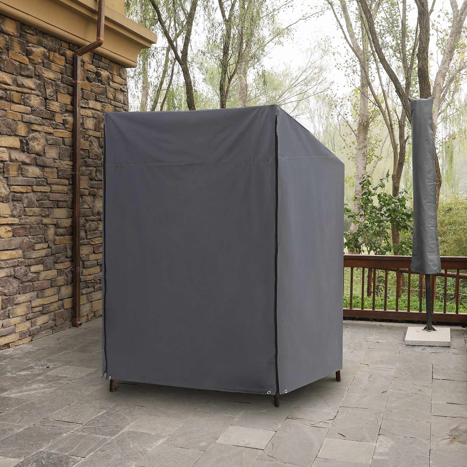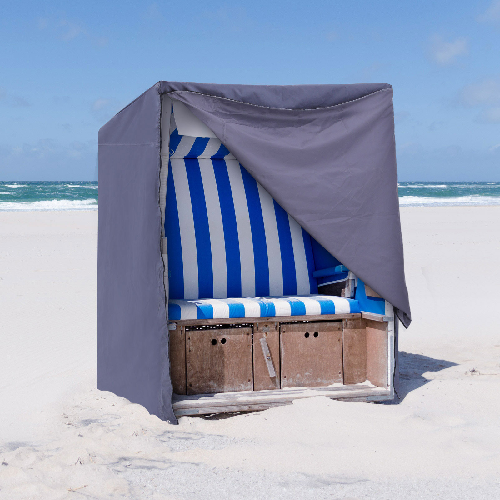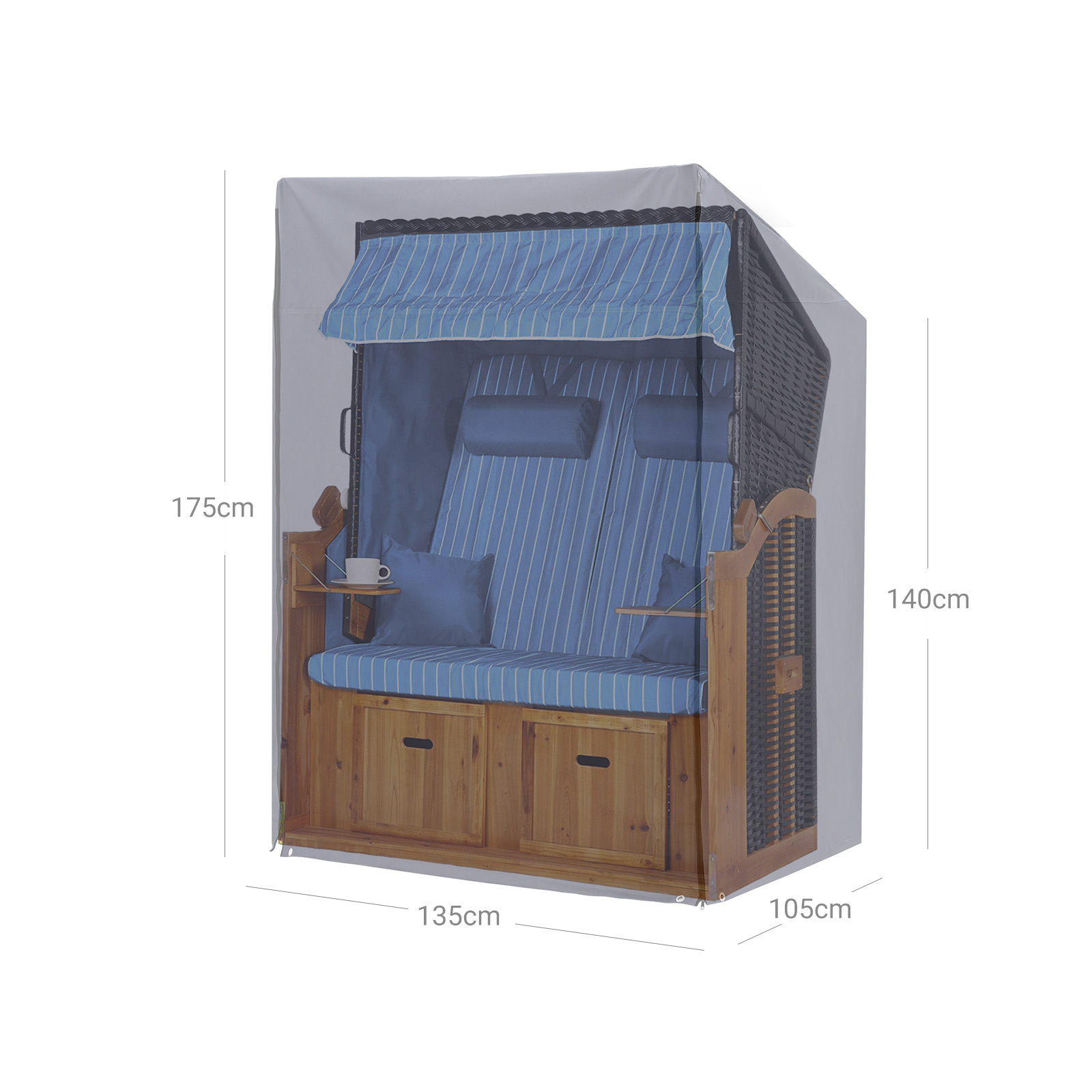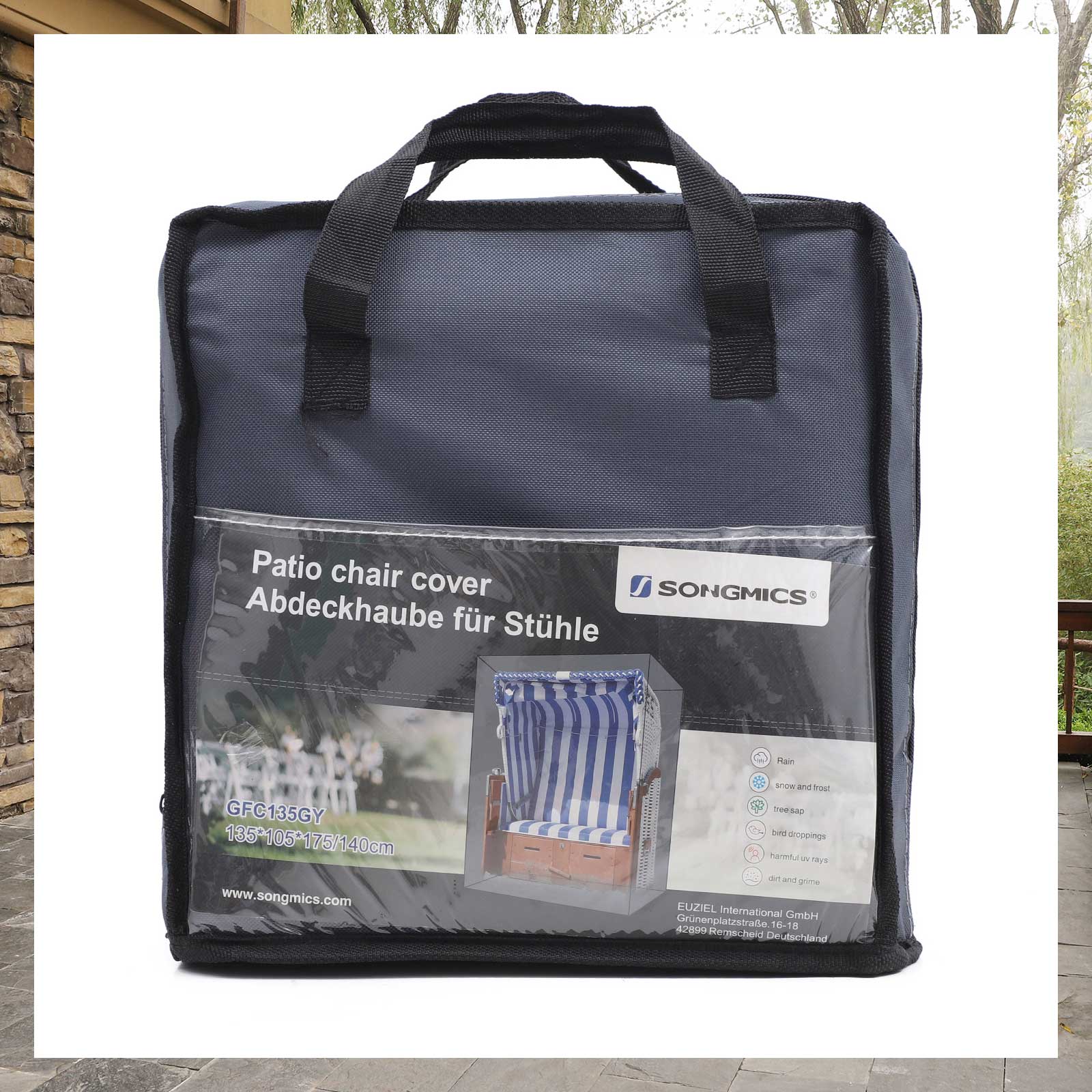 This cover from SONGMICS is designed to protect your beach chair not only from everyday influences such as sunlight, dust, and resin, but also from sudden changes in weather conditions such as rain, wind, and snow. Exceptional materials: The 600D PVC-coated Oxford fabric ensures that this cover does not tear even in heavy rain and wind and remains waterproof. The fabric is also very robust and therefore suitable for long-term use. It has also passed the TÜV Rheinland test for color fastness. This means that the color of the tarpaulin will not fade even in the event of continuous rain or long hours of sunshine.Important details: Did you forget to cover your beach chair and it has already started to rain? Don’t worry, because the two zippers make it easy for you to cover the beach chair without wasting much time. Strong wind? Tighten the cord at the bottom of the cover so that it doesn’t fly away like a balloon.Product details: Color: Gray Material: 600D Oxford fabric with PVC coating Size: 135 x 105 x 175/140 cm (L x W x H) Weight: 3 kg Scope of delivery: 1 x protective cover for beach chairs 1 x carrying bag SONGMIX notes:Do not expose the product to high temperatures and store it in a cool, dry place. Not suitable for machine washing.