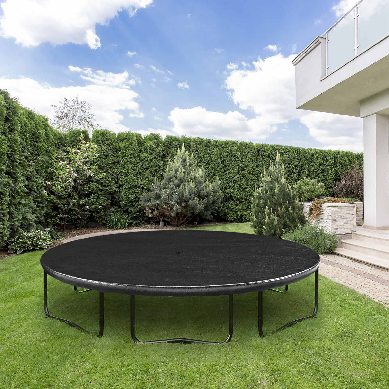 This cover keeps your trampoline in good condition even in bad weather conditions and extends its service life! Highlights of this trampoline cover: – With water drainage holes: holes in the middle of the cover allow accumulated rainwater to drain away. – Quick installation: the elastic straps and hooks help you to attach this cover easily. Whenever you want to jump on the trampoline, the cover can be removed again. – Good protection: Made of sturdy PE material, this cover will accompany your trampoline through the different seasons and protect it from UV rays, pollen, leaves, snow, etc. – Important note: Please note that this cover is only suitable for a round trampoline. Measure your trampoline before ordering to determine whether this cover will fit. Product details: – Color: Black – Material: PE (polyethylene) – Size: Ø 447 cm – Weight: 2.2 kg Scope of delivery: – 1 x SONGMICS trampoline cover Notes:- Not suitable for children under 3 years of age. – Designed for personal use only. – Before purchasing, please measure the size of your trampoline and determine whether the cover will fit. Only for trampolines with a diameter of 427 cm.