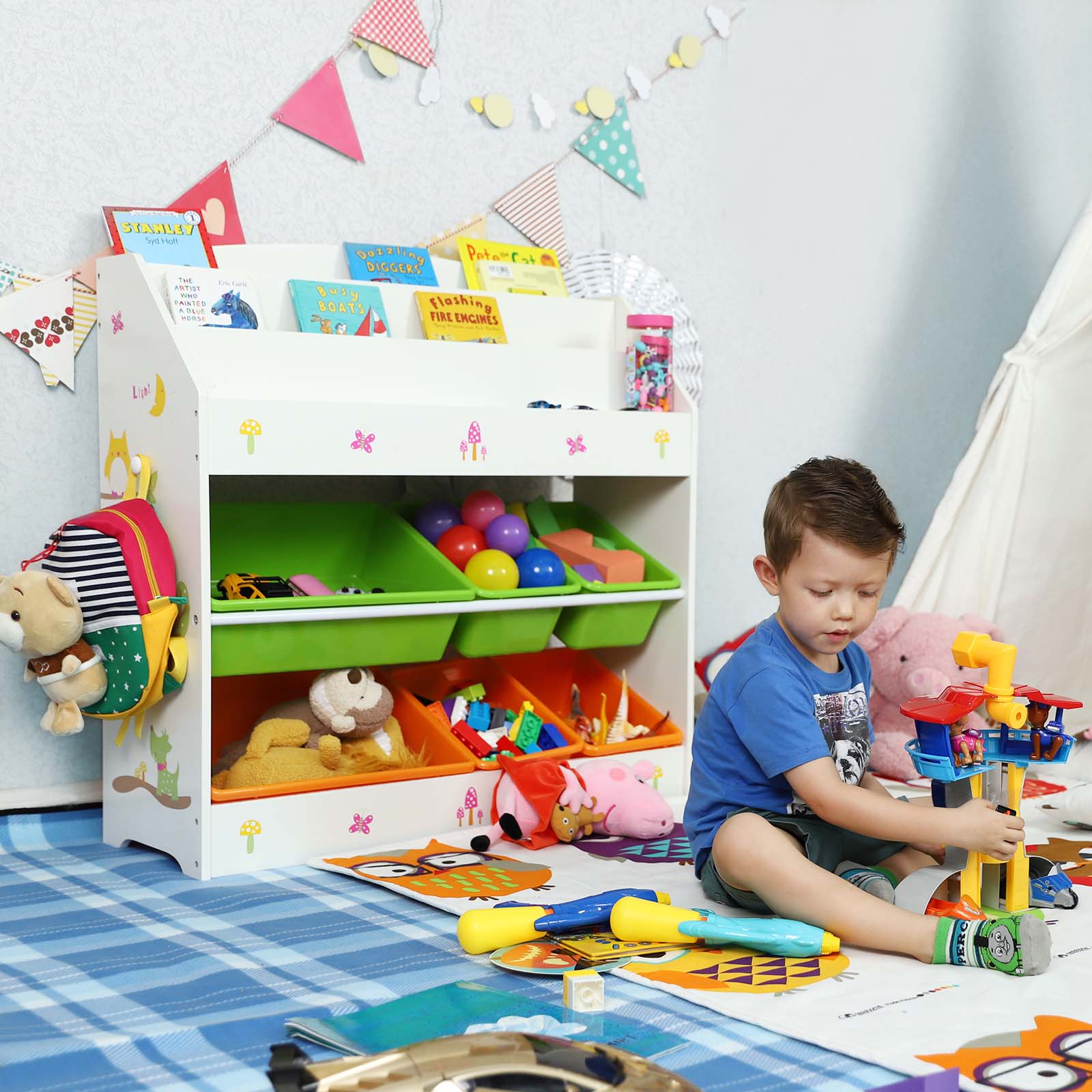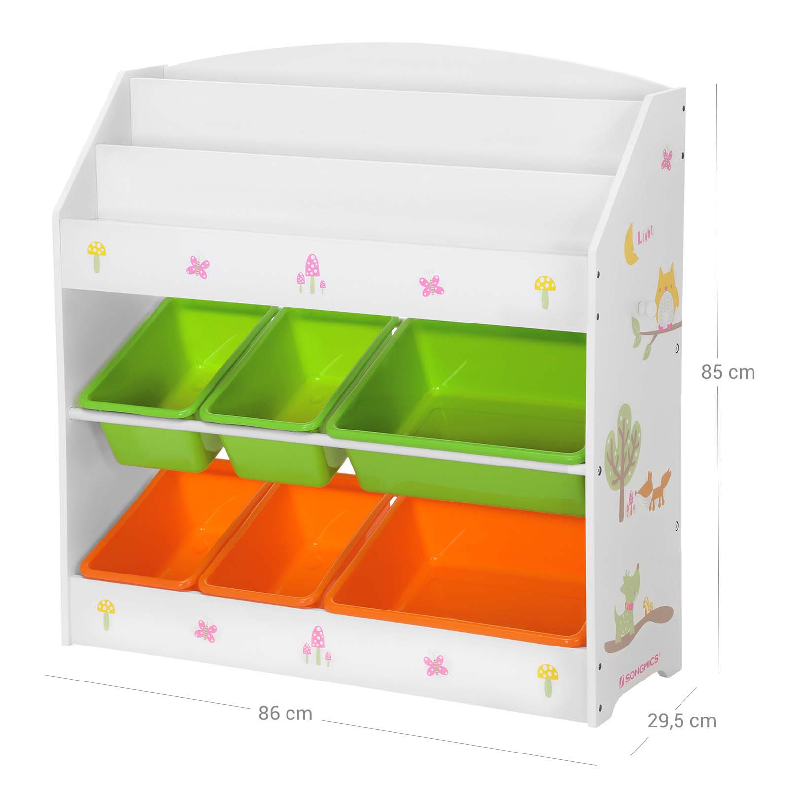 Finally, a combination of storage and learning! Have you ever seen a children’s storage unit that encourages both tidying up and reading? With this book and toy storage unit, you no longer need to repeatedly say “clean your room.” Children enjoy tidying up their rooms because it is much easier to store their books, toys, school supplies, and other items in this unit.Made of MDF boards and PP plastic boxes, it is easy to clean and very sturdy. Dimensions: 85.2 x 29.5 x 83 cm (W x D x H) for different space requirements. Smooth, rounded edges prevent children from scratching their clothes. The anti-tip devices are used to attach the shelf to the wall for added safety. This beautiful bookcase fits perfectly in the children’s room and encourages organization and reading. Don’t wait any longer and give this cabinet to your children! Develop their skills through practical exercises and spark their interest in learning! Product details: Color: white, multicolor Materials: MDF boards, melamine veneer, PP plastic Product size: 85.2 x 29.5 x 83 cm (W x D x H) Weight: 10 kg Load capacity of each shelf: 5 kg Scope of delivery: 1 x storage cabinet 1 x accessory bag 1 x instructions (DE, EN, FR, ES, IT) SONGMICS Notes:Before assembly, it is recommended to spread the expandable polyethylene foam in the packaging on the floor to prevent scratches. Please avoid direct contact between the product and hard floors during assembly.