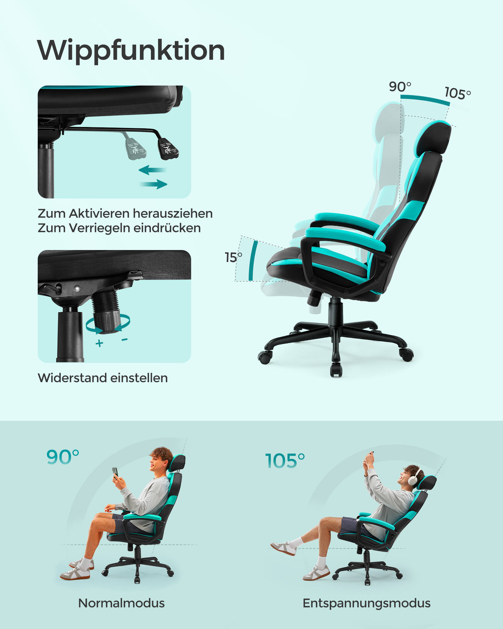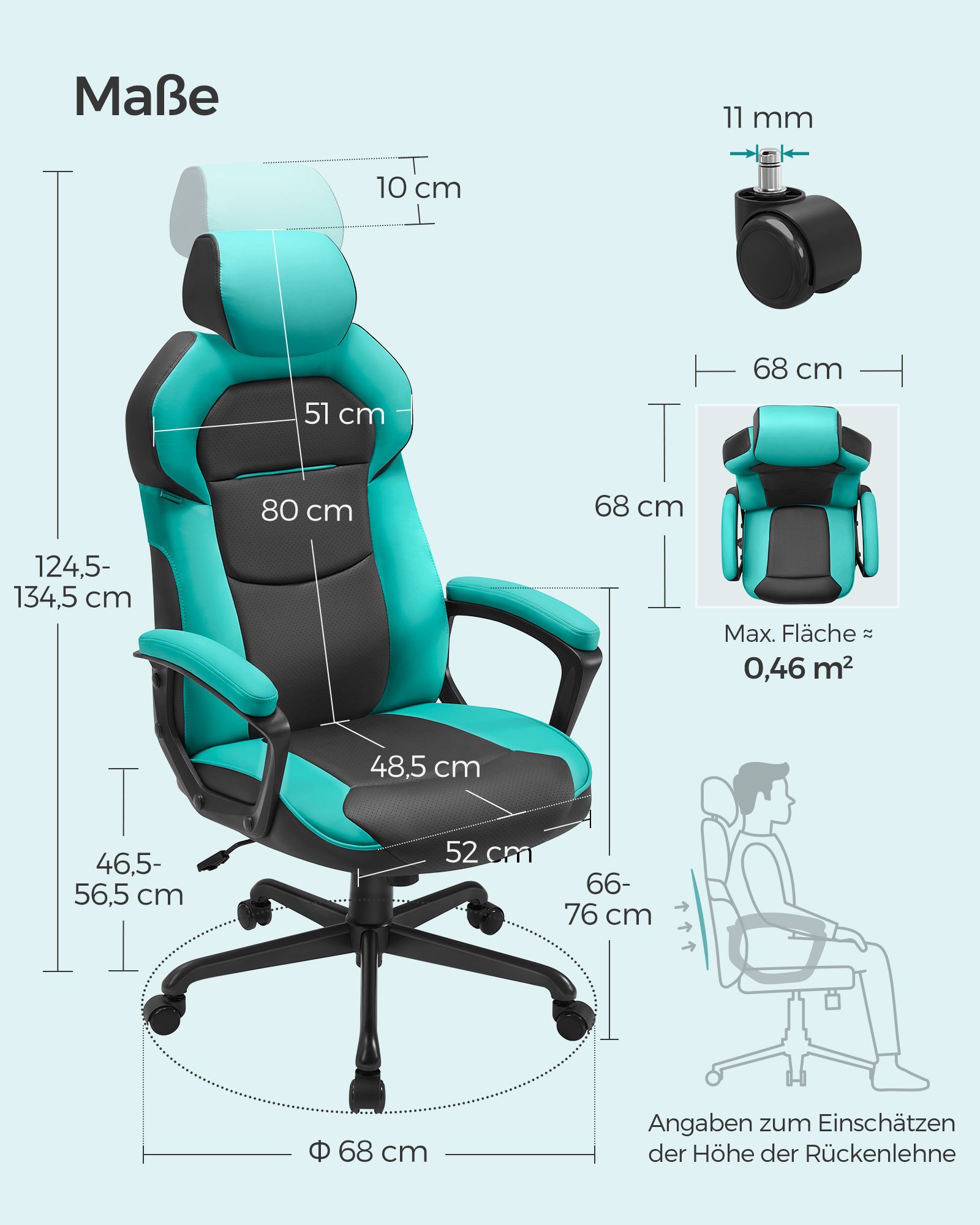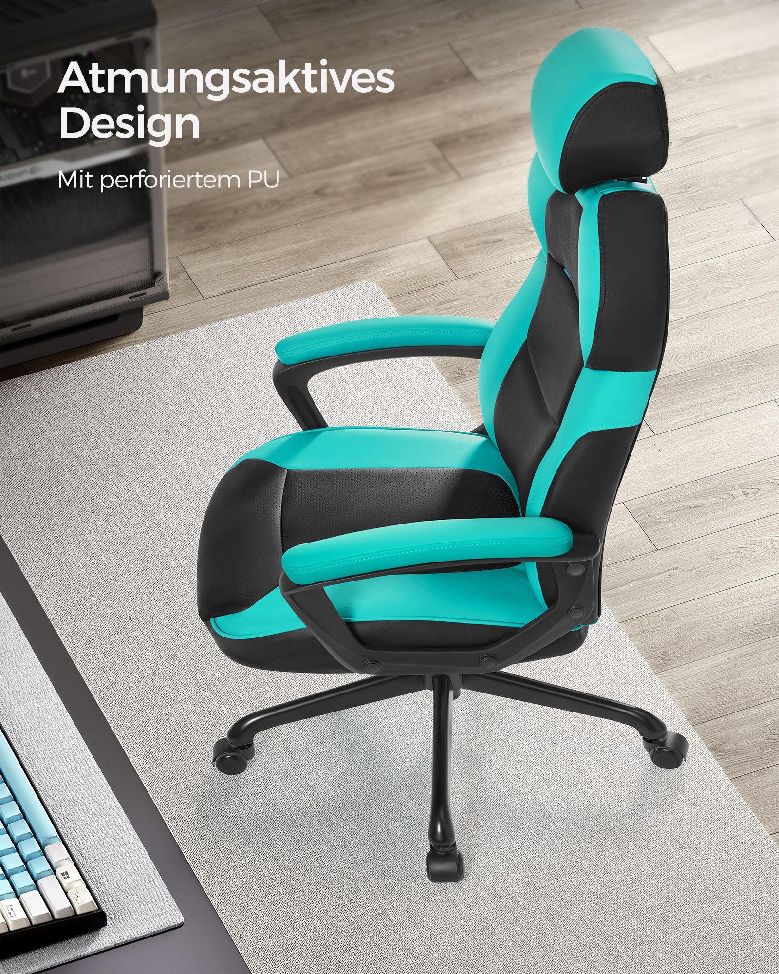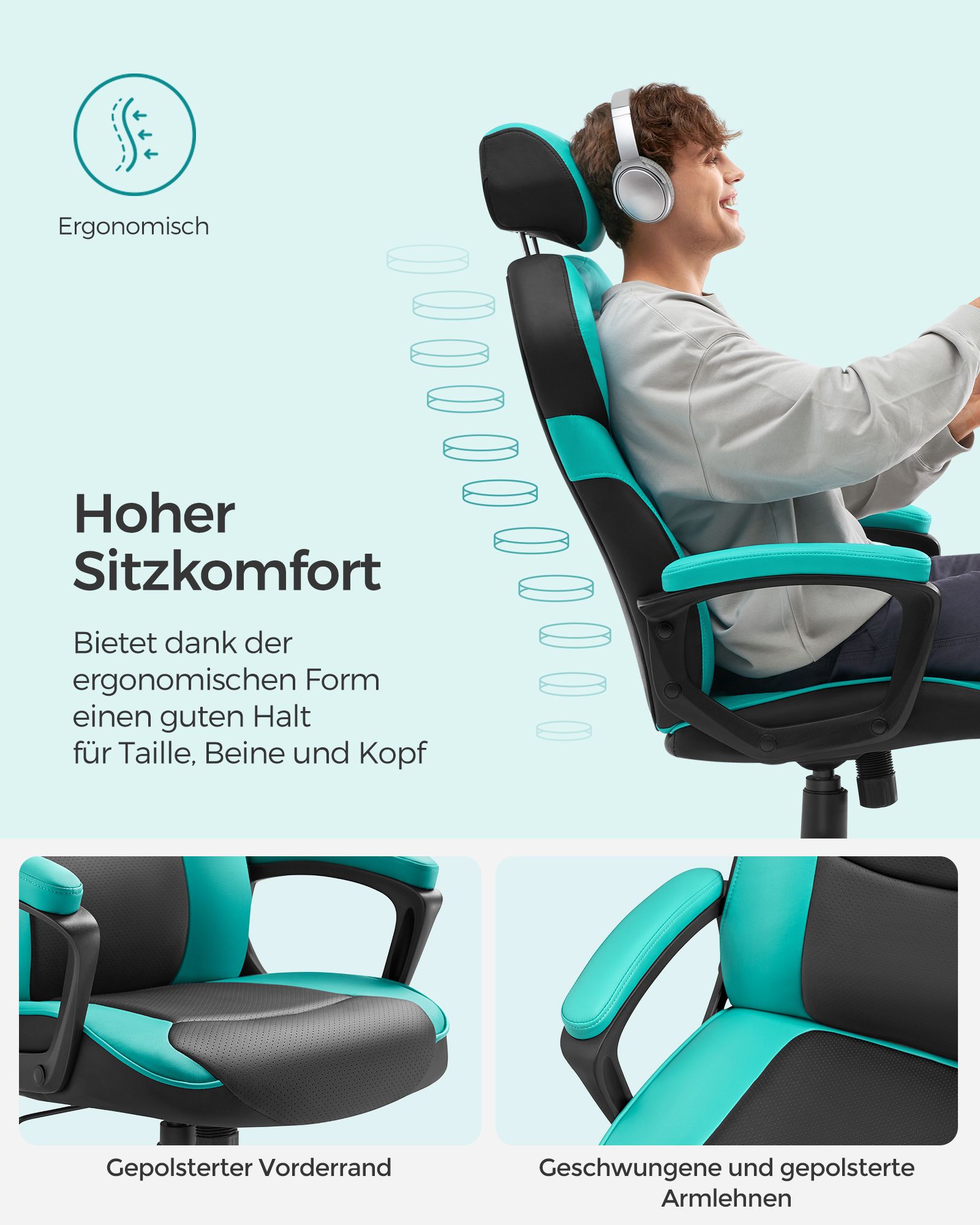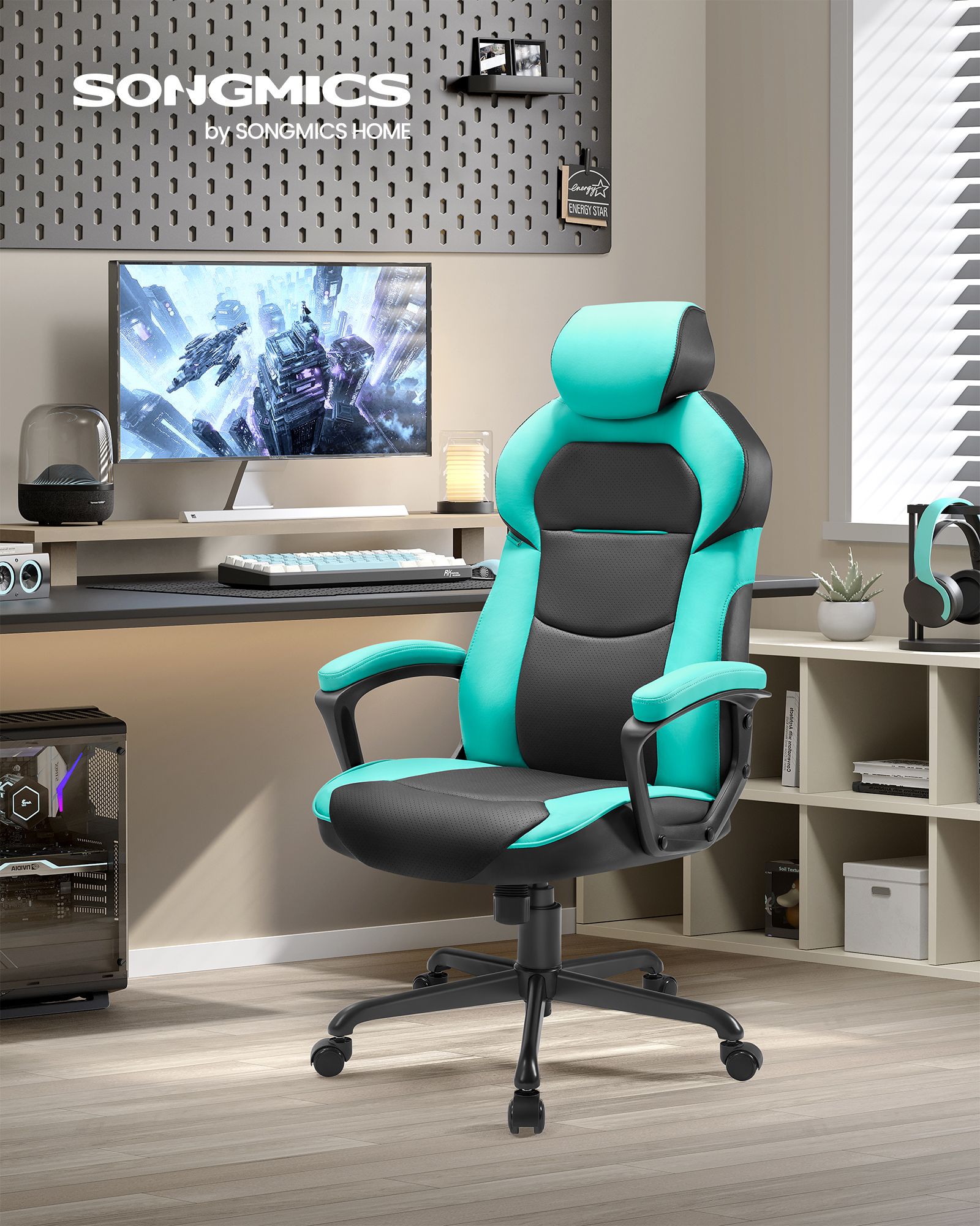 SONGMICS office chair, desk chair, computer chair, PU, cotton-linen blend fabric, adjustable headrest, padded armrests, rocking function, load capacity up to 150 kg, classic black OBG066B01