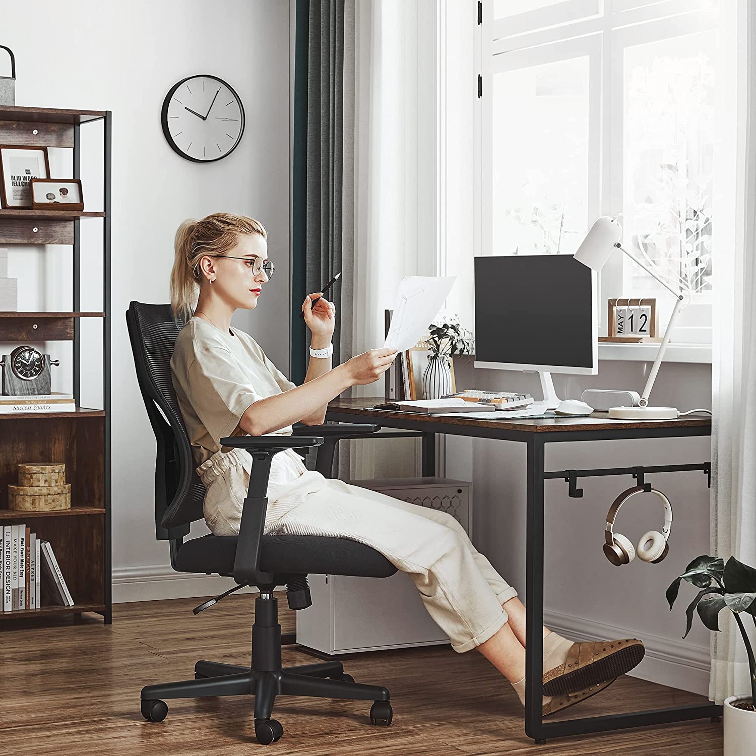 Ergonomic design The wide backrest with adjustable lumbar support is designed for different people and sitting positions. The curved backrest relieves pressure on your back and prevents muscle fatigue. If you work at a desk for long periods of time every day, this chair allows you to relax your arms and back. No more “sticking” It’s really hard to stay focused at work with a sweat-soaked seat during the summer days. With this SONGMICS office chair, you can say goodbye to “sticking” in the summer and continue to work productively. Comfortable and safe to use The seat height is adjustable to give you the perfect viewing angle. Tilt mechanism with adjustable knob so you can stretch/relax as you wish when leaning back against the backrest. The gas spring complies with the requirements of DIN 4550:2004-12, Class 3 and SDHL1604005156FT-01 (report owner: supplier), thus ensuring high stability and a long service life. Don’t hesitate to take this SONGMICS office chair home or to the office; it will suit you well! Product details:- Material:- Base: nylon- Armrests: PP plastic- Backrest: PP, polyester mesh- Seat: wooden board, foam, polyester fabric- Casters: nylon- Gas lift: Steel- Mechanism base plate: Steel- Product size:- Height: 110.5-112.5 cm- Seat height: 45-57 cm- Seat width: 53 cm- Seat depth: 52 cm- Armrest height: 17-26 cm- Backrest height: 60 cm- Base Ø: 64 cm- Product weight:- Net weight: 13.7 kg – Maximum load capacity: 120 kg Scope of delivery: – 1 x office chair – 1 x Allen key – 1 x accessory bag – 1 x instructions (DE, EN, FR, ES, IT)
