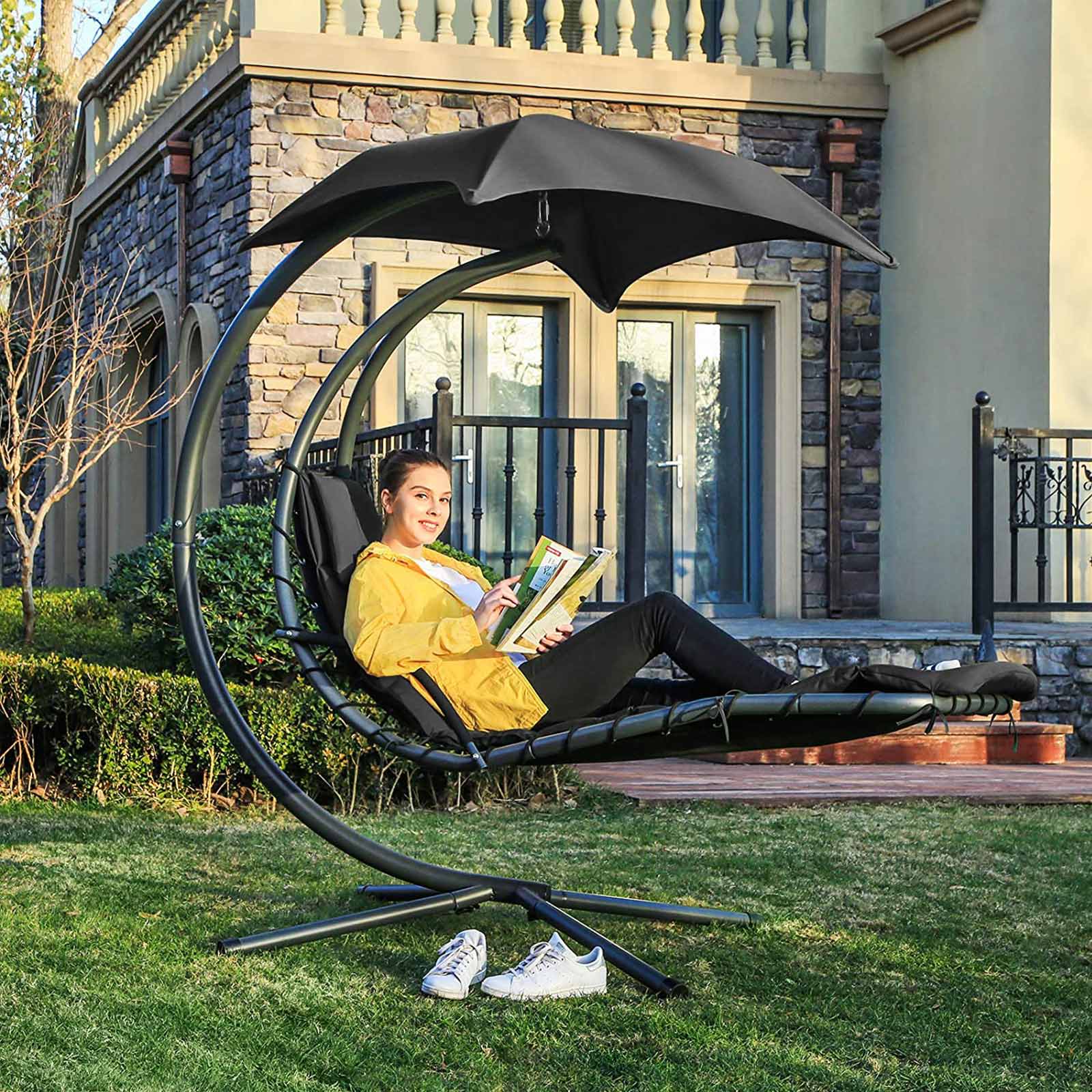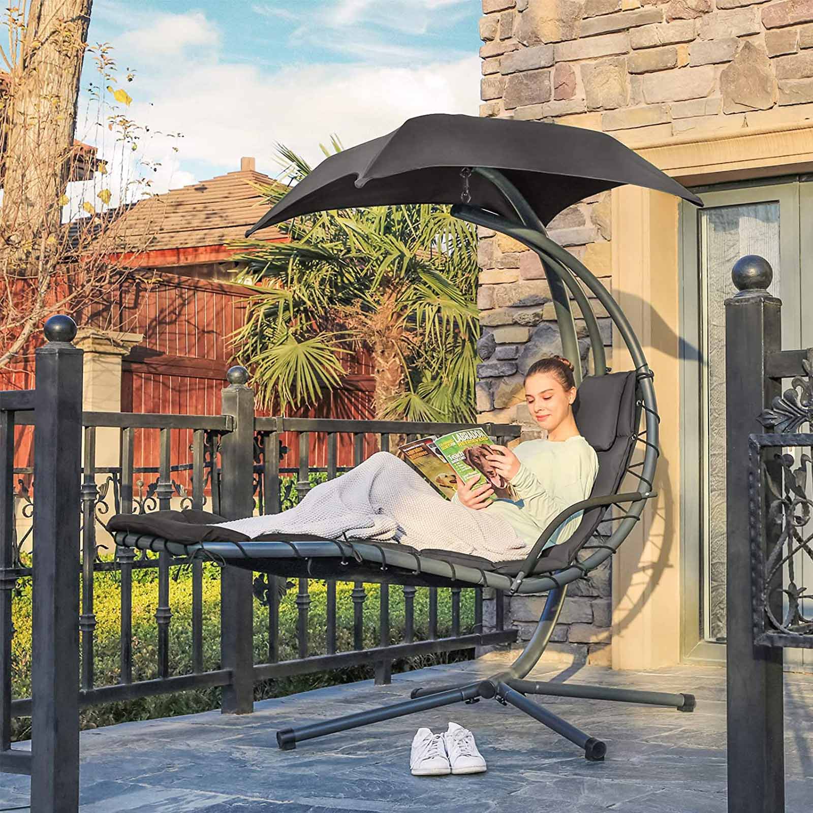 Discover your inner sloth: the sun is setting, birds are chirping in your garden, you are relaxing on this ergonomically shaped hanging lounger, snuggling up on the thick cushion with pillow, and feeling completely calm and relaxed. What a wonderful evening! Enjoy the summer without sunburn: thanks to the integrated parasol, the lounger provides plenty of shade. However, if the sun is not too strong and you would like to start the summer with a light tan, you can easily remove the sun canopy. Product details: Color: Black Material: Synthetic fiber, iron, polyester, PP plastic filling (polypropylene) Size: 185 x 108 x 195 cm (L x W x H) Weight: 38 kg Max. static load capacity: 150 kg Scope of delivery: 1 x hanging lounger with frame and cushion 1 x instructions (DE, EN, FR, IT, ES) SONGMICS notes: Keep this product away from rain.The maximum static load capacity of this product is 150 kg. Please do not exceed this maximum weight. Always check the stability of the hanging lounger before use. Children may only use this product under adult supervision. This product is delivered in 2 packages. Normally, these will arrive at the same time. However, if you only receive one package at first, please be patient. The second delivery will usually follow shortly thereafter.