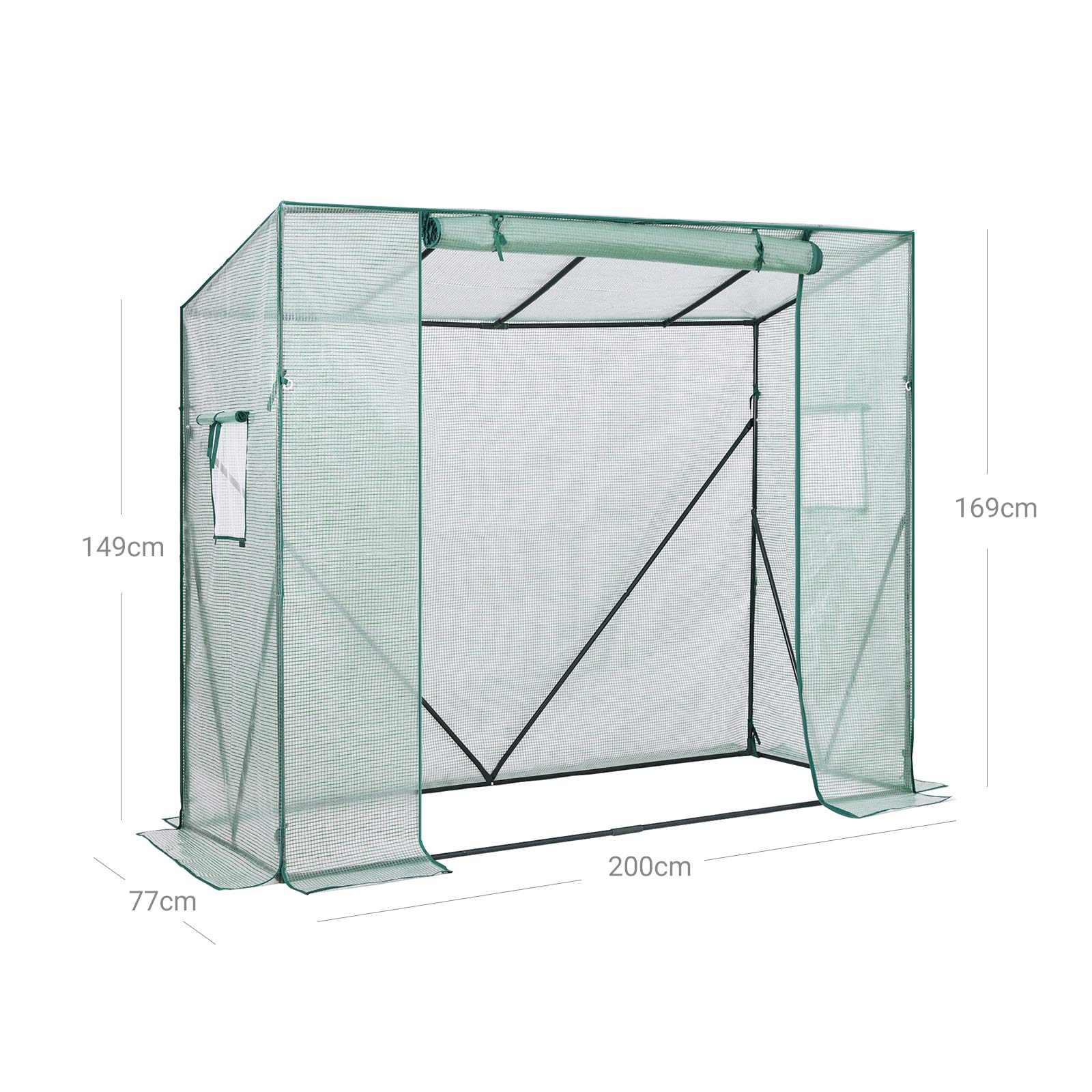 Creating your own garden – Here’s how If the weather is not very kind to your plants, insects and birds are on the hunt for green treats, or you haven’t quite got the hang of gardening yet, get this garden shed from SONGMICS for your home! It protects delicate plants, flowers, or vegetables from wind, rain, ground frost, insects, and even cats and dogs. Sunshine, moisture, warmth A sturdy greenhouse is an excellent gardener that takes great care of your plants. The transparent film not only allows sufficient sunlight to pass through, but also stores moisture and warmth. However, if it gets too hot in this garden shed, you can simply open the zipper on the large door and roll it up, or roll up the windows. This ensures ideal air circulation. Product details: Color: Green Material: Powder-coated steel tubes, 140g/m² PE Size: 200 x 77 x 149/169 cm (L x W x H) Weight: 10.5 kg Scope of delivery: 1 x greenhouse 4 x pegs 4 x U-shaped ground hooks 1 x instructions (DE, EN, FR, ES, IT) SONGMICS notes: Please do not use a high-pressure cleaner to clean the greenhouse. Please use a damp cloth or brush for this purpose.