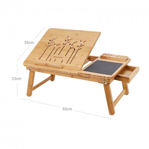 Would you like to surf the internet or watch a movie on your laptop from your bed or sofa? Then the Songmics laptop table is just right for you! With its well-thought-out design, the foldable laptop table is perfect for storing your laptop, tablet, or books in a practical and stylish way! When not in use, it can be folded up and stored away to save space. With the Songmics laptop table, you can relax and work or even have breakfast! Product details: – Color: Natural – Material: Bamboo – Load capacity: 10 kg – Weight: 3.06 kg – Table top dimensions: 36.5 x 35 cm (L x W) – Mouse pad dimensions: 15.5 x 20 cm (L x W) – Dimensions when unfolded: 55 x 23 x 35 cm (W x H x D) – Dimensions when folded: 52.5 x 5 x 35 cm (W x H x D) – Packaging dimensions: 59 x 40 x 6 cm Scope of delivery – 1 x laptop table – 1 x instructions (DE, EN, IT, FR, ES) – 1 x bag of fittings Notes: Natural bamboo products may have some dust on the surface. Please wipe it off with a damp cloth before use.