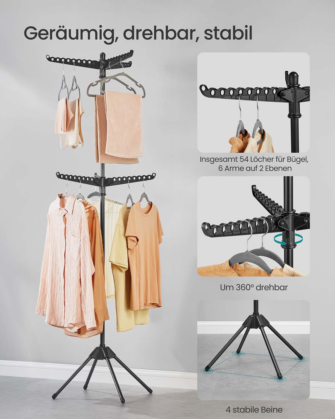 SONGMICS clothes horse, standing dryer, 3 rotating arms for hangers, rotary clothes dryer, 4 legs, for indoor use, stainless steel, for up to 27 items of clothing, 150 cm high