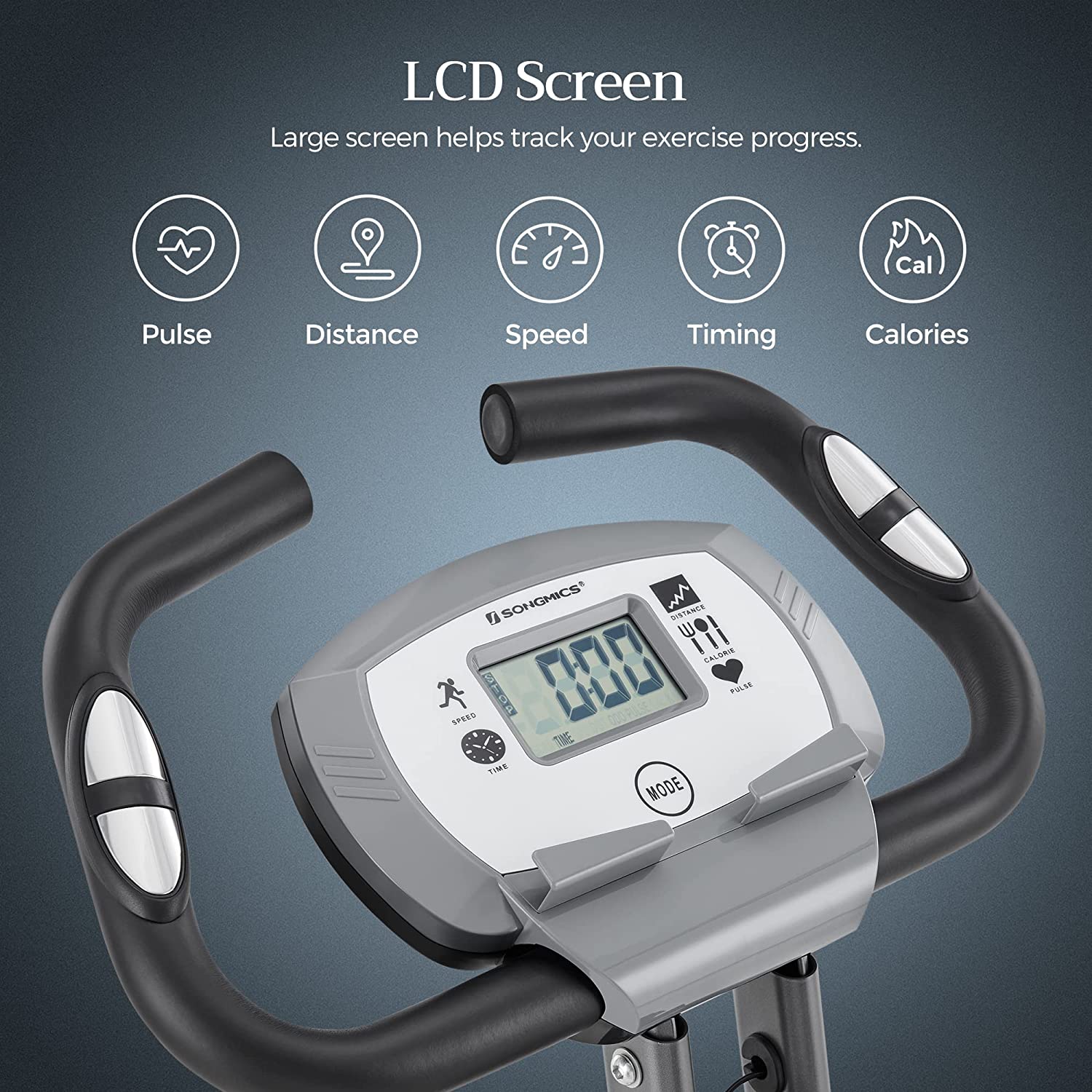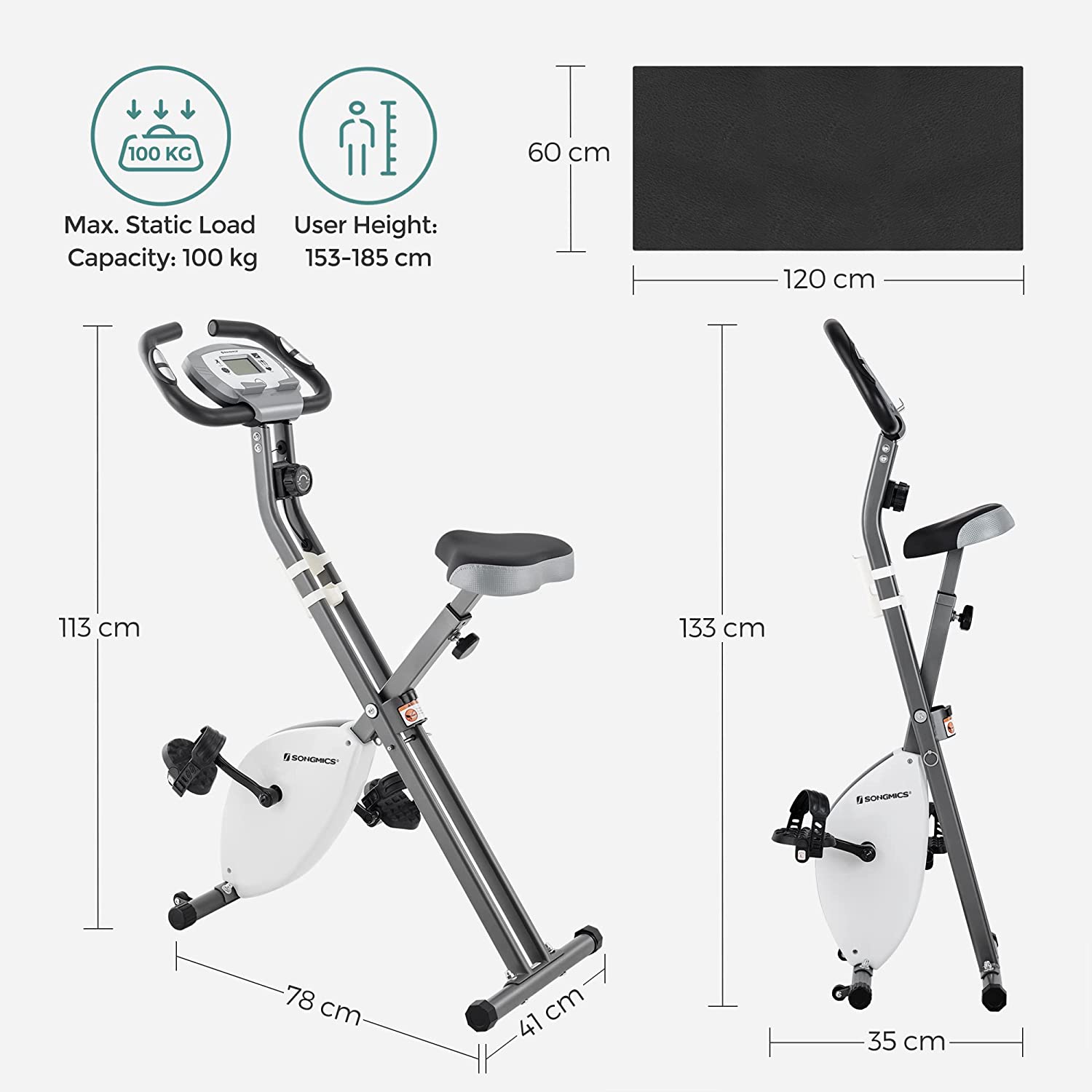 Training for and with your heart: With the help of this cardio trainer from SONGMICS, you can strengthen your circulation, engage in effective muscle and endurance training, reduce stress, and promote healthy digestion. Thanks to this exercise bike, you no longer have to run through the park in the freezing cold or strain your knees on treadmills. Stick with this fitness bike and get an effective cardio workout from the comfort of your own home. Train in ultimate comfort: this foldable exercise bike from SONGMICS is suitable for people weighing up to 100 kg and is equipped with a comfortable, wide, and adjustable saddle. This allows you to burn calories without feeling uncomfortable. Keep an eye on important details: the large display shows you how far you have already traveled, how fast you are going, how many calories you have burned, and what your heart rate is. Simply grip the handlebars with built-in pulse sensors to monitor your heart rate during your workout. Product details: Color: White Material: Steel, plastic Display information: Pulse, speed, duration, distance covered, odometer, calories burned Resistance: 8 magnetic resistance settings Size: 78 x 41 x 113 cm (L x W x H) Size when folded: 35 x 41 x 133 cm (L x W x H) Weight: 15 kg Max. user weight: 100 kg Max. user height: 1.85 m Height of adjustable saddle: 73 – 86 cm Floor mat dimensions: 120 x 60 x 0.4 cm (L x W x H) Floor mat material: PVC Scope of delivery: 1 x exercise bike 1 x floor mat 2 x batteries 1 x accessory pack 1 x instructions SONGMICS Notes: Safety and health information! People with cardiovascular problems and/or stroke patients should not use this product. This product is not suitable for children. Please stretch before exercising on this bike. Please store the product in an upright position. Do not lay it on the floor. Please only use the product on a dry and level surface.