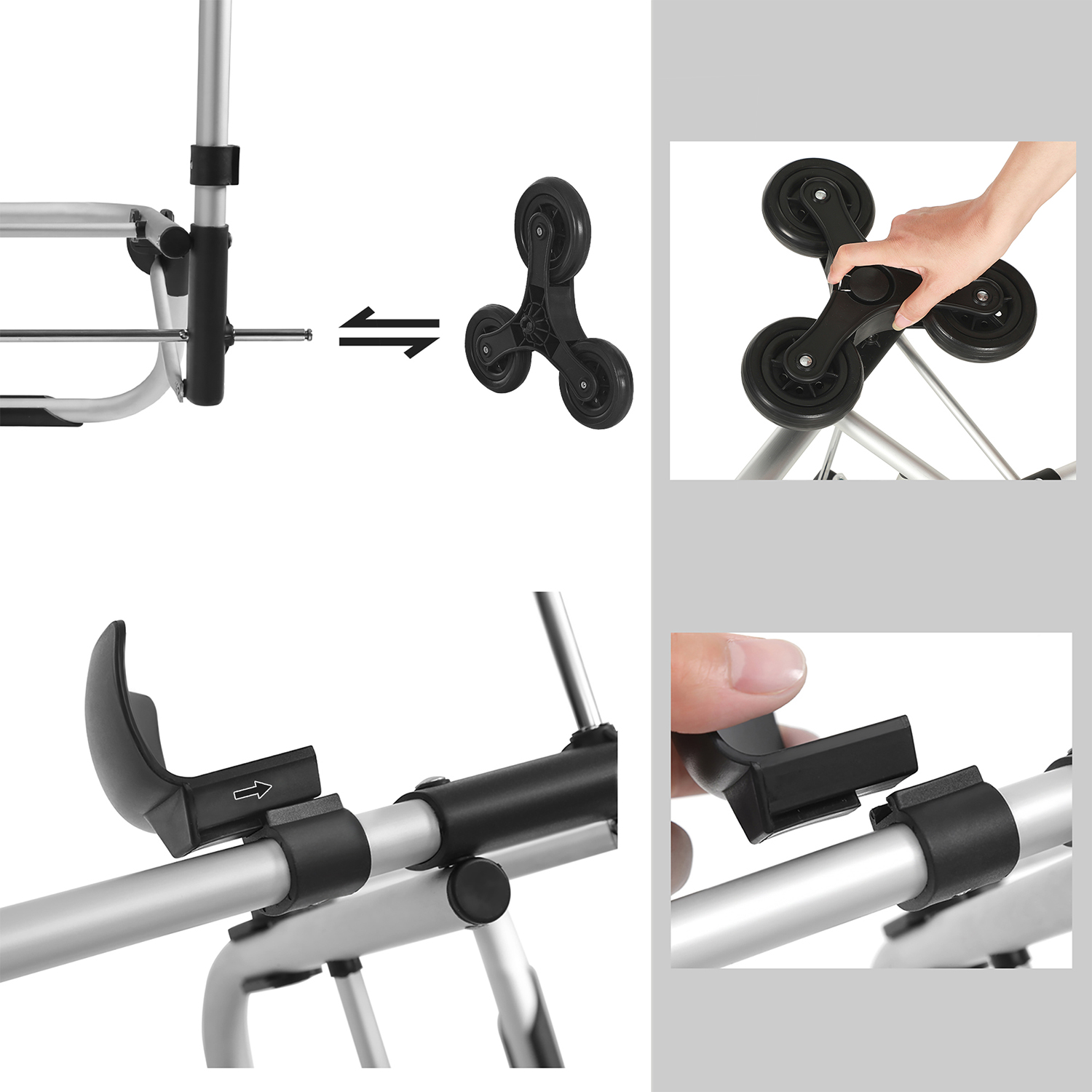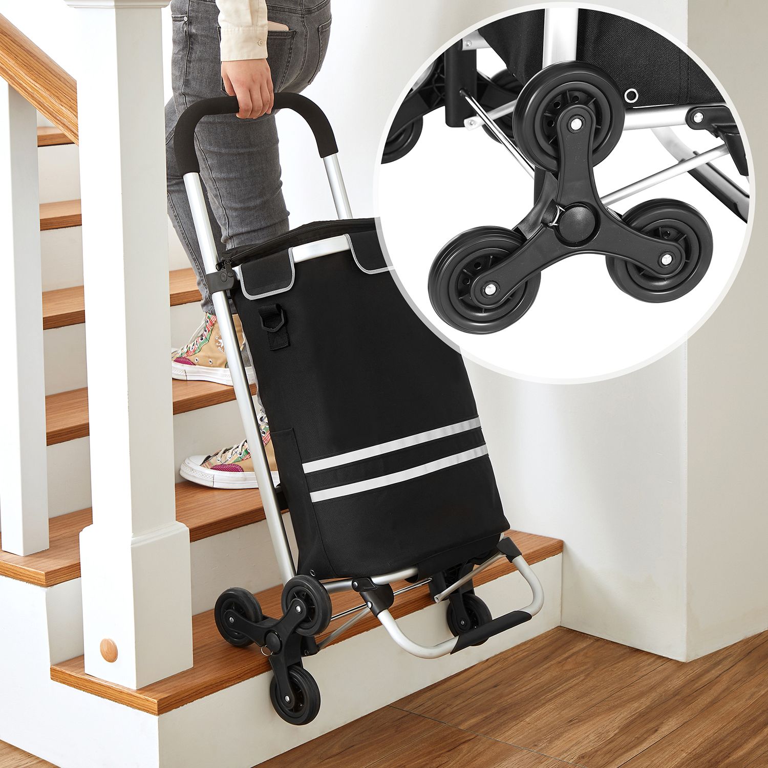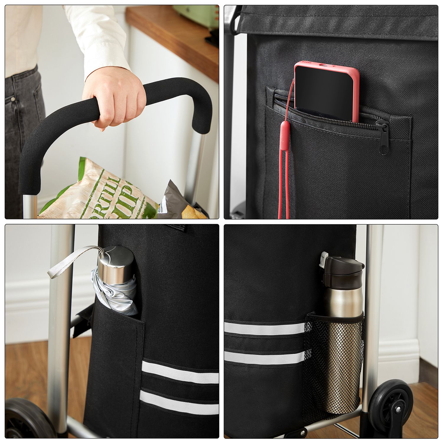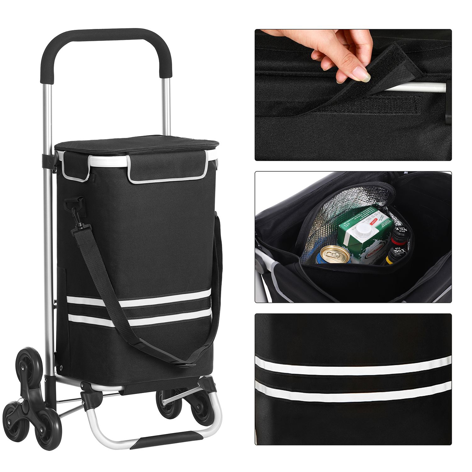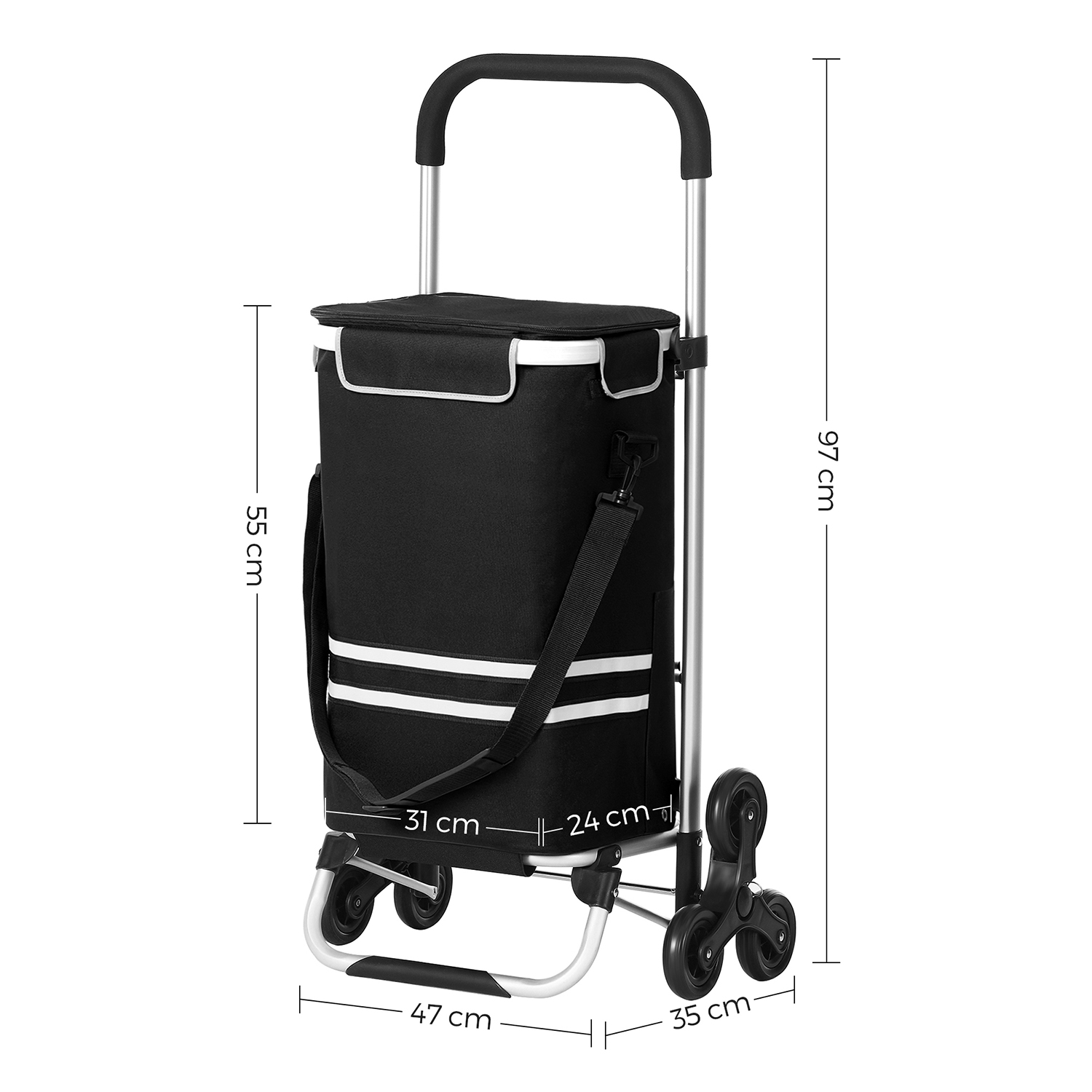 No car, no helper, and no elevator… Has your once enjoyable shopping trip become a tedious chore? Then it’s time for this shopping trolley! Why should you choose this shopping trolley? – The wheels with their 3-in-1 design make it easy to climb stairs – Thanks to the lightweight aluminum alloy frame, the shopping trolley can be moved effortlessly – The spacious 35L bag makes this shopping trolley perfect for weekly shopping- A cooling compartment keeps your chilled food or beer cool. – You can also use the removable bag separately with a shoulder strap. – It only takes a few minutes to assemble the shopping cart. – The frame is foldable and easy to store. Product details:- Color: Black – Material: Polyester, aluminum alloy, EVA foam wheels – Size: 47 x 35 x 97 cm (L x W x H) – Weight: 2.2 kg – Max. static load capacity: 20 kg Scope of delivery: – 1 x shopping trolley – 1 x shoulder strap – 1 x instructions