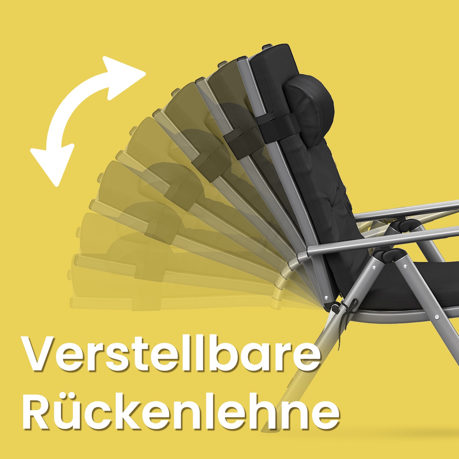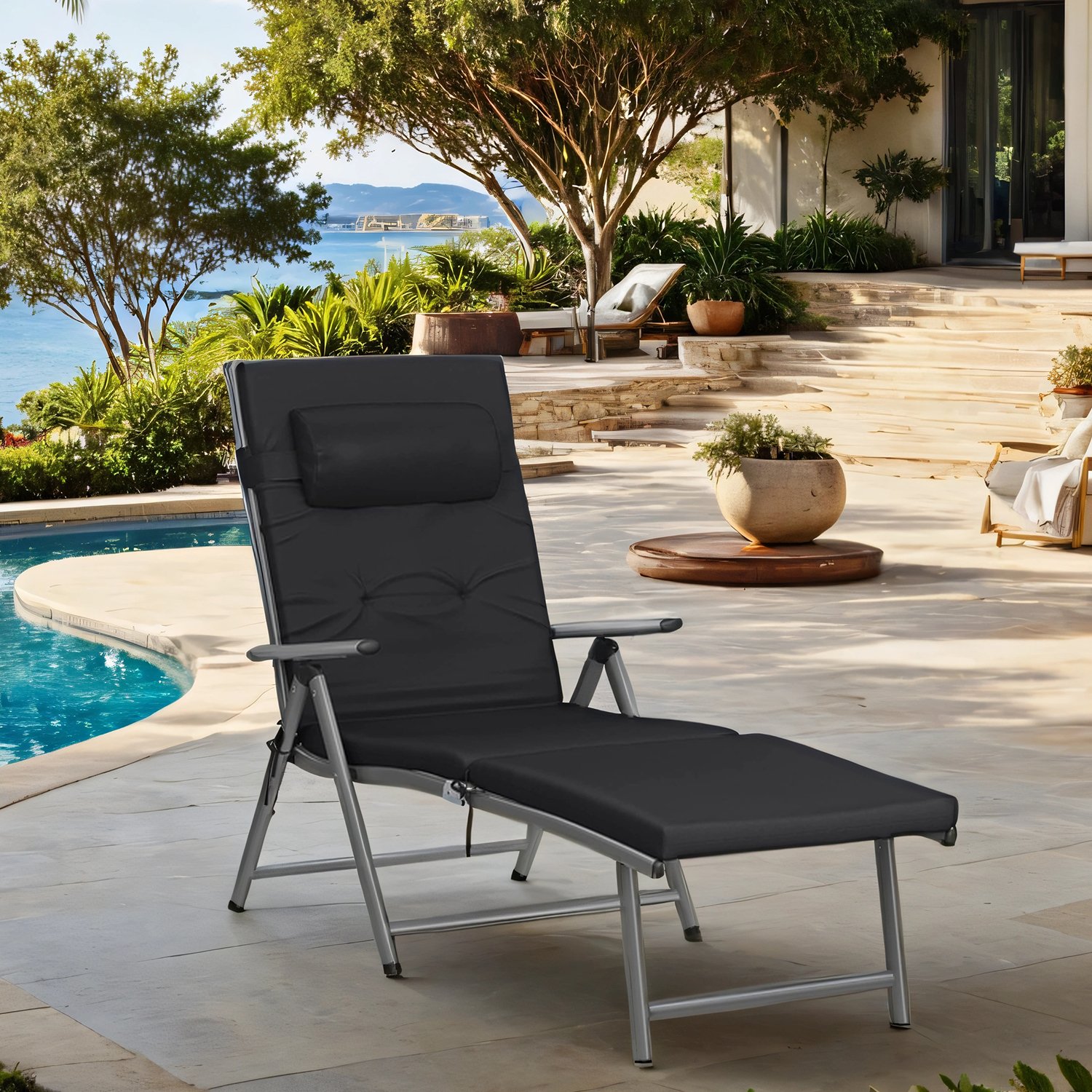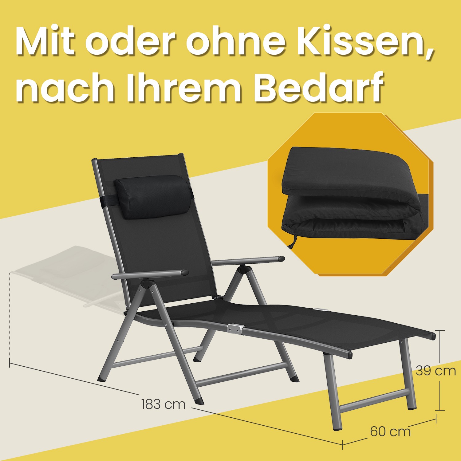 SONGMICS has developed a range of outdoor chairs to increase your comfort when relaxing on the beach, at the campsite, or in the garden. Enjoy your vacation! Fits anywhere Want to relax in the garden on a beautiful summer day? This sun lounger is the perfect solution! You can also set it up under a parasol on the terrace or at the beach to spend a whole day by the sea with your family or friends! Comfortable and practical This folding sun lounger ensures a high level of comfort thanks to the soft 6 cm thick mattress, which is secured to the sun lounger with several straps. Furthermore, the lying surface is made of breathable synthetic fiber fabric. In addition, you can adjust the backrest individually and remove the headrest as needed. Enjoy the peace and quiet of your garden on this sun lounger! If you are a nature lover, take a look at the other outdoor chairs from SONGMICS! Product details:- Color: Black – Material: Synthetic fiber fabric, aluminum frame, foam – Dimensions: 183 x 60 x 39 cm (L x W x H) – Weight: 8 kg – Max. load capacity: 150 kg Scope of delivery: – 1 x folding sun lounger – 1 x mattress
