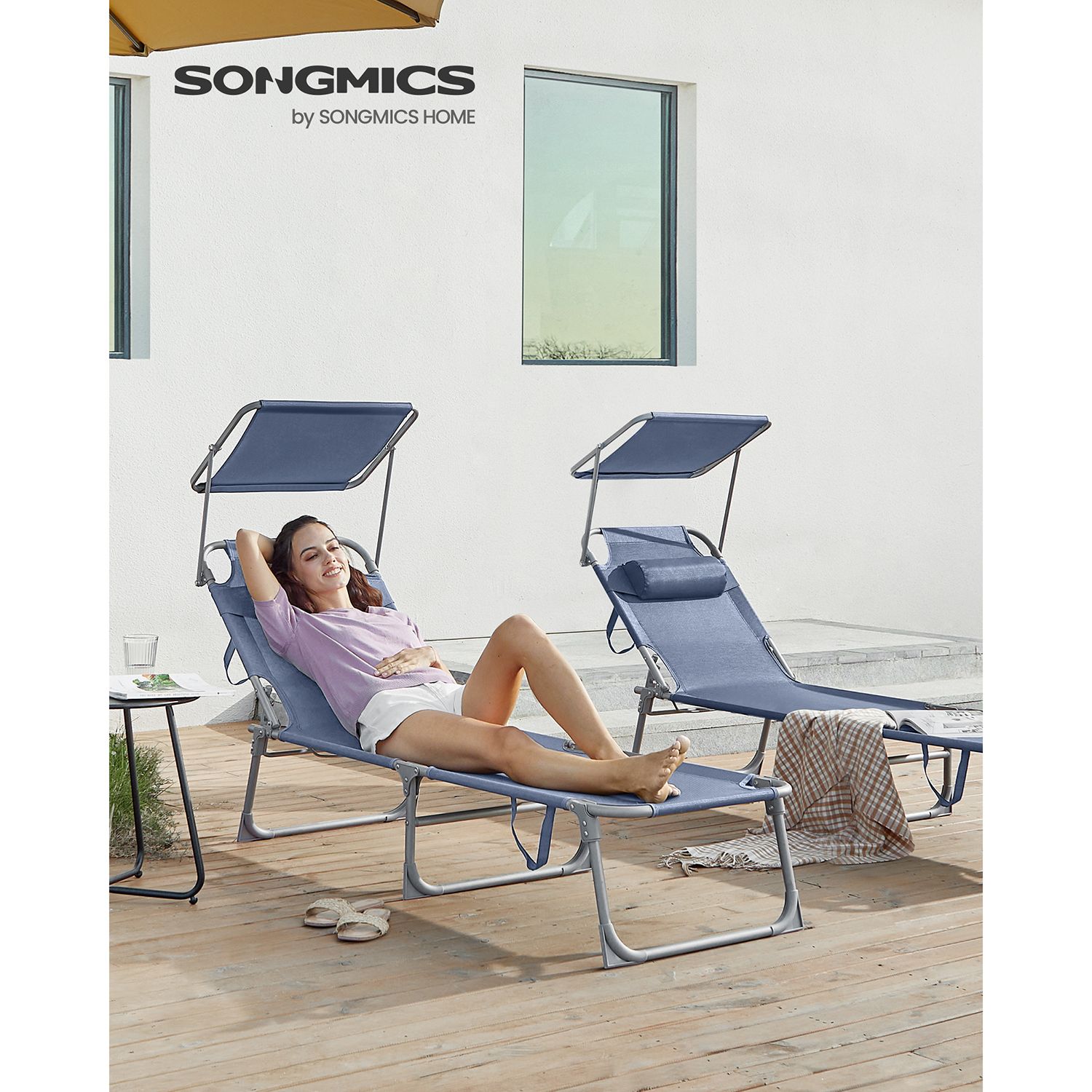 SONGMICS sun lounger, deck chair, garden lounger, with headrest and sun canopy, adjustable backrest, lightweight, foldable, 53 x 193 x 29.5 cm, load capacity up to 150 kg, garden, balcony, black GCB192B01