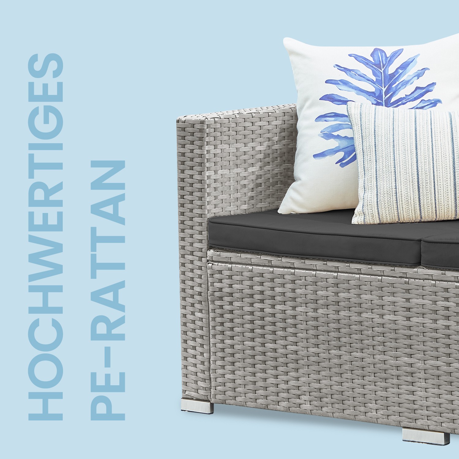 – Material of sofa and table: PE poly rattan (polyethylene), powder-coated steel, tempered glass