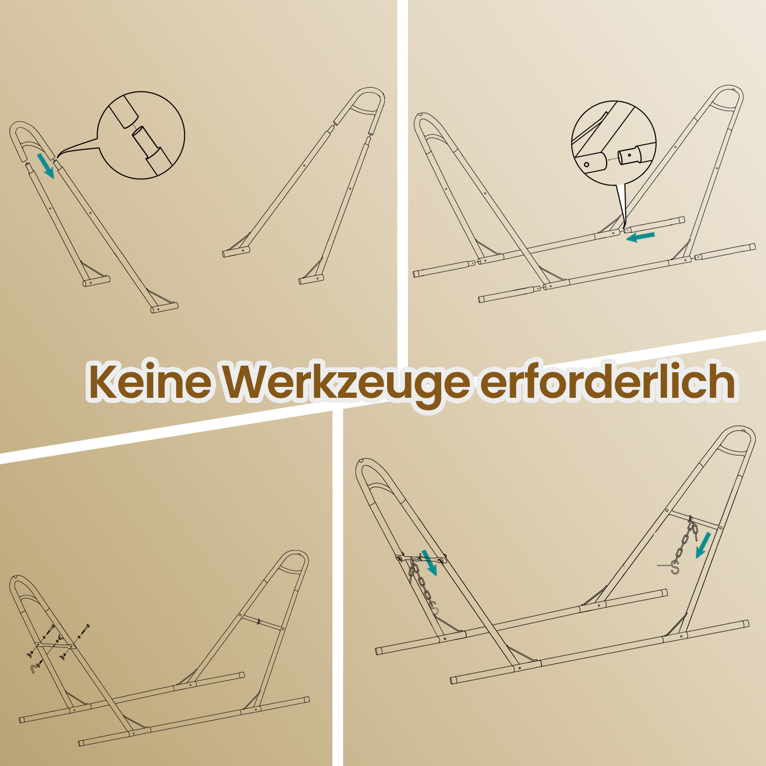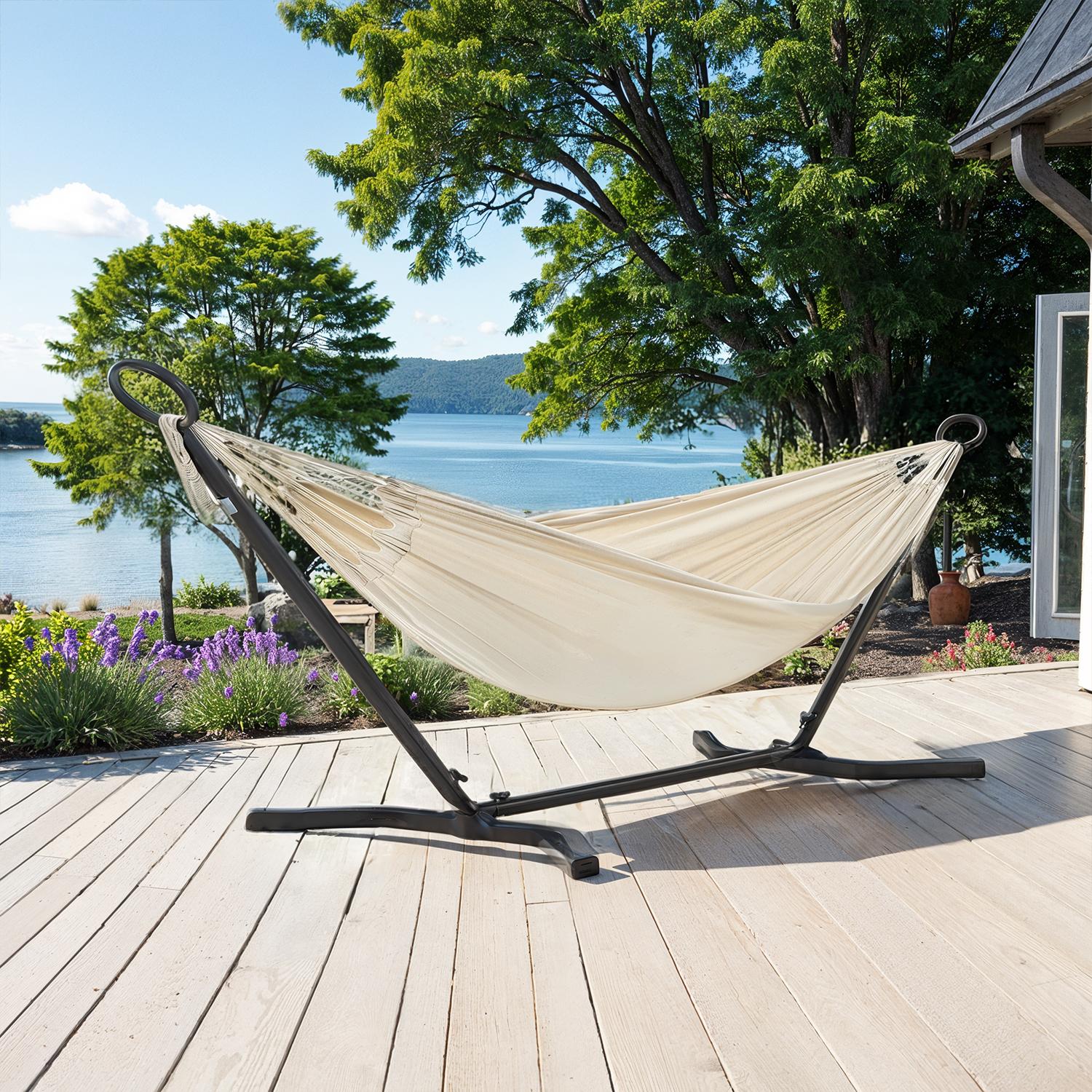 Save yourself the trouble: Are you still looking for two suitable trees to attach the hammock to? Or are you even planning to plant two trees in your garden? Stop! This hammock comes with a stand. All you need to do is take a few minutes to set up this hammock set, and your garden will be transformed into a retreat in no time. Our keyword – comfort! The hammock is made of cotton-polyester fabric and is breathable and comfortable. The frame is sturdy and reliable and made of robust metal. Lie in the hammock and feel relaxed and happy – what a comfortable life! Product details: Color: Black frame, beige hammock Material: Metal, cotton, polyester Frame size: 300 x 90 x 95 cm (L x W x H) Hammock size: 210 x 150 cm (L x W) Weight: 13 kg Max. static load capacity: 240 kg Scope of delivery: 1 x hammock stand 1 x hammock 1 x instructions SONGMICS Notes: The maximum static load capacity of this product is 240 kg. Please do not exceed this maximum weight. Please do not expose the product to direct sunlight for long periods of time. Please always check the stability of the hammock before lying down in it.