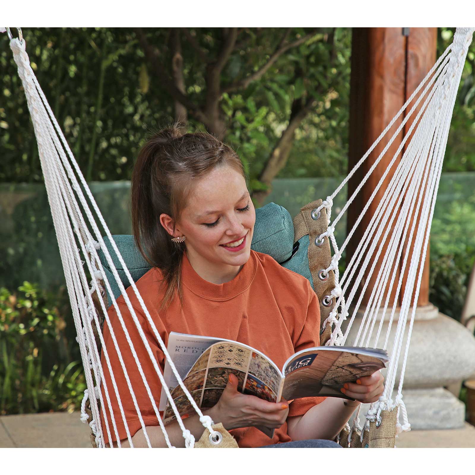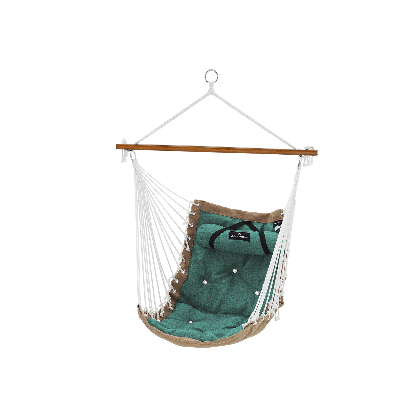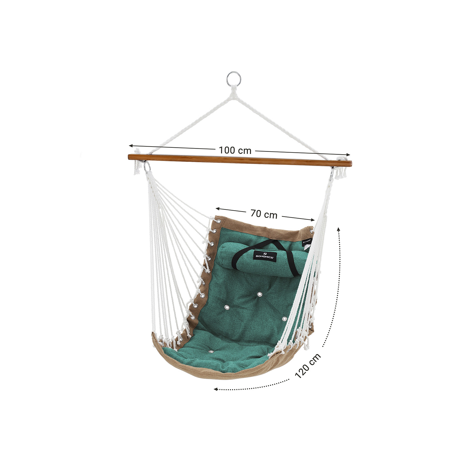Indoor or outdoor Hang this chair in the garden or on the terrace and create your own retreat. Here you can read books or take a nap on a cozy afternoon. Or create an oasis of calm in your bedroom or living room with this hanging chair. Whether it’s hot or cold outside, you can curl up in it like a cat, listen to music or watch a movie and let go of the stress of everyday life. Everyone deserves to relax after a long day. We should share beautiful things with our family or friends. However, if this hanging chair is so comfortable that you want to use it yourself, you might want to order two! Hang them side by side so you can sit together with your friends and chat comfortably while enjoying the beauty of nature in your garden. Product details: – Color: Green-khaki – Material: Imitation linen, polyester filling, bamboo – Seat dimensions: 70 x 60 cm (L x W) – Backrest dimensions: 70 x 60 cm (L x W) – Weight: 2.5 kg – Max. static load capacity: 200 kg Scope of delivery: – 1 x hanging chair – 1 x cushion – 1 x instructions (DE, EN, FR, ES, IT) SONGMICS notes: – Children may only use the hanging chair under adult supervision.- As the color of the product may vary on different monitors, there may be color deviations. – The dimensions we have provided have been determined by manual measurement, so the product may vary by up to 5 cm.