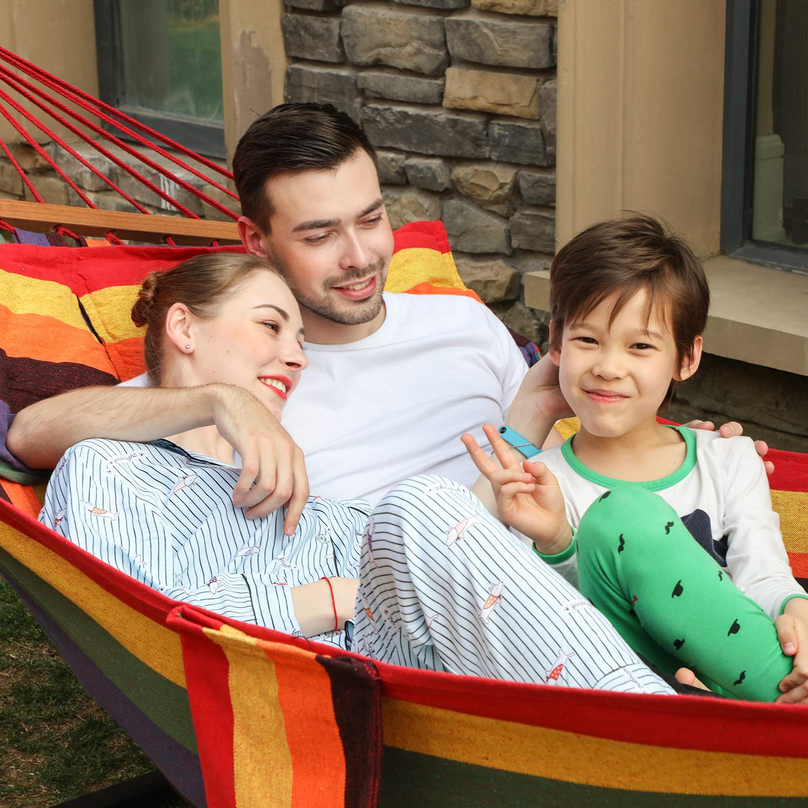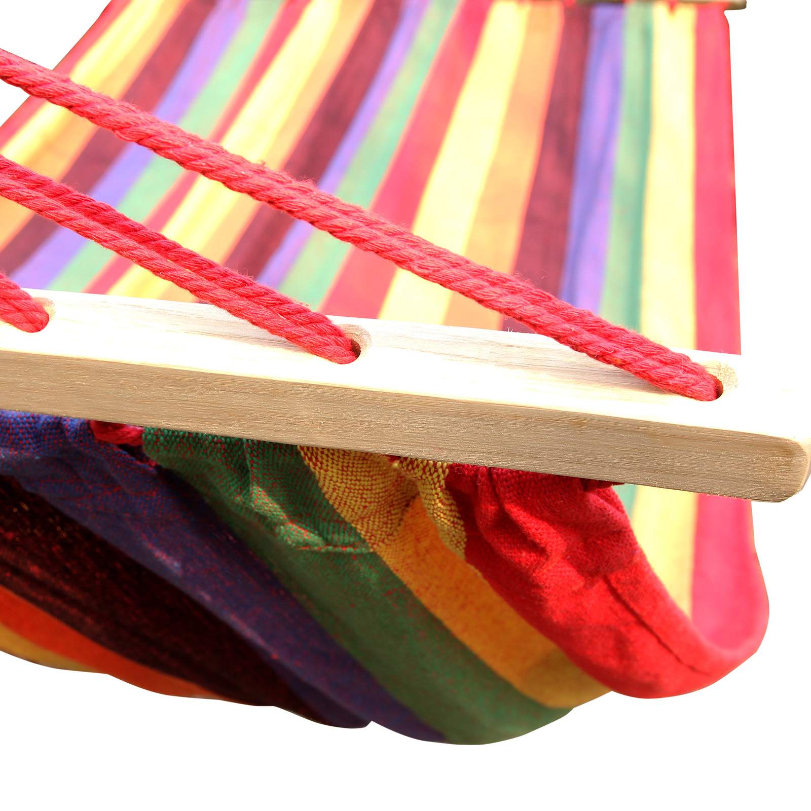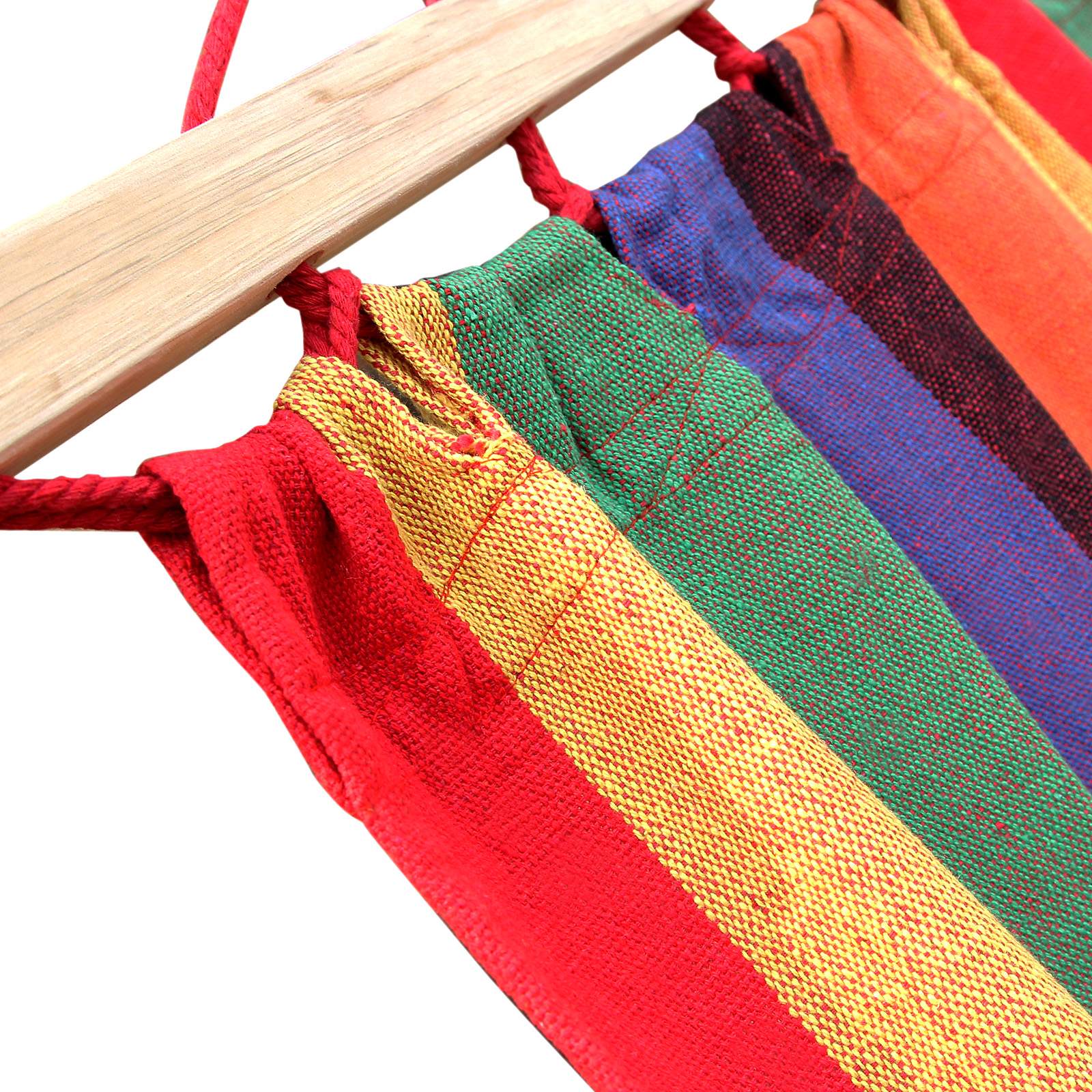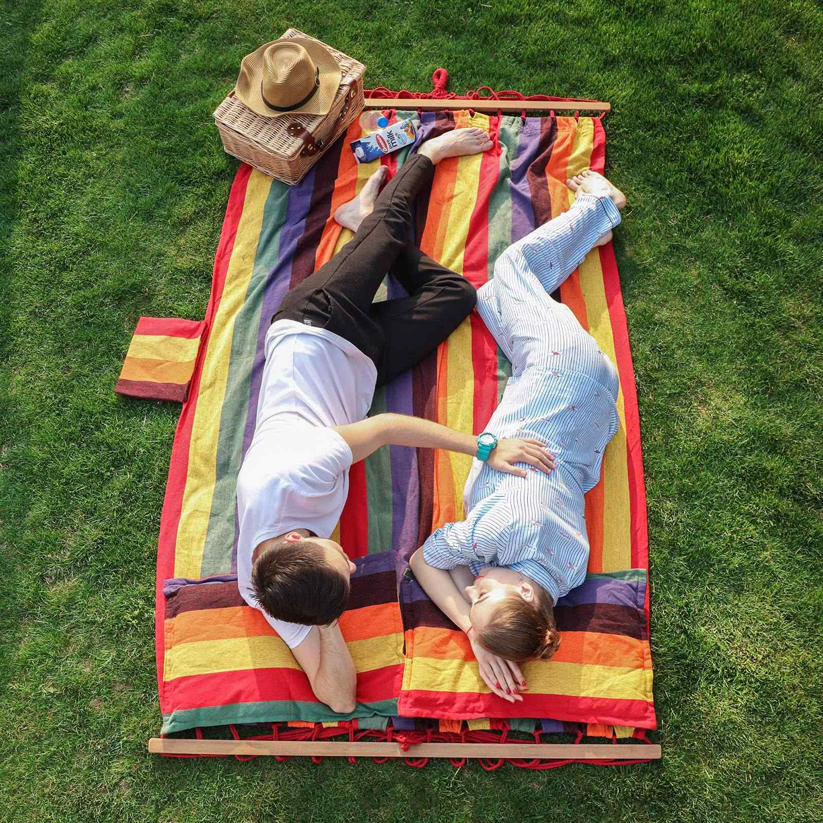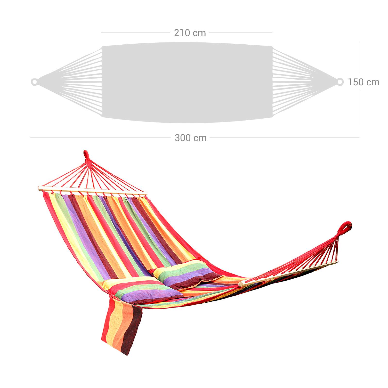 A perfect place to sit or lie down, indoors or outdoors, for young and old alike. What could be better than throwing yourself into the SONGMICS hammock after a hard day and letting your mind wander? The relaxing, soothing rocking motion will improve your physical and mental well-being and help you forget your everyday worries. The hammock is also an absolute eye-catcher. With its fresh, cheerful colors and a huge, cozy fabric surface, you’ll feel like you’re in a colorful oasis of calm, whether you use the hammock in the garden, while camping, or on the balcony. However, our product not only offers exceptional comfort, but is also ultra-light, durable, and stable. The rod hammock is versatile and can be used, for example, as a sofa, hanging chair, or even as a cradle for your baby. If necessary, you can also attach it to a hammock stand or hang it between two trees. Thanks to its low weight and compact dimensions, the hammock can also be taken anywhere. Product details: – Material: 70% cotton + 30% polyester, 320 g/m² – Lying surface: 210 x 150 cm – Total length: 300 cm – Pillow: 70 x 40 cm – Crossbar: 120 x 3.2 x 2.2 cm – Max. load capacity: 300 kg Scope of delivery: – 1 x hammock stand – 2 x pillows – 1 x transport bag