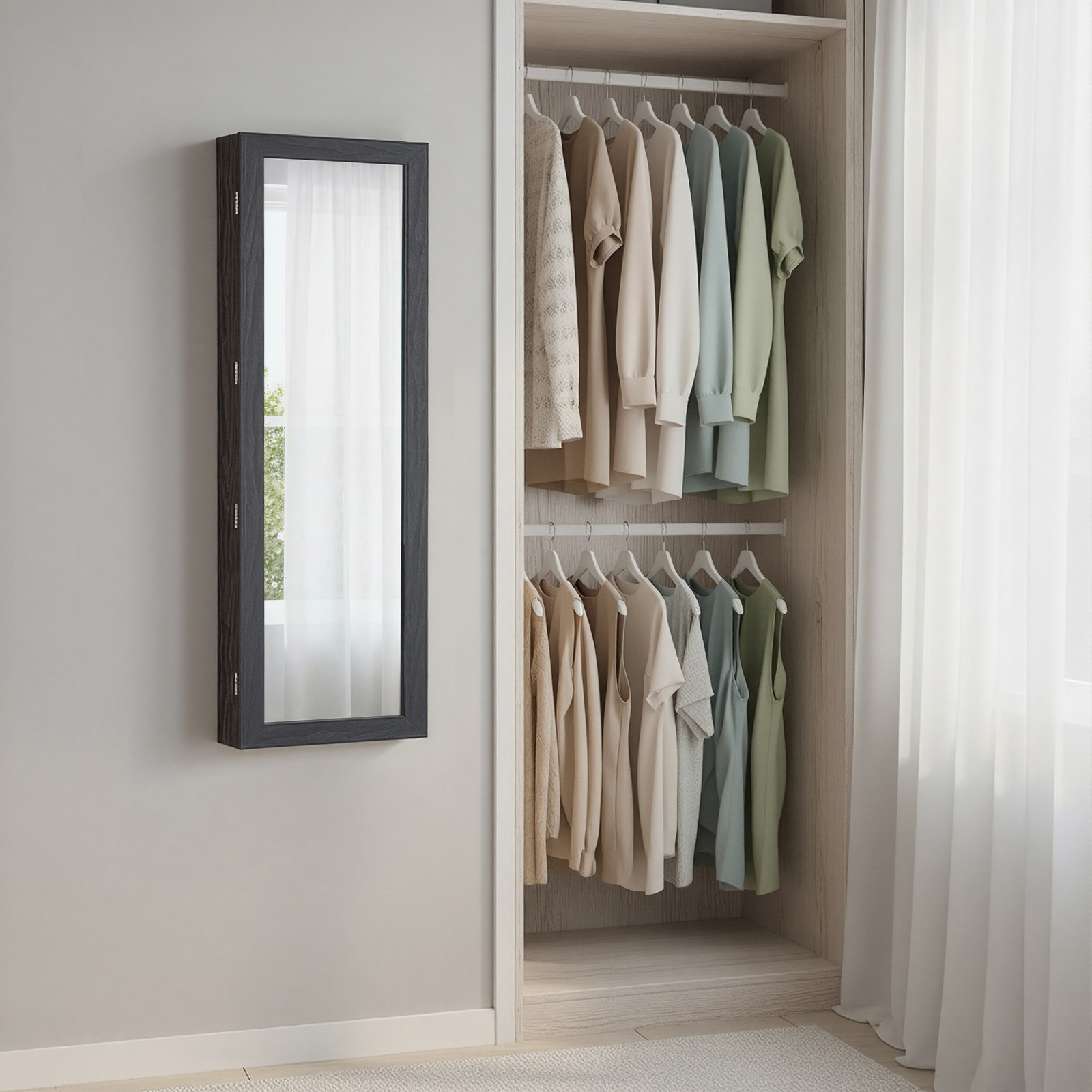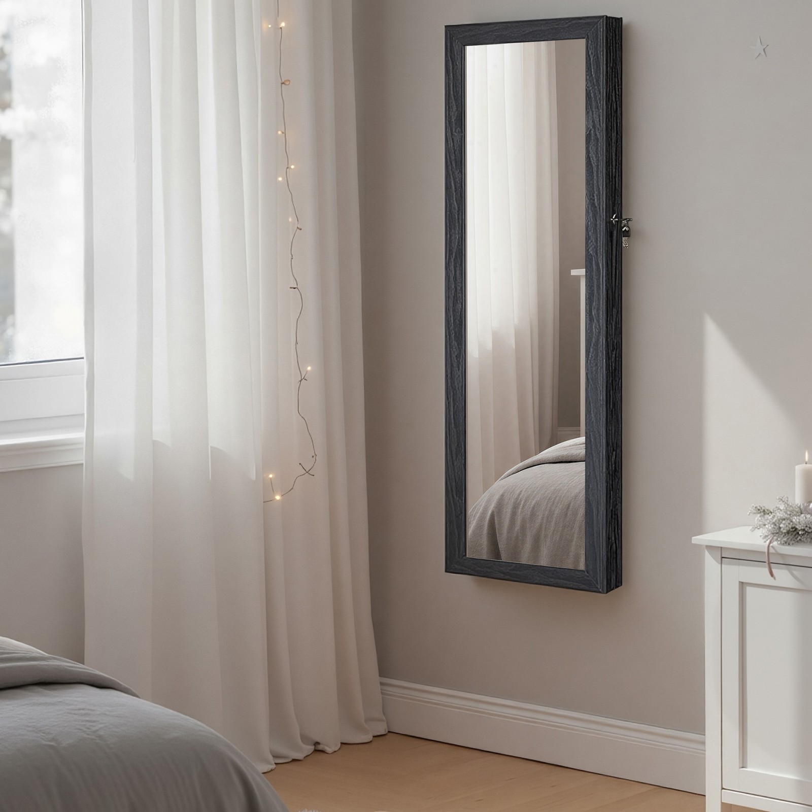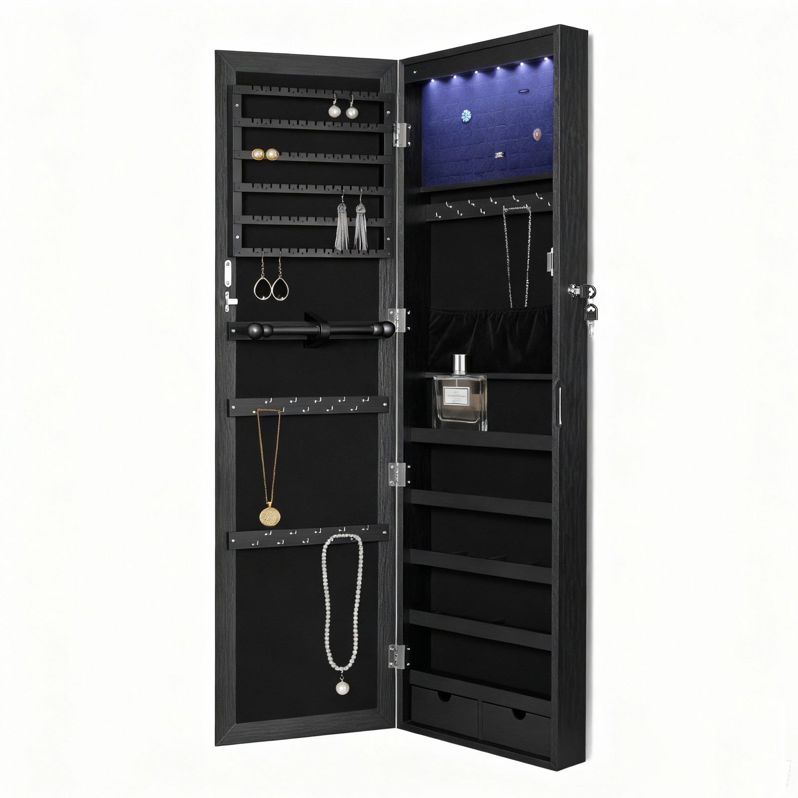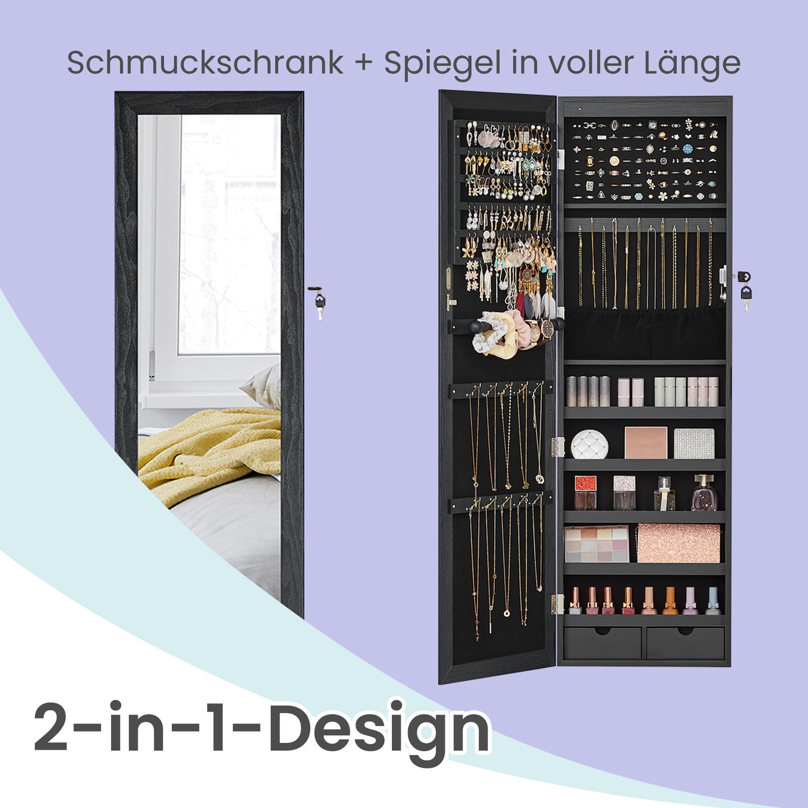 SONGMICS hanging jewelry cabinet, lockable mirror cabinet, wall cabinet with mirror and numerous compartments, wall mounting, hanging on the door, for chains, earrings, black JJC093B01