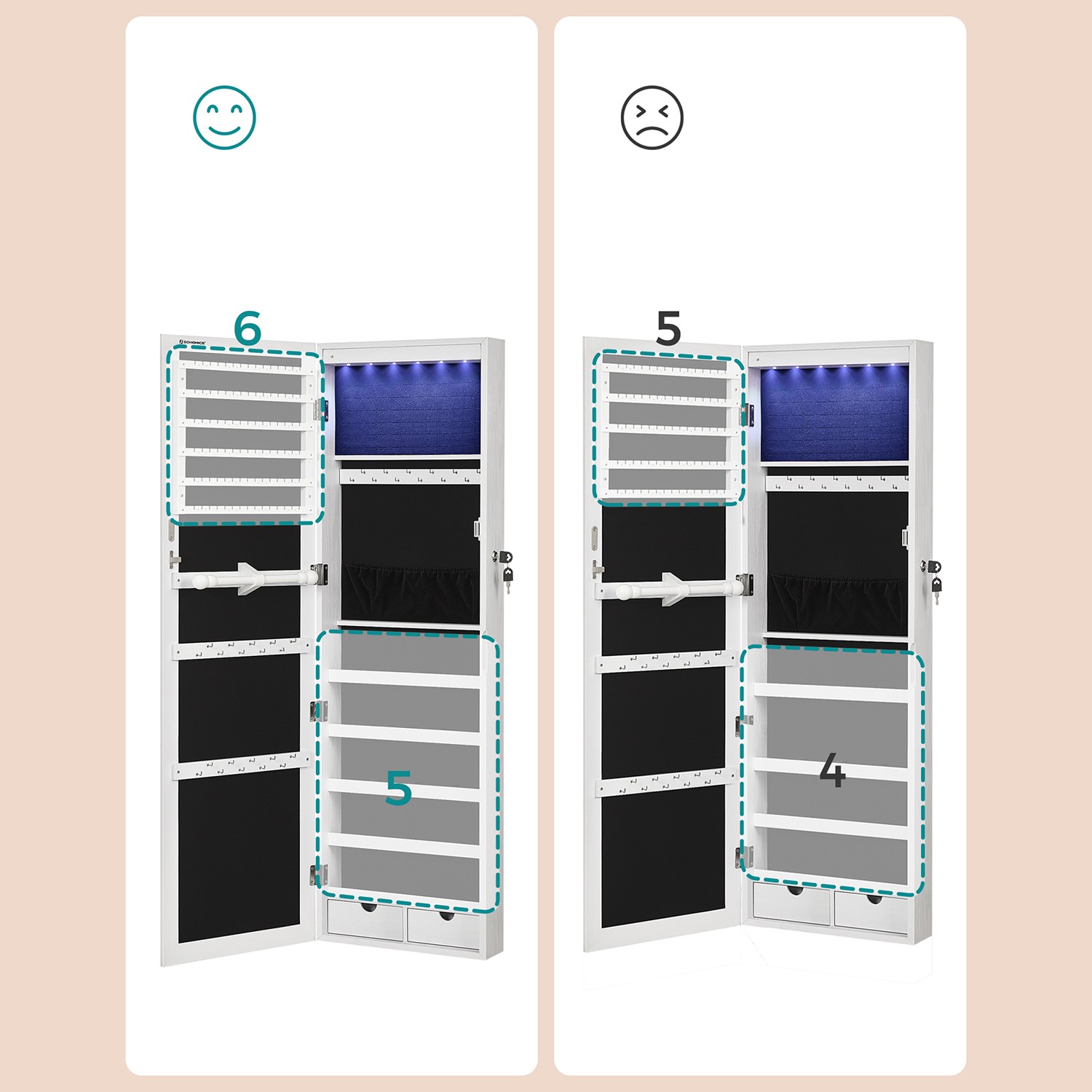 Your new red dress fits like a glove. Slip on your high heels and admire your outfit in the large mirror of this eye-catching jewelry cabinet, which can be hung on your bedroom door or attached to your wall. Wait! Something’s missing! Matching earrings and a sparkling necklace complete your look. Luckily, you don’t have to search long for the right jewelry, because it’s neatly arranged behind the door of the mirror cabinet. The included door hooks are only suitable for standard doors. For German doors, you will need to purchase the appropriate door hooks separately.Jewelry lovers can expect the following benefits: Wide mirror without a frame for a larger mirror surface Can be hung on the door frame or mounted on the wall 6 rows with 15 holders and 8 slots for earrings each (90 holders and 48 slots in total) 7 rows with 12 slots for rings each (84 in total) 32 hooks for chains, etc. 1 rod for scarves and shawls 5 shelves for perfume, nail polish, etc. 2 drawers LED interior lighting Lockable Product details: Color: White Material: MDF (medium-density fiberboard)Overall size: 37 x 9.3 x 108 cm (L x W x H) Weight: 9.1 kg Scope of delivery: 1 x hanging jewelry cabinet 1 x accessory pack 2 x standard door hooks 1 x instructions SONGMIX notes: Please keep children away from all accessories and packaging parts during assembly of this product. If swallowed or inhaled, they can cause life-threatening situations.