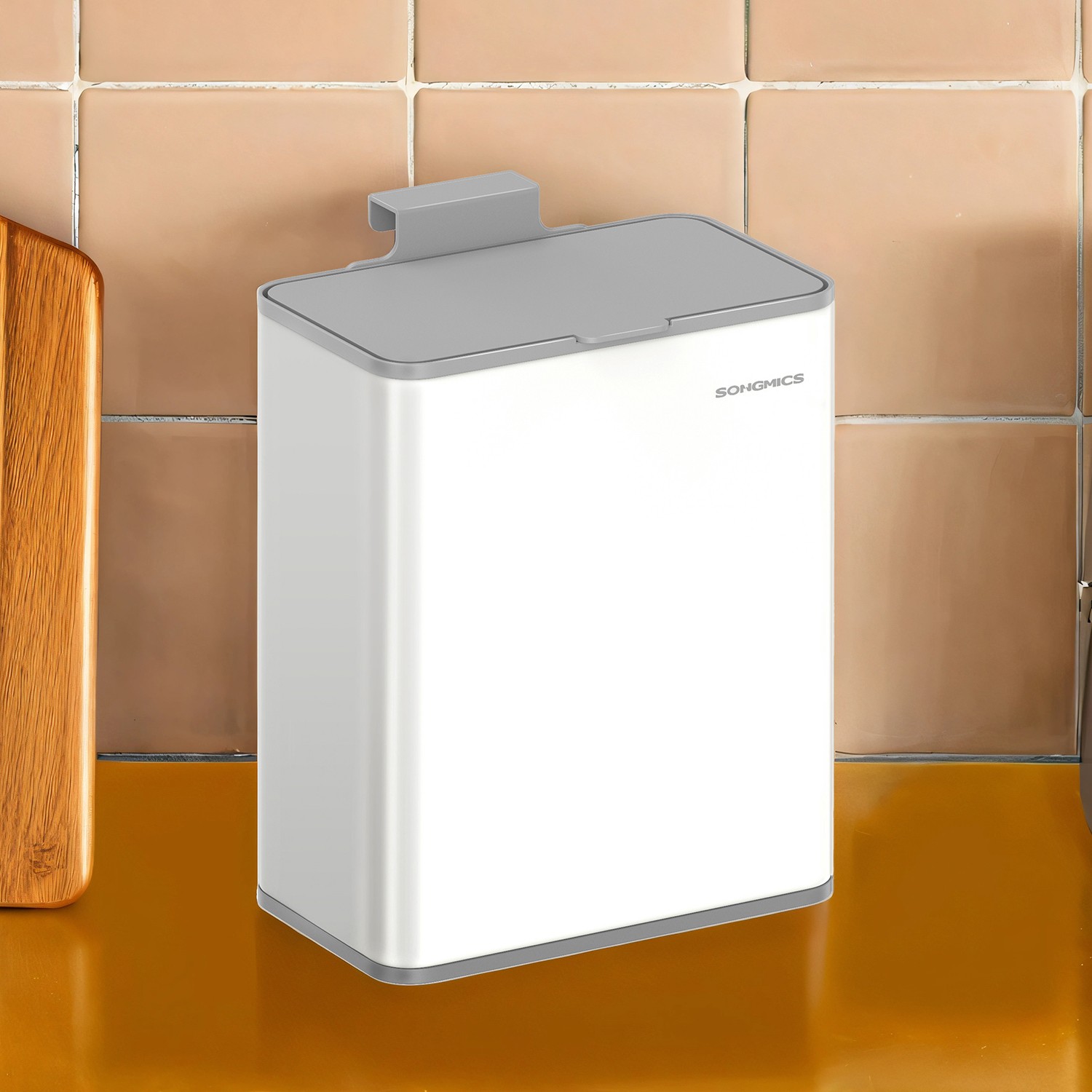 SONGMICS hanging trash can, 8 L compost bin for the kitchen, steel trash can with lid for organic waste, with hook, for cabinet door or wall, for bathroom base cabinet