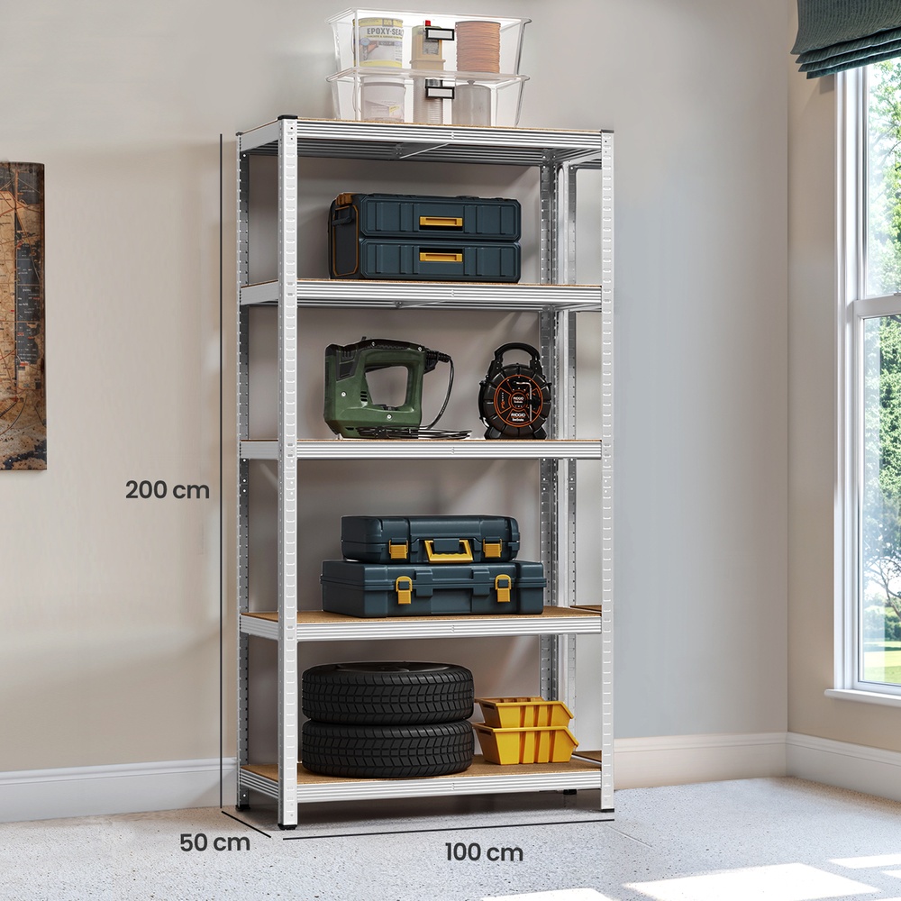 Are garden tools and various utensils scattered around your garage? Do you find it difficult to find the items you need? Then it’s high time to equip your garage with this storage rack and get the chaos under control. Top reasons why this shelving system from SONGMICS is just right for you: – The reinforced steel frame and wood-based shelves provide strong support. – The crossbars under each shelf level increase stability.- The powder coating is rust-resistant and wear-resistant. – Each shelf can hold weights of up to 175 kg. – The distance between the individual shelf levels is flexibly adjustable. – You can also divide the shelf into two parts. – The included anti-tip device ensures safe use. – The shelf is suitable for basements, laundry rooms, workshops, and business premises. Product details:- Color: Silver – Material: Powder-coated steel, E1-class MDF (medium-density fiberboard) – Size: 200 x 100 x 50 cm (H x L x W) – Weight: 16.7 kg – Max. static load capacity per shelf: 175 kg Scope of delivery:- 1 x storage rack – 1 x anti-tip device – 1 x instructions (DE, EN, FR, ES, IT) SONGMICS notes: – Always wear gloves when assembling. – Please do not place the product in a damp environment. – The max. load capacity in the text refers to the maximum static weight.