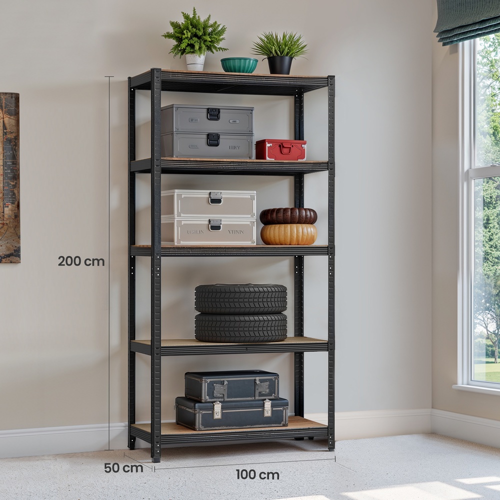 Are garden tools and various utensils scattered around your garage? Do you find it difficult to find the items you need? Then it’s high time to equip your garage with this storage rack and get the chaos under control. Top reasons why this shelving system from SONGMICS is just right for you: – The reinforced steel frame and wood-based shelves provide strong support. – The crossbars under each shelf level increase stability. – The frame is rust-resistant and wear-resistant. – Each shelf can hold weights of up to 175 kg. – The distance between the individual shelves is flexibly adjustable. You can also divide the shelf into two parts. – The included anti-tip device ensures safe use. – The shelf is suitable for basements, laundry rooms, workshops, and business premises. Product details: – Color: Black – Material: Steel, E1-class MDF (medium-density fiberboard) – Size: 200 x 100 x 50 cm (H x L x W) – Weight: 16.7 kg – Max. static load capacity per shelf: 175 kg Scope of delivery:- 1 x storage shelf – 1 x anti-tip device – 1 x instructions (DE, EN, FR, ES, IT) SONGMICS notes: – Always wear gloves when assembling. – Please do not place the product in a damp environment. – The max. load capacity in the text refers to the maximum static weight.