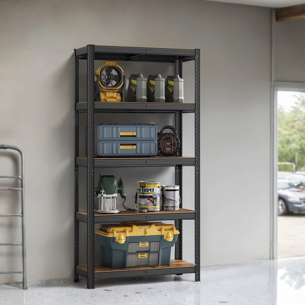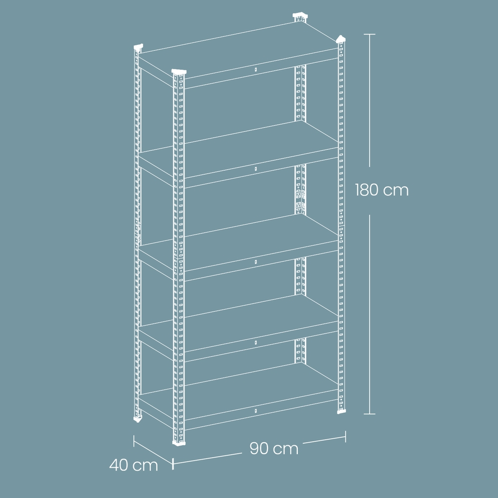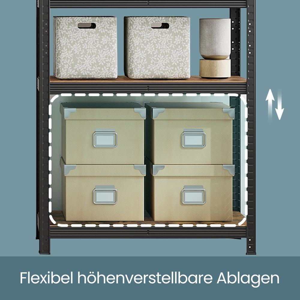 The advantages of this shelf from SONGMICS at a glance: The steel construction provides stable support The reinforced crossbars under each metal shelf provide additional stability The powder-coated surface is rust-resistant and robust Each shelf can hold up to 175 kg Each shelf is height-adjustable; the shelf can also be used separatelyThe included anti-tip bracket guarantees safe and stable useSuitable for basements, kitchens, living rooms, balconies, offices, and garagesProduct details:Color: Vintage brown-blackMaterial: Chipboard, steelSize: 40 x 90 x 180 cm (D x W x H)Weight: 14.8 kg Max. static load capacity per level: 175 kg Max. static load capacity in total: 875 kg Scope of delivery: 1 x heavy-duty shelf 1 x anti-tip device 1 x instructions SONGIMC notes: Please attach this product to the wall using the included anti-tip device to ensure safe use.Always wear gloves when assembling. Please do not place the product in a damp environment. The max. load capacity in the text refers to the maximum static weight.