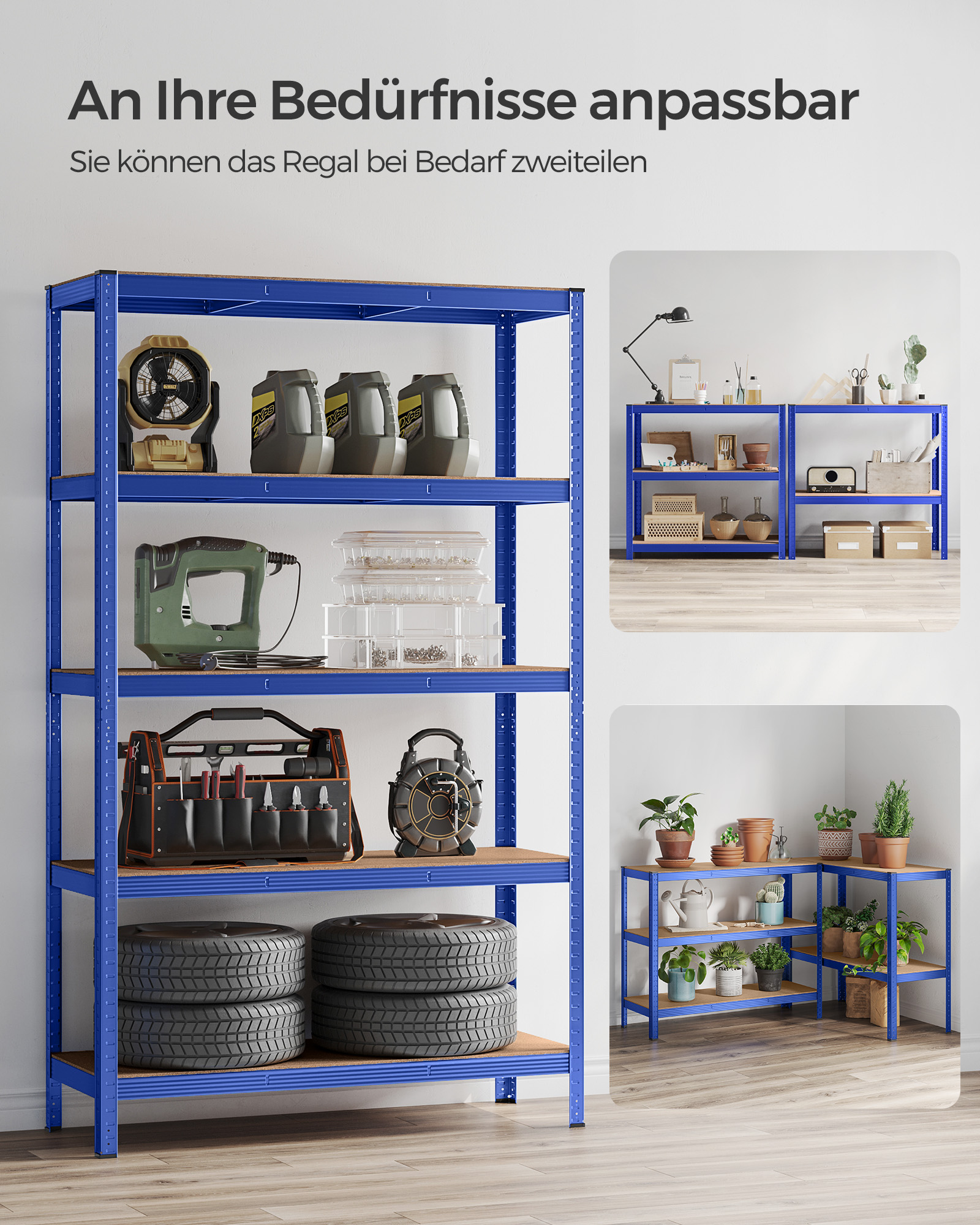 Are garden tools and various utensils scattered around your garage? Do you find it difficult to find the items you need? Then it’s high time to equip your garage with this storage rack and get the chaos under control. Top reasons why this shelving system from SONGMICS is just right for you: The reinforced steel frame and MDF shelves provide strong support.The crossbars under each shelf level increase stability. The frame is rust-resistant and wear-resistant. Each shelf can hold weights of up to 175 kg. The distance between the individual shelf levels is flexibly adjustable. You can also divide the shelf into two parts. The included anti-tip device ensures safe use. The shelf is suitable for basements, workshops, and business premises.Product details: Color: Blue Material: Steel, MDF (medium-density fiberboard) Size: 200 x 120 x 60 cm (H x L x W) Weight: 22.8 kg Max. static load capacity per shelf: 175 kg Scope of delivery: 1 x storage shelf 1 x anti-tip device 1 x instructions SONGMICS notes:Always wear gloves when assembling. Please do not place the product in a damp environment. The max. load capacity in the text refers to the maximum static weight.