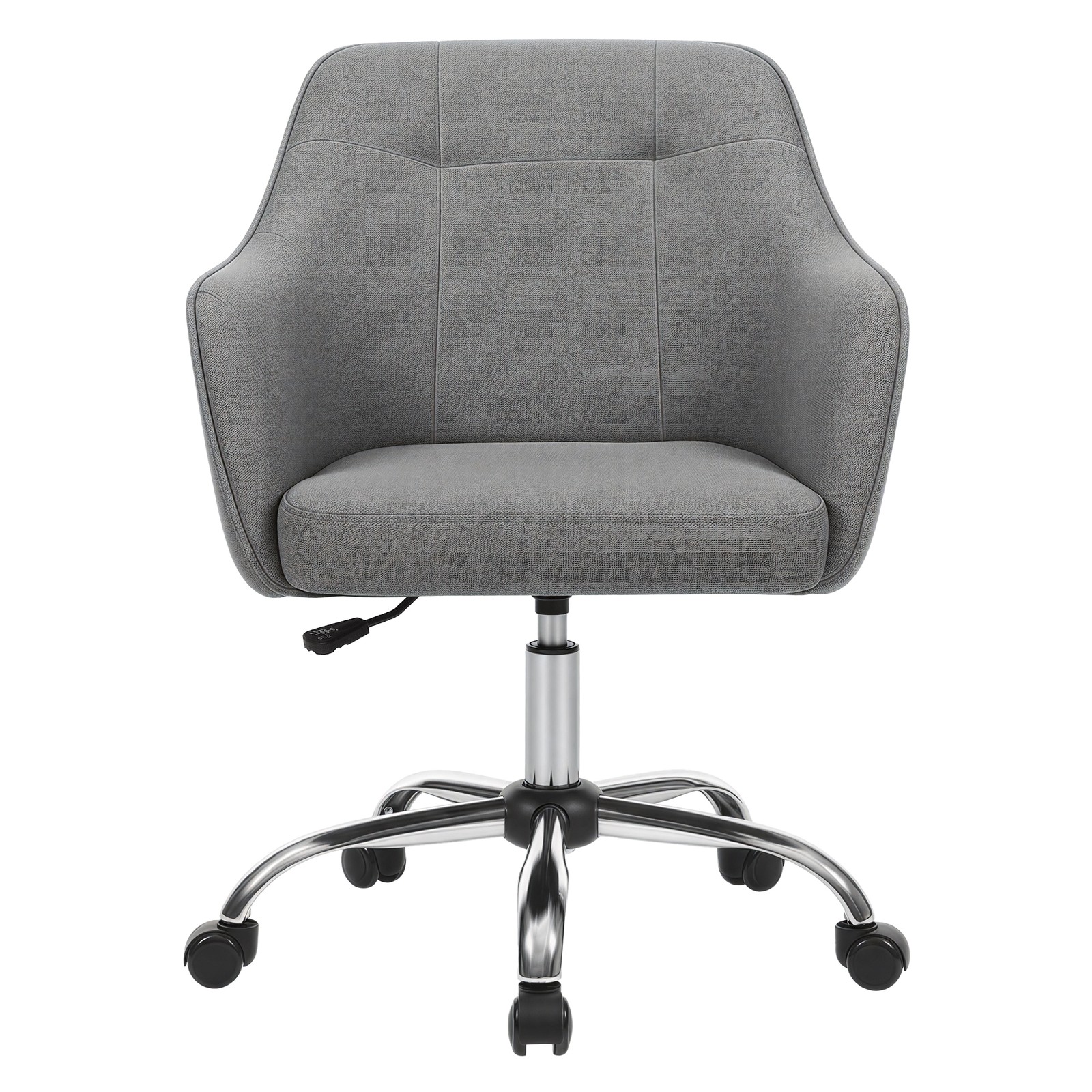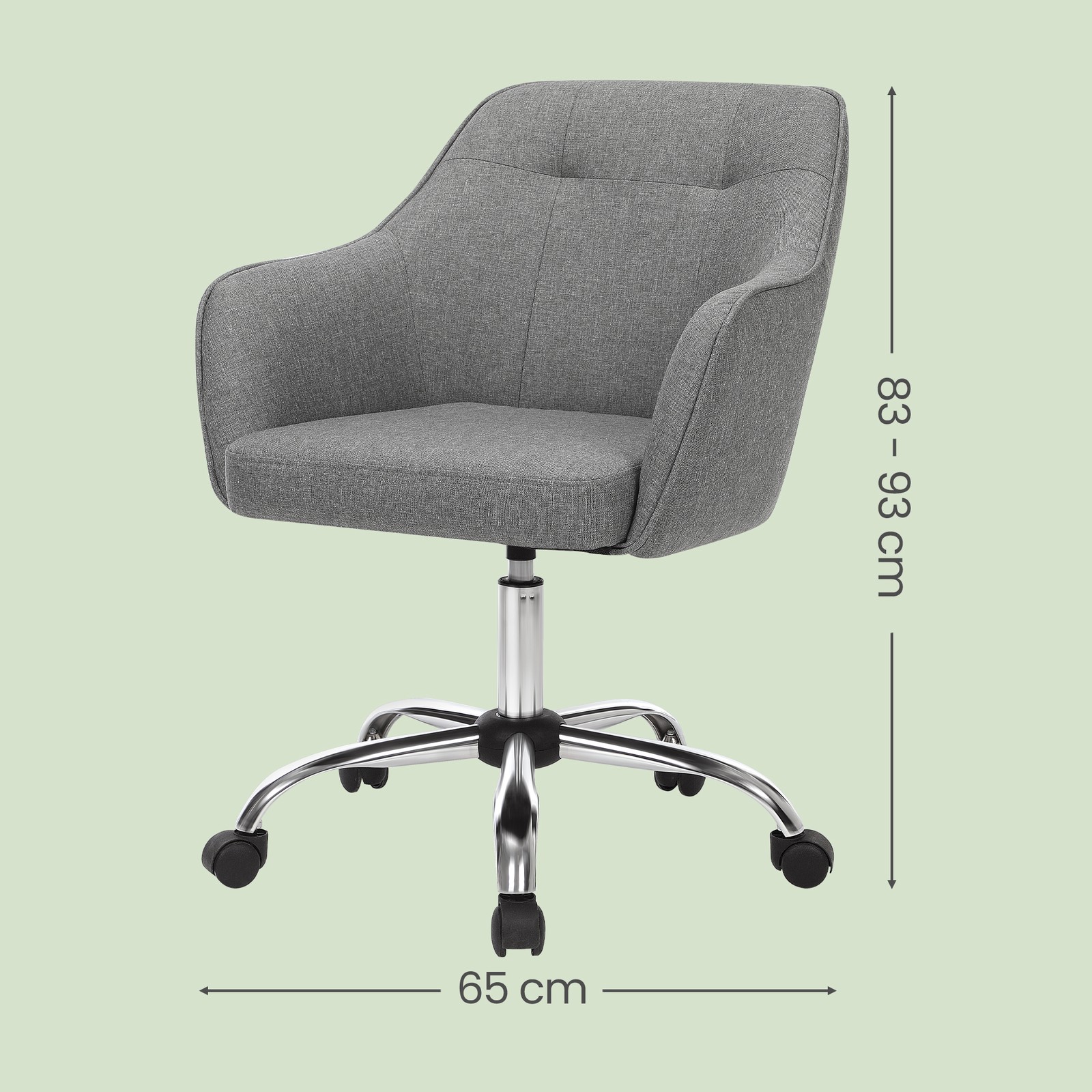 Product details: Color: Gray Material: Steel and plywood frame, foam filling, imitation linen surface, PU plastic casters Overall chair size: 65 x 69 x (83-93) cm (L x W x H) Seat height (from floor): 45-55 cm Seat dimensions: 47.5 x 44 cm (L x W) Backrest height: 49 cm Weight: 9.4 kg Max. static load capacity: 120 kg Scope of delivery: 1 x office chair 1 x accessory pack 1 x instructions (DE, EN, IT, FR, ES)