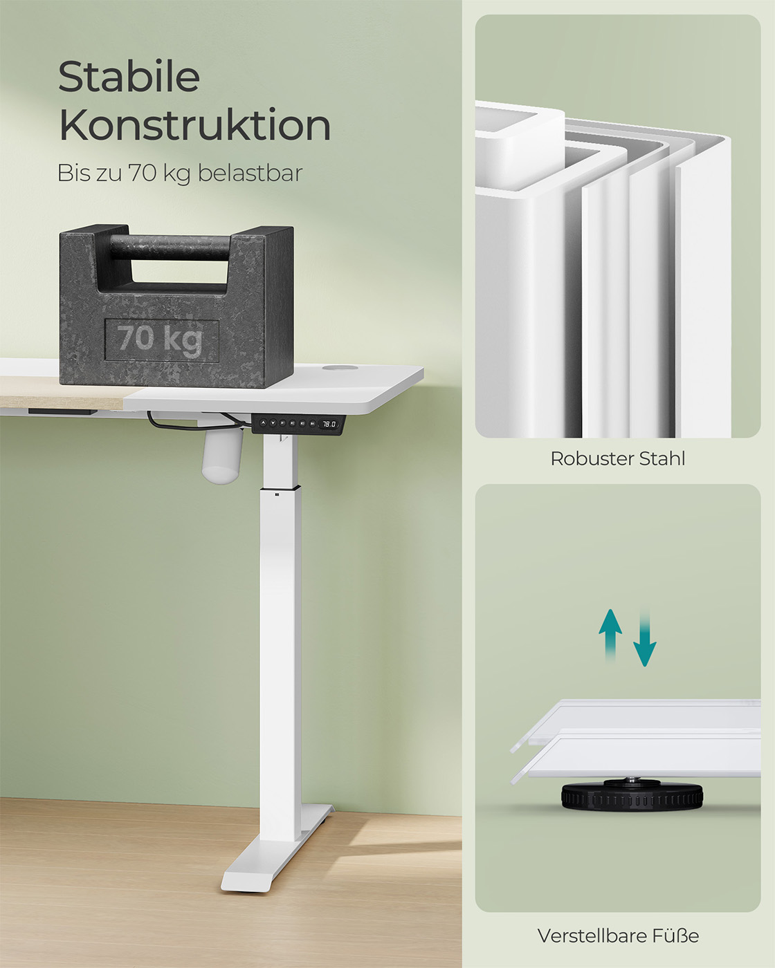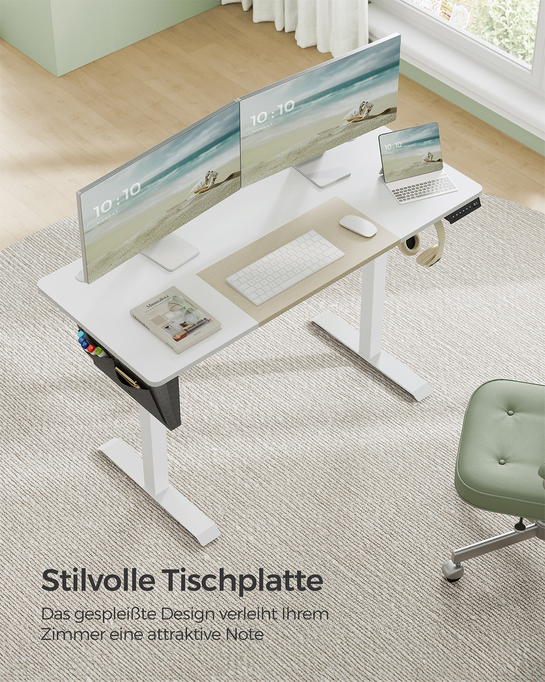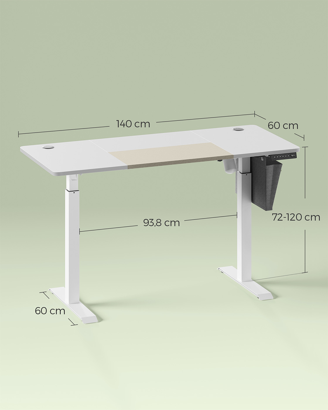 Product details: Color: White Material: Chipboard, steel, non-woven fabric Size: 60 x 140 x (72-120) cm (D x W x H) Thickness of tabletop: 1.5 cm Weight: 28 kg Max. static load capacity: 70 kg Scope of delivery: 1 x electric desk 1 x adapter 1 x controller 1 x storage bag 2 x hooks 1 x accessory pack 1 x instructions SONGMICS Notes: Do not place the table directly against a wall during the lifting and lowering process to avoid scratches. The product is intended for indoor use only. Keep all electrical components away from liquids. If the table is raised or lowered for 2 minutes, the overheating protection will automatically activate and you will have to wait 18 minutes before you can use the height adjustment again.To protect the worktop from bumps and scratches, set the built-in sensor to a higher value to detect solid objects during height adjustment. Please do not disassemble the individual parts of this product without professional advice. Do not place heavy objects exceeding the maximum load capacity of 80 kg on the product. Do not use sockets or adapters with excessive voltage.