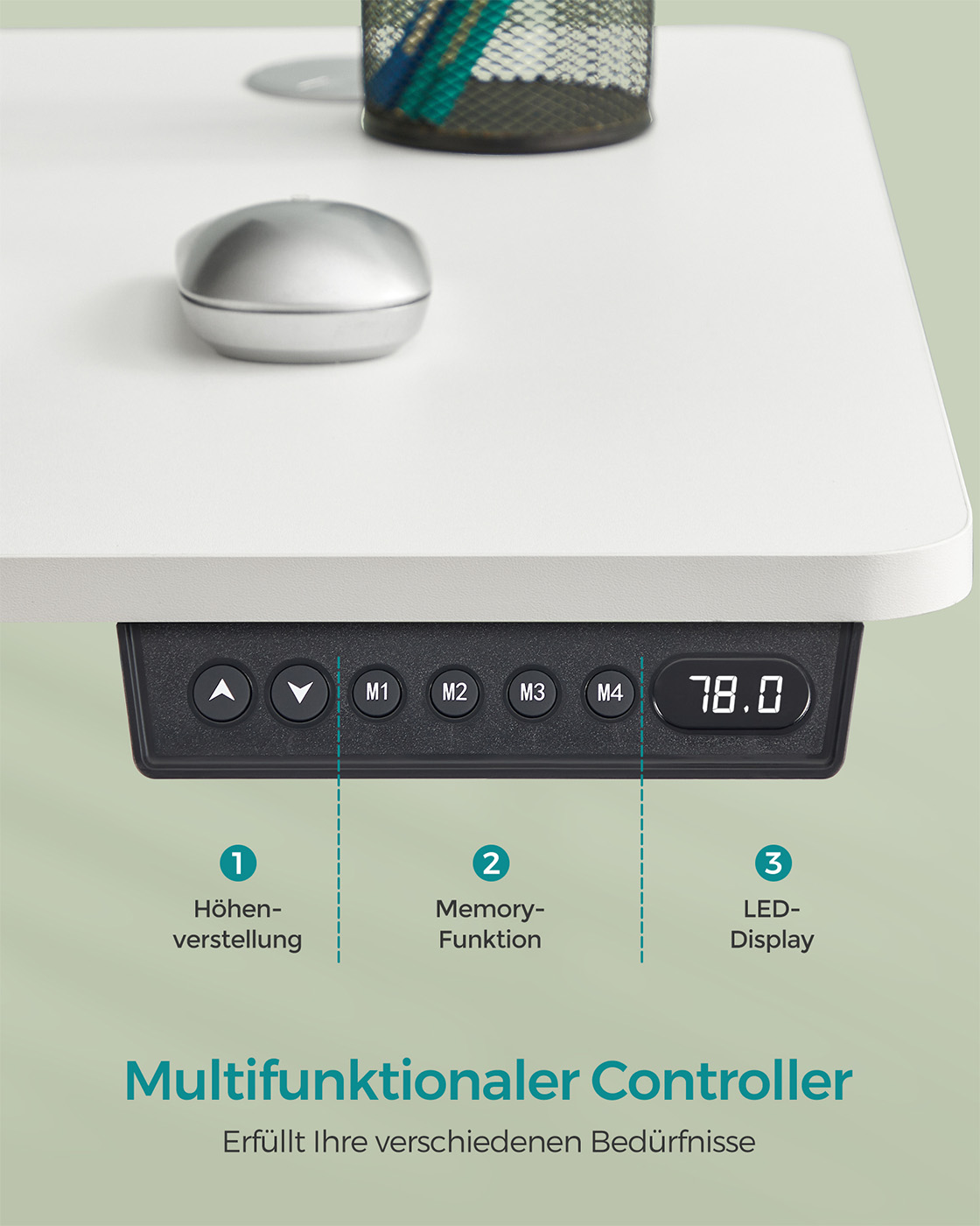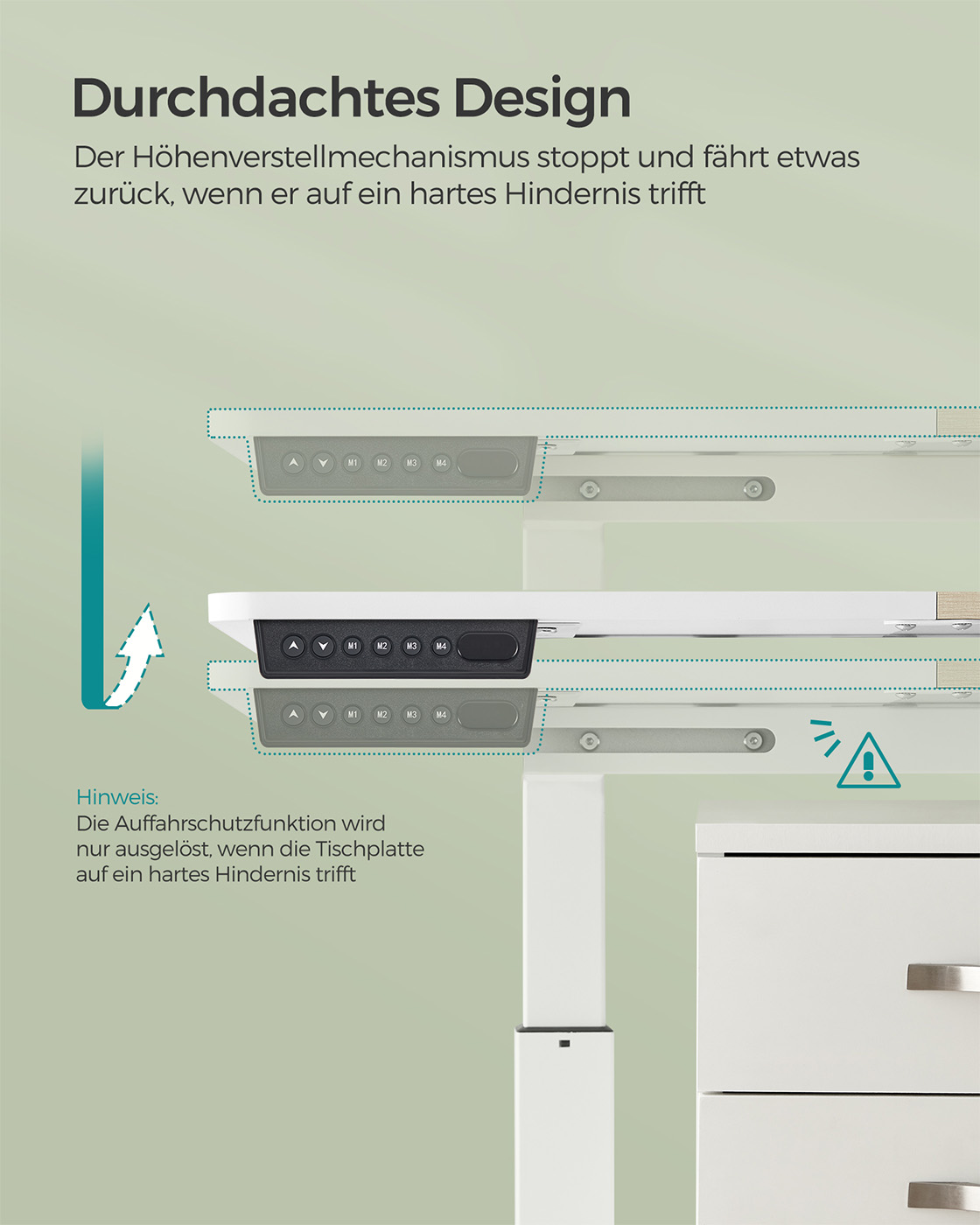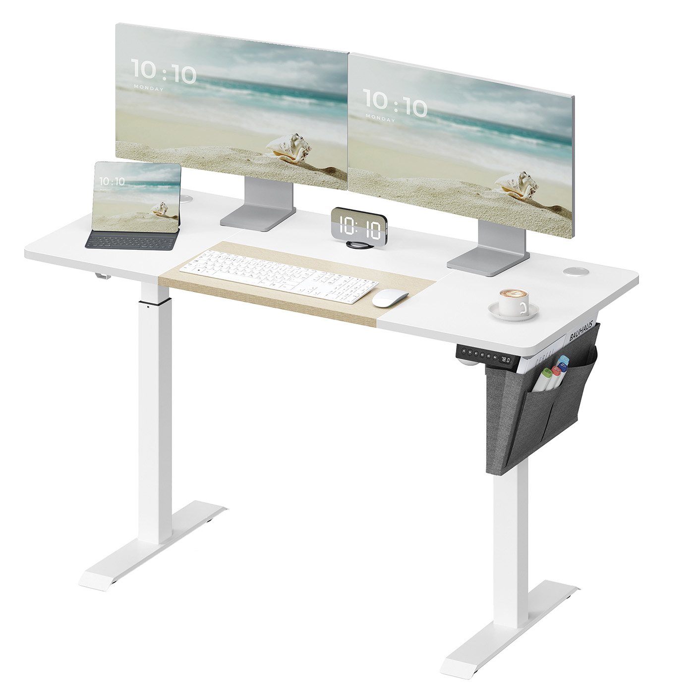 Product details: Color: White Material: Chipboard, steel, non-woven fabric Size: 60 x 140 x (72-120) cm (D x W x H) Thickness of tabletop: 1.5 cm Weight: 28 kg Max. static load capacity: 70 kg Scope of delivery: 1 x electric desk 1 x adapter 1 x controller 1 x storage bag 2 x hooks 1 x accessory pack 1 x instructions SONGMICS Notes: Do not place the table directly against a wall during the lifting and lowering process to avoid scratches. The product is intended for indoor use only. Keep all electrical components away from liquids. If the table is raised or lowered for 2 minutes, the overheating protection will automatically activate and you will have to wait 18 minutes before you can use the height adjustment again.To protect the worktop from bumps and scratches, set the built-in sensor to a higher value to detect solid objects during height adjustment. Please do not disassemble the individual parts of this product without professional advice. Do not place heavy objects exceeding the maximum load capacity of 80 kg on the product. Do not use sockets or adapters with excessive voltage.