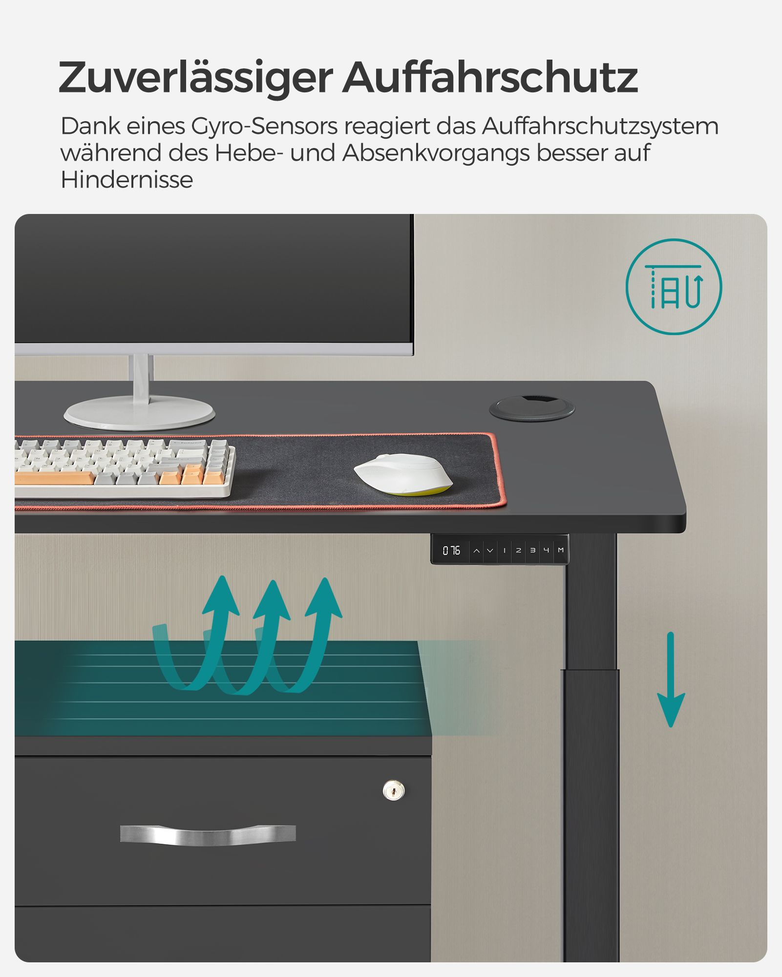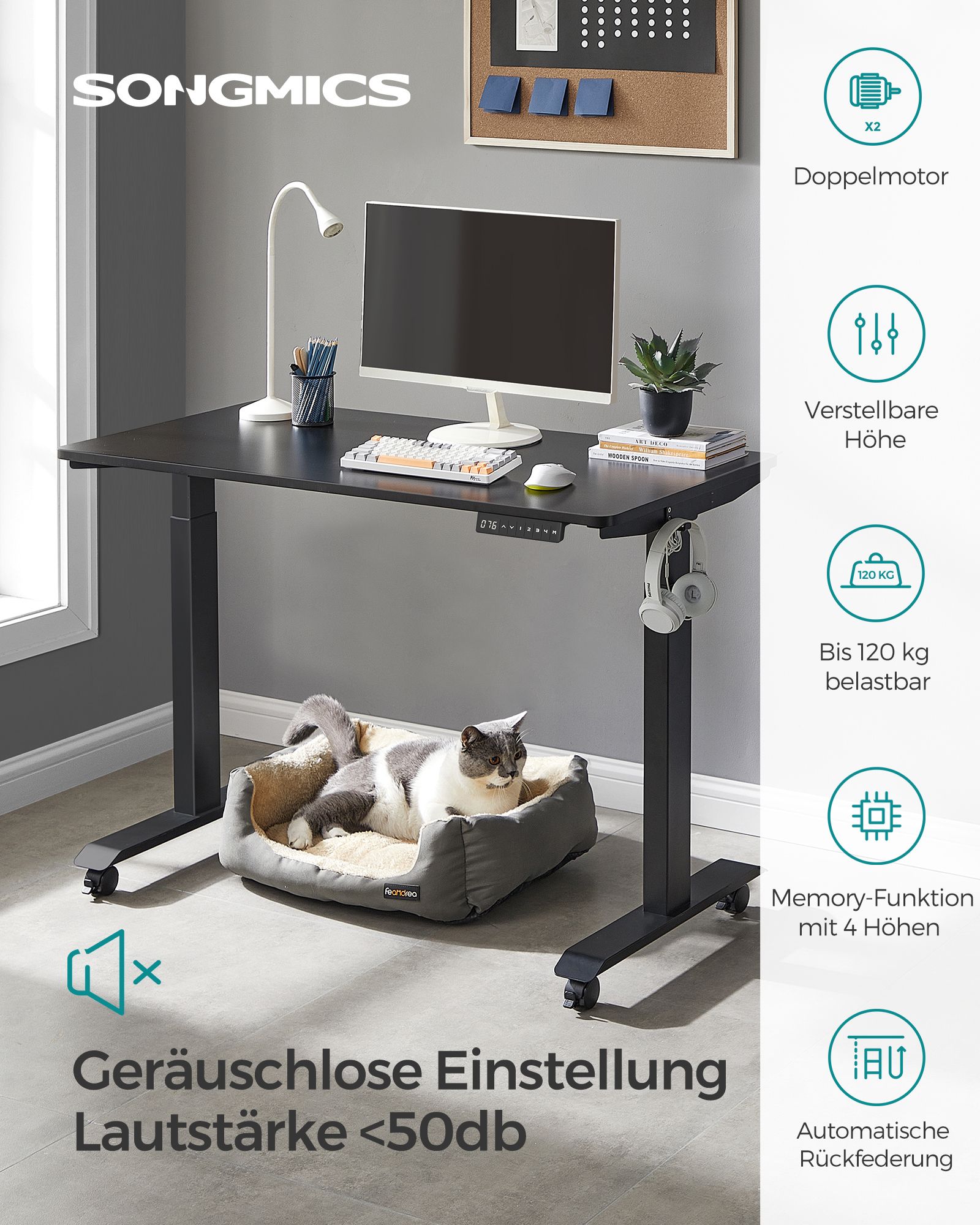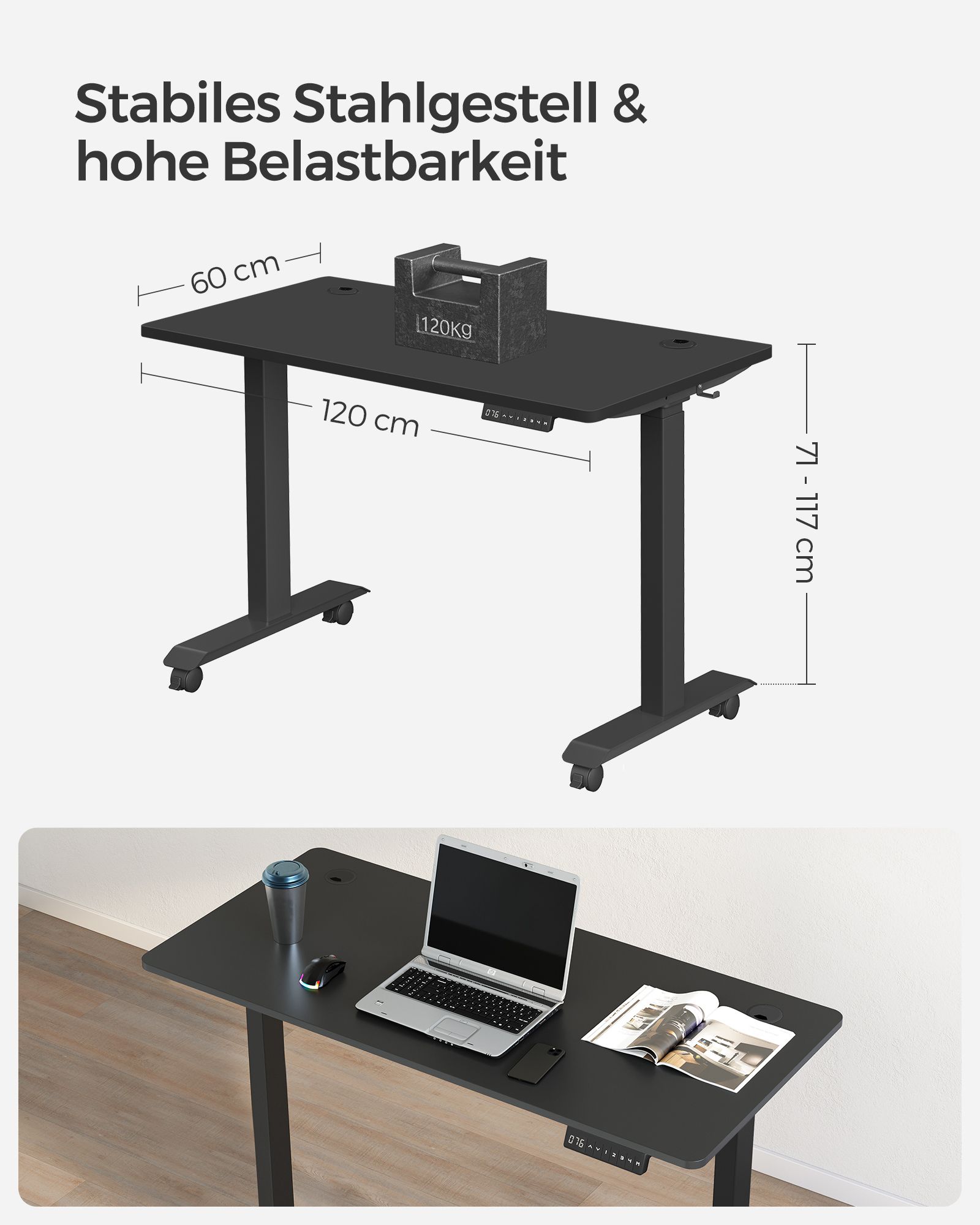 Advantages of the electric desk: Height adjustable from 71 to 117 cm for changing postures Fast adjustment speed of 32 mm/s with low noise < 50 dBHigh-quality motor for smooth adjustmentProduct details:Color: BlackMaterial: Chipboard, steelSize: 60 x 120 x (71-117) cm (D x W x H)Height adjustment: 69-115 cmNoise level: < 50 dBAdjustment speed: 32 mm/sMax. static load capacity: 120 kgWeight: 33.4 kgScope of delivery:1 x electric table1 x memory for height settings1 x controller2 x hooks4 x casters1 x accessory package1 x instructionsSONGMICS Notes:The product is delivered in 2 packages. Please be patient if you only receive one package at first. The second will be delivered shortly. Please ensure that the table frame is not obstructed during the lifting and lowering process. Do not place the table directly against a wall to avoid scratching the wall. The product is intended for indoor use only. Keep all electrical components away from liquids. If the table is raised or lowered for 2 minutes, the overheating protection will automatically activate and you will have to wait 18 minutes before you can use the height adjustment again. The collision protection protects pets and children from bumps and scratches. Adjust the sensitivity level as needed according to the instructions. Do not place heavy objects exceeding the maximum load capacity of 120 kg on the product. Ensure that the controller is level before testing the height adjustment. Do not hold it in your hand for testing.