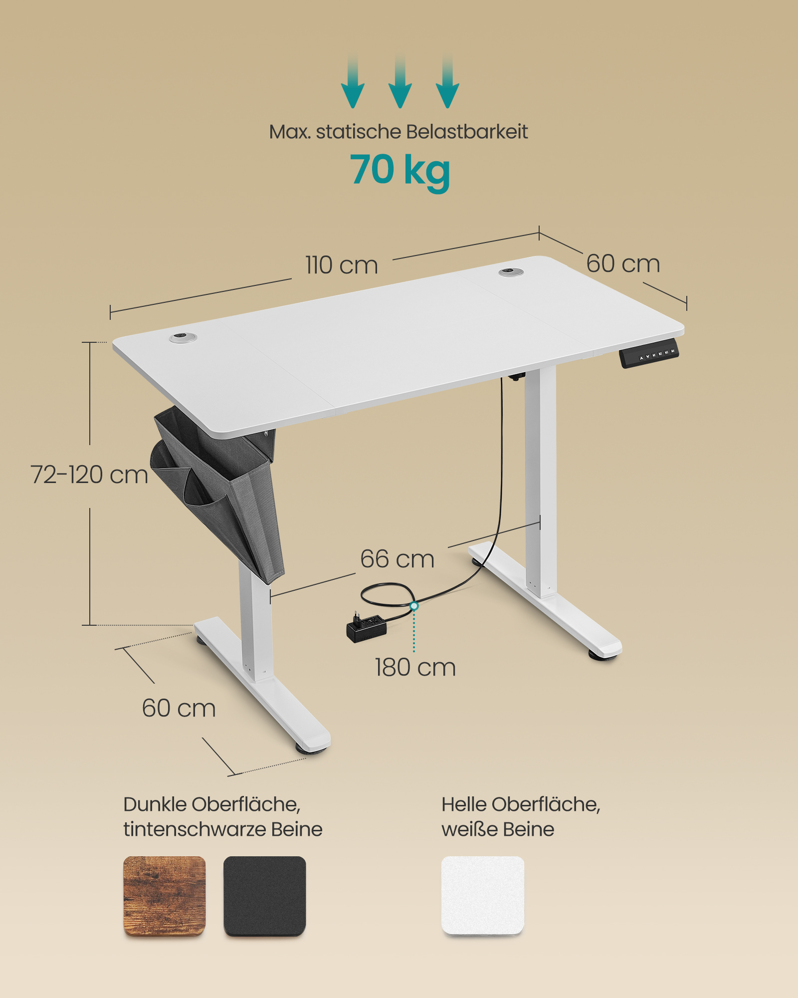 SONGMICS Height-adjustable electric desk, 60 x 120 x (72-120) cm, adjustable table, memory function for 4 heights, for home office, study, cloud white LSD132W01