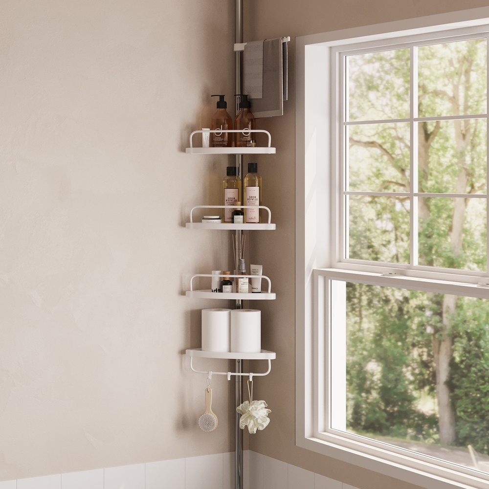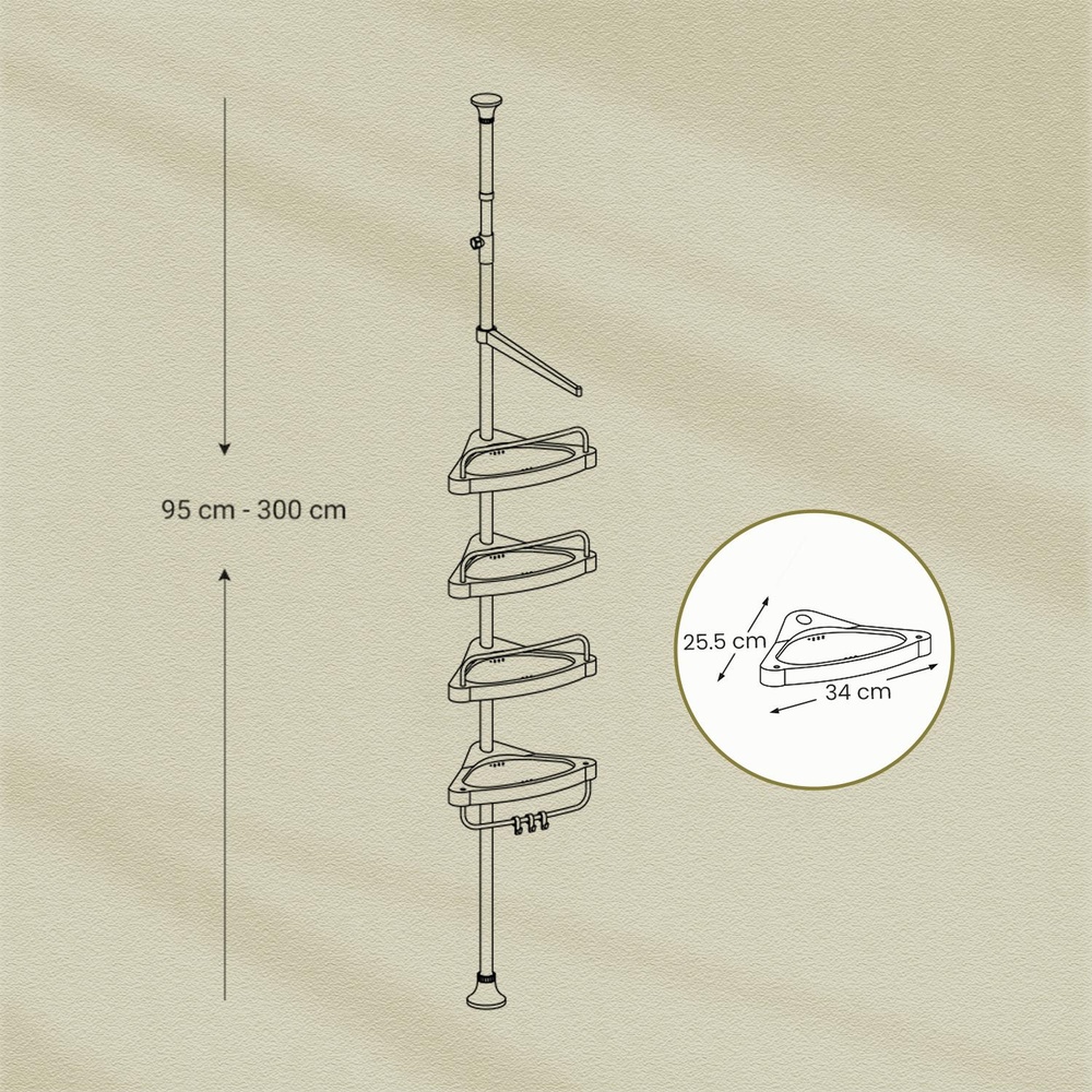 Every bathroom needs this shelf: Are you lacking storage space to keep your soap, shower gel, and facial cleanser within easy reach? Then you should try this shower shelf from SONGMICS! Equipped with 4 shelves and a towel holder, this shelf provides a suitable place for your shower accessories. In addition, your washcloths and sponges can be neatly hung on the hooks to dry. Assembly is a breeze! No drilling or tools are required to assemble this corner shelf. Simply connect the tubes and attach the two feet, the shelves, and the rubber rings. You can then attach this shower rack to a corner in your bathroom or to the edge of your bathtub. Product details: Color: White-silver Material: 304 stainless steel, PP plastic, ABS, PVC Suitable height from floor to ceiling: 95-300 cm Foot diameter: 7 cm Weight: 1.7 kg Max. static load capacity per shelf: 2 kg Scope of delivery: 1 x shower shelf 1 x instructions (DE, EN, FR, ES, IT) SONGMICS notes: The product should not be used on sloping floors or on a sloping roof. Each shelf can hold up to 2 kg. Do not store heavier items on the product.