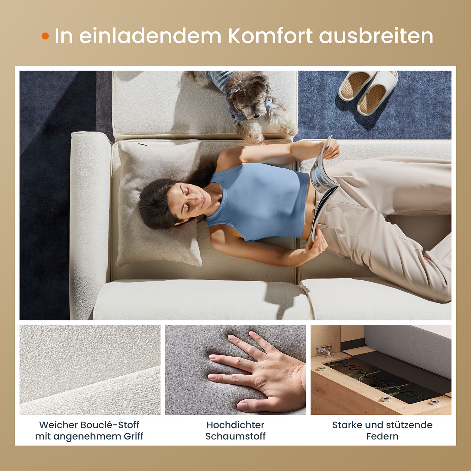 – Material: Eucalyptus wood, steel, foam, bouclĂ© fabric