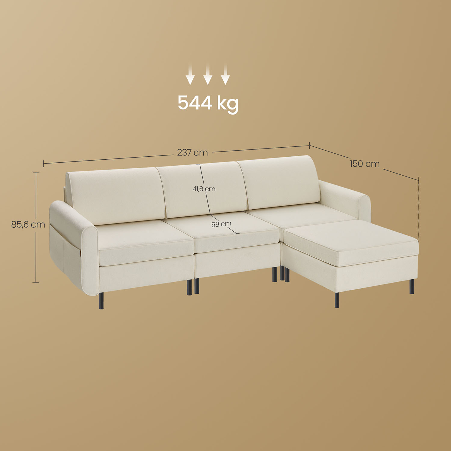 – Size (L-shape): 150 x 237 x 85.6 cm (D x W x H)