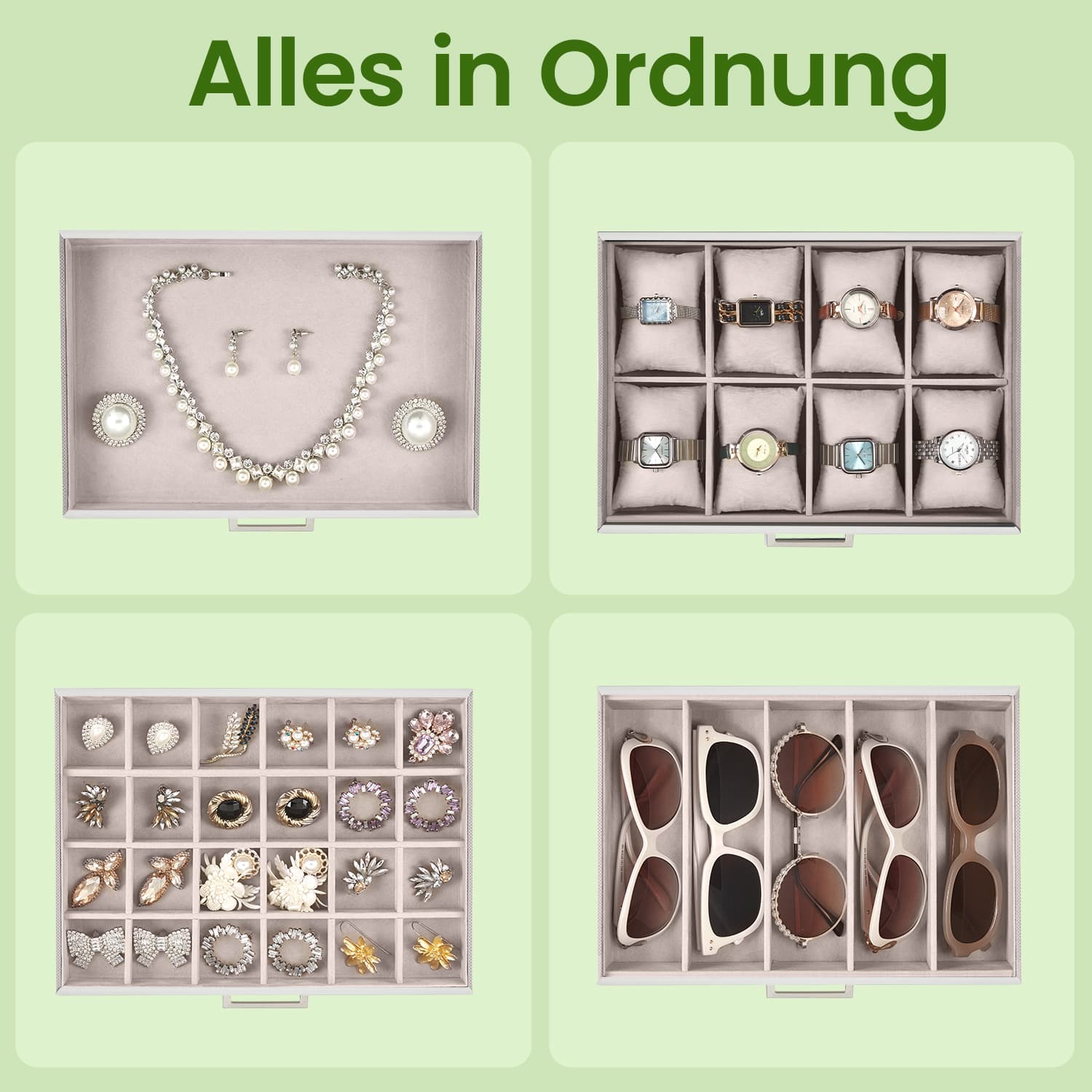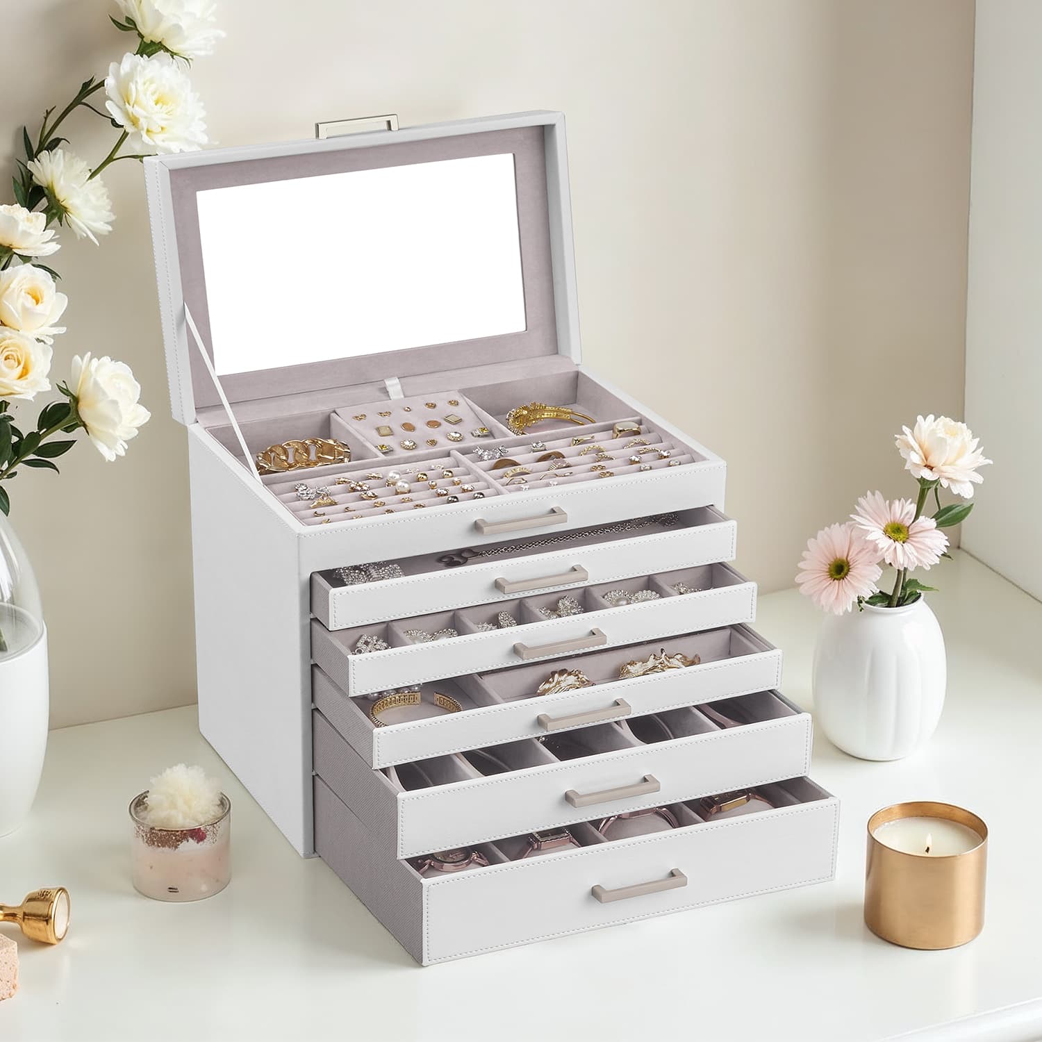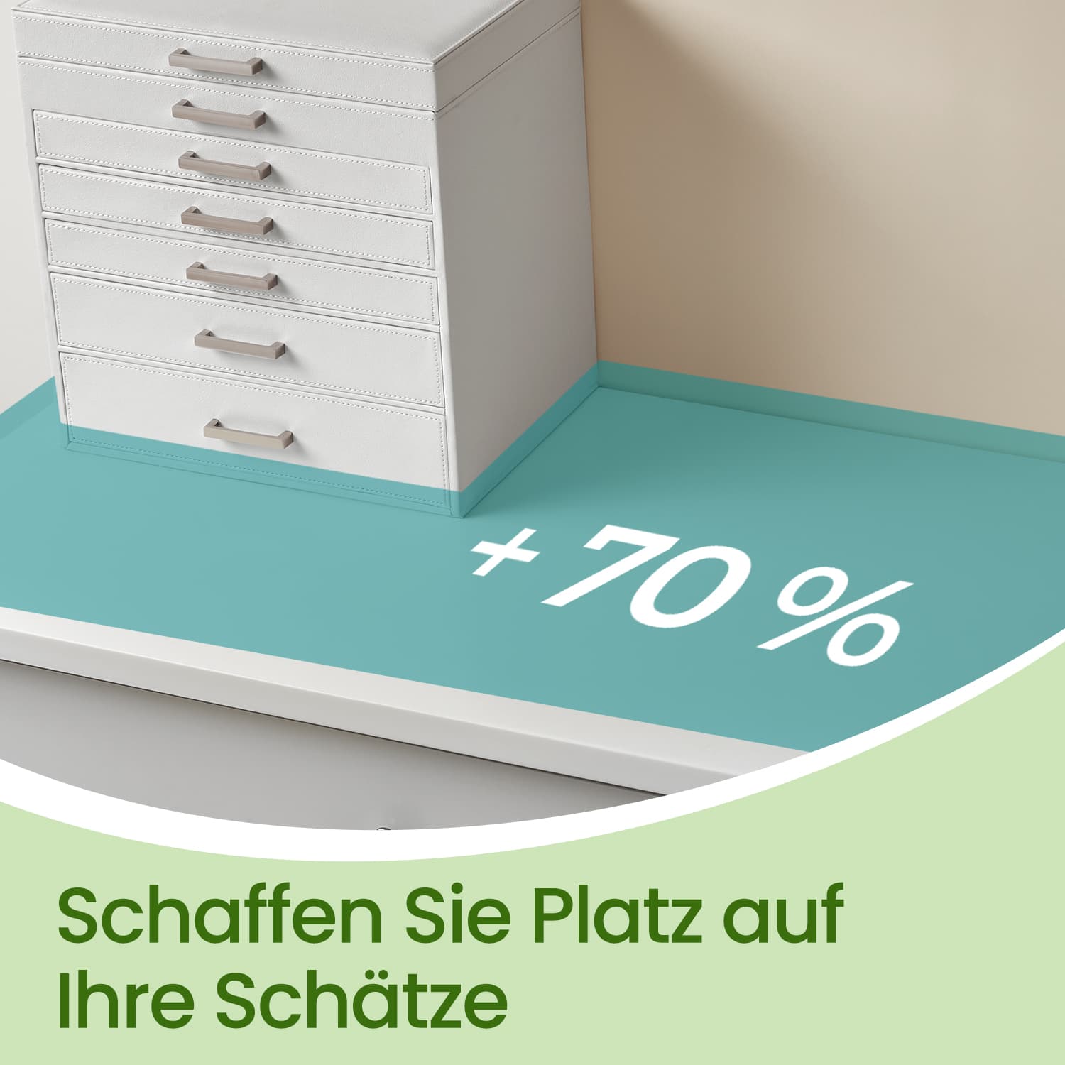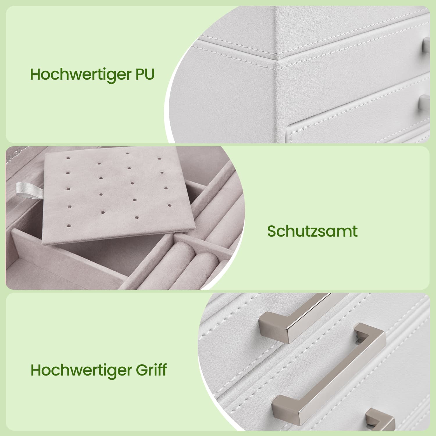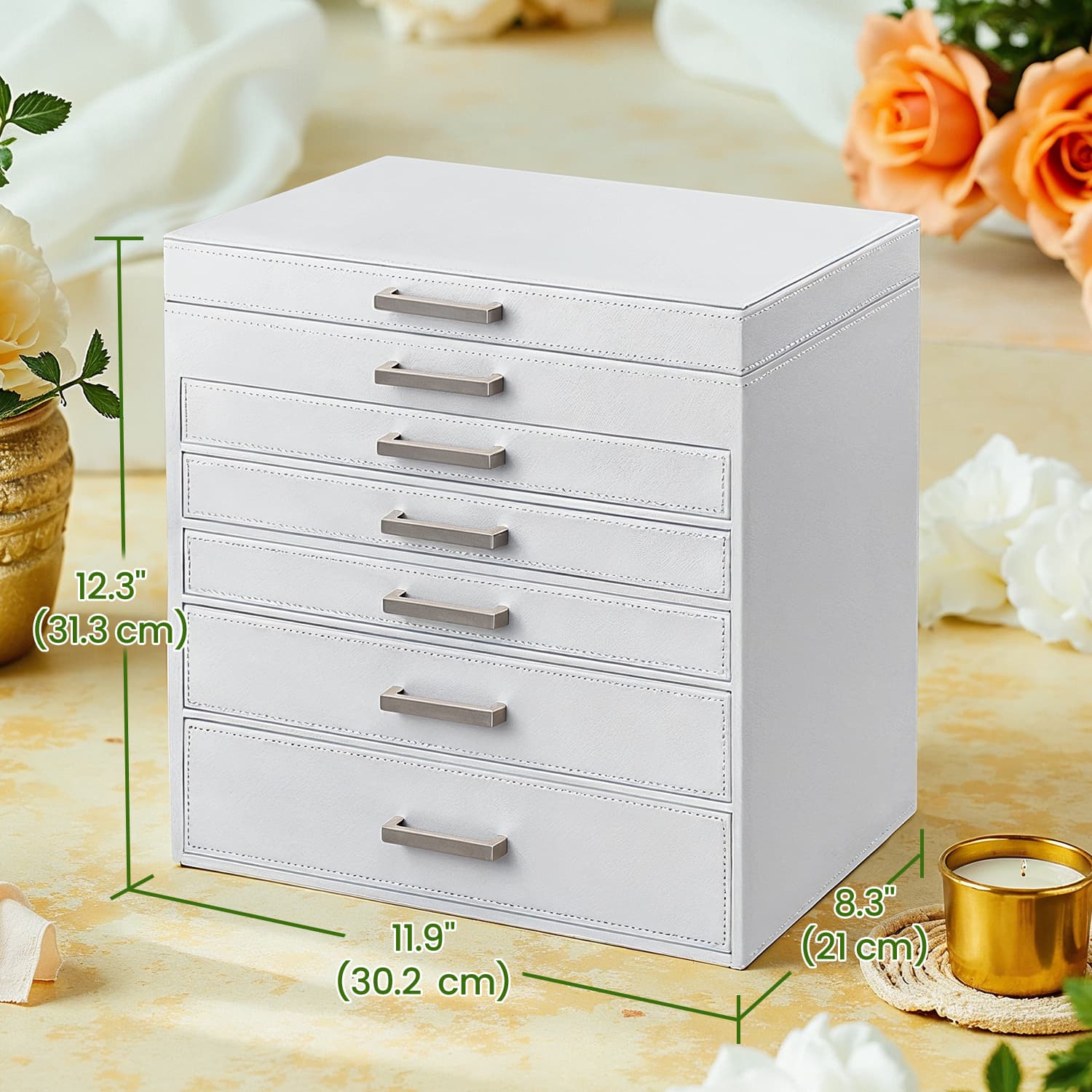 A beautiful, elegant, and timeless jewelry box! This elegant jewelry case impresses not only with its elegant design, but also with its large storage space. Six levels offer various storage options for your rings, bracelets, necklaces, and much more—even when traveling. This elegant jewelry box from Songmics is a must-have for all jewelry lovers. Storage and care: – Please place the jewelry box in a ventilated room and avoid leaving it in the sun or in a room with high humidity for long periods of time. Suitable temperature: 10-40℃. – Stains on the surface can be wiped off with a slightly damp cloth. Please avoid letting water get inside the jewelry box. – Please use the special care product for imitation leather regularly to maintain the shine of the imitation leather for a long time. – Please protect the jewelry box from being crushed during storage. – Do not store the jewelry box together with chemicals. Product details: – Color: white – Dimensions: 30.5 x 31.5 x 21.5 cm (W x H x D) – Drawer dimensions (2nd-4th levels): 28.5 x 3.2 x 19.5 cm (W x H x D) – Drawer dimensions (5th level): 28.5 x 4.5 x 19.5 cm (W x H x D) – Drawer dimensions (6th level): 28.5 x 6.5 x 19.5 cm (W x H x D) – Compartment dimensions of the 6th level: 6.5 x 4 x 9.5 cm (W x H x D) – Material: MDF board + PU + velvet – Net weight: 4.48 kg