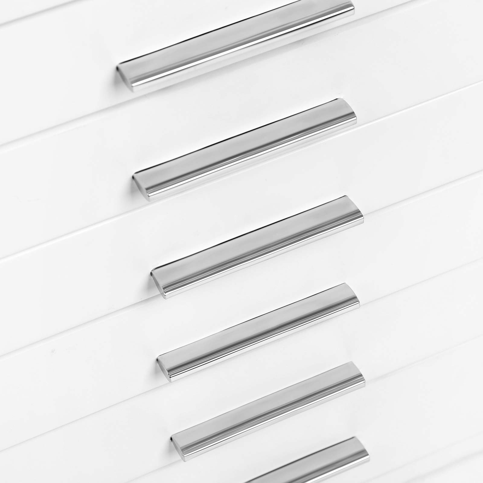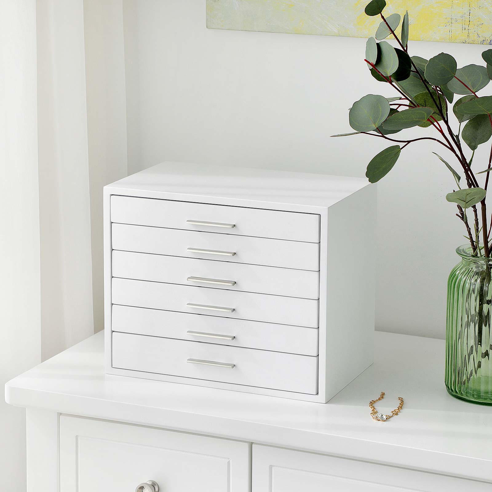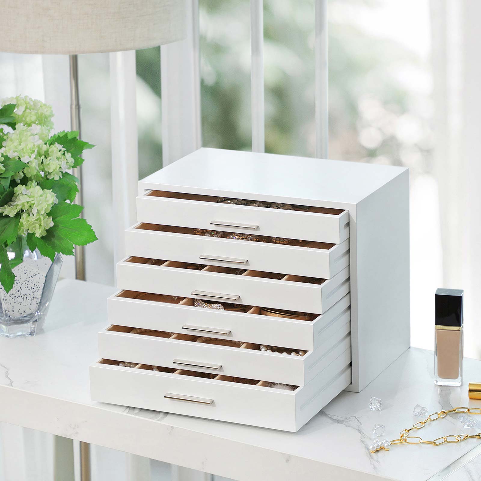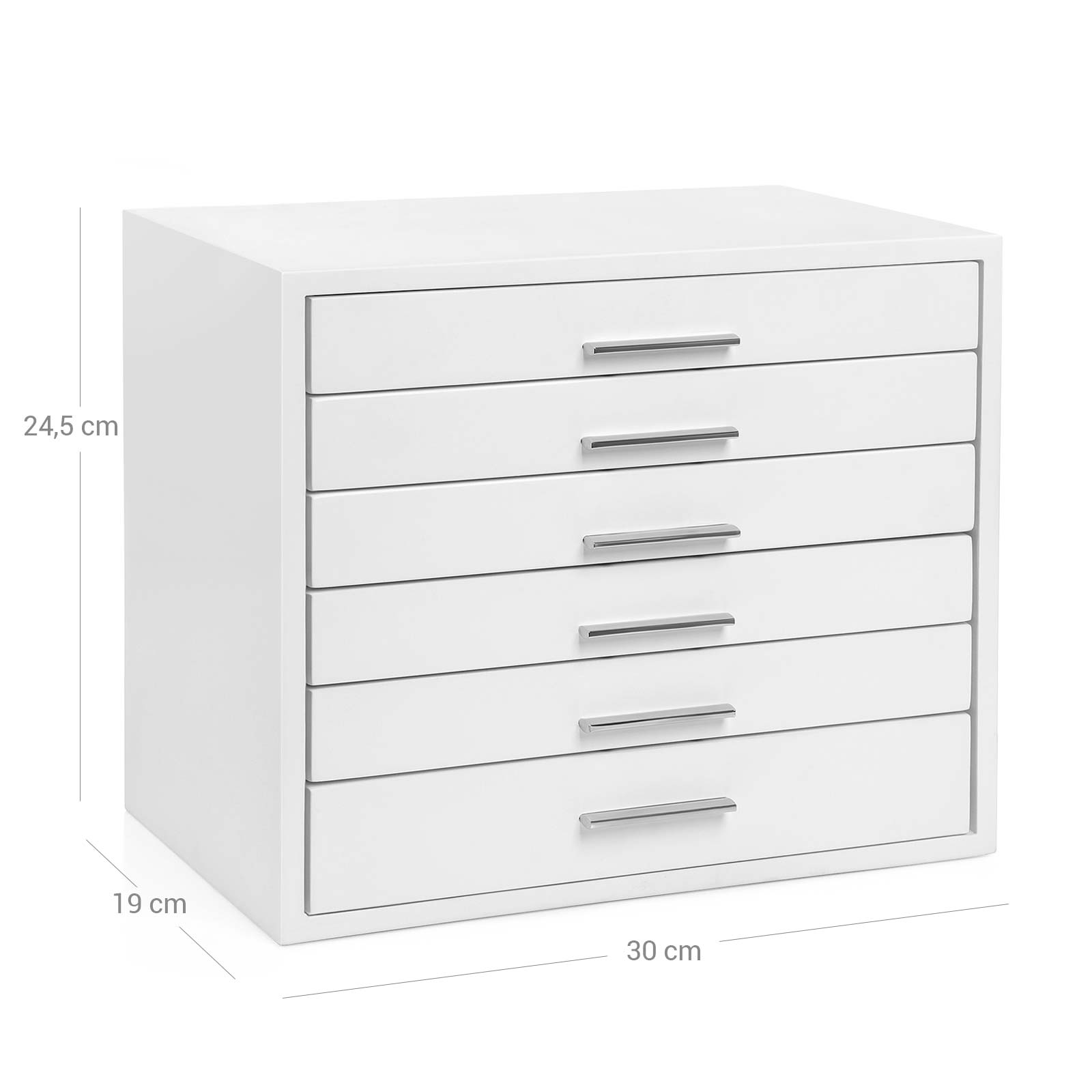 Classic jewelry box for jewelry lovers: Made of wood-based material and velvet lining, this box is a perfect and durable storage solution for your most valuable jewelry. The smooth, matte finish also gives this jewelry box the elegance it needs. 6 levels, 29 compartments: The jewelry box has 6 drawers with 29 compartments. The different layout of each drawer is particularly advantageous: 2 drawers have no dividers, so you can decide for yourself which pieces of jewelry to store in them. One drawer, on the other hand, has elongated compartments for storing sunglasses or necklaces. Two other drawers have square compartments for bracelets. The last drawer has extra-deep compartments for wristwatches. Product details: Color: White Material: MDF (medium-density fiberboard), velvet, zinc alloy Size: 29.9 x 19.8 x 24.5 cm (L x W x H) Weight: 3.9 kg Scope of delivery: 1 x jewelry box