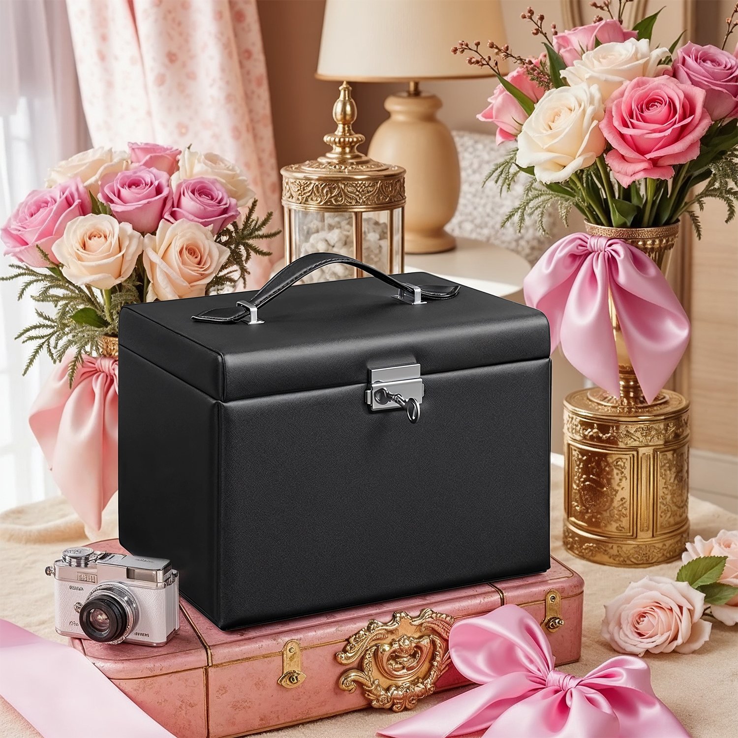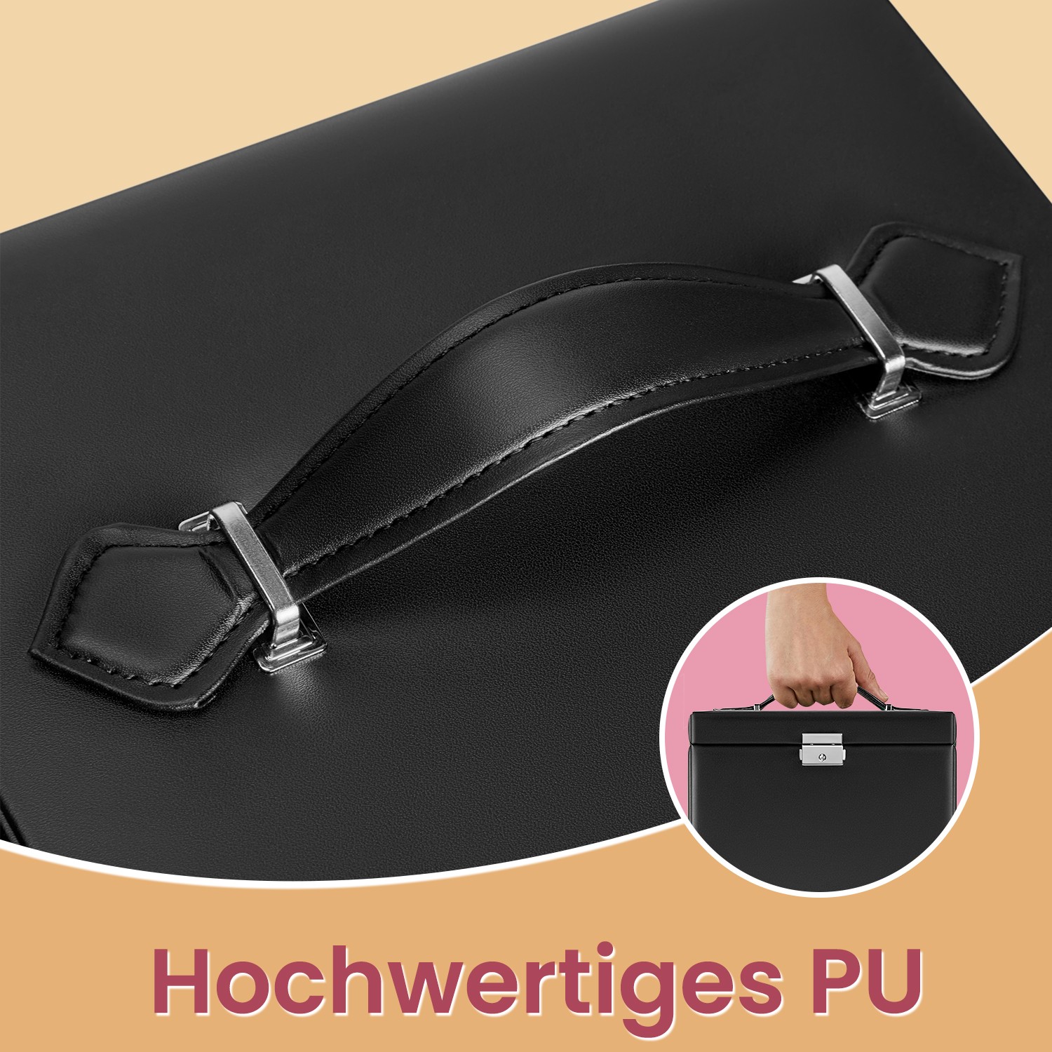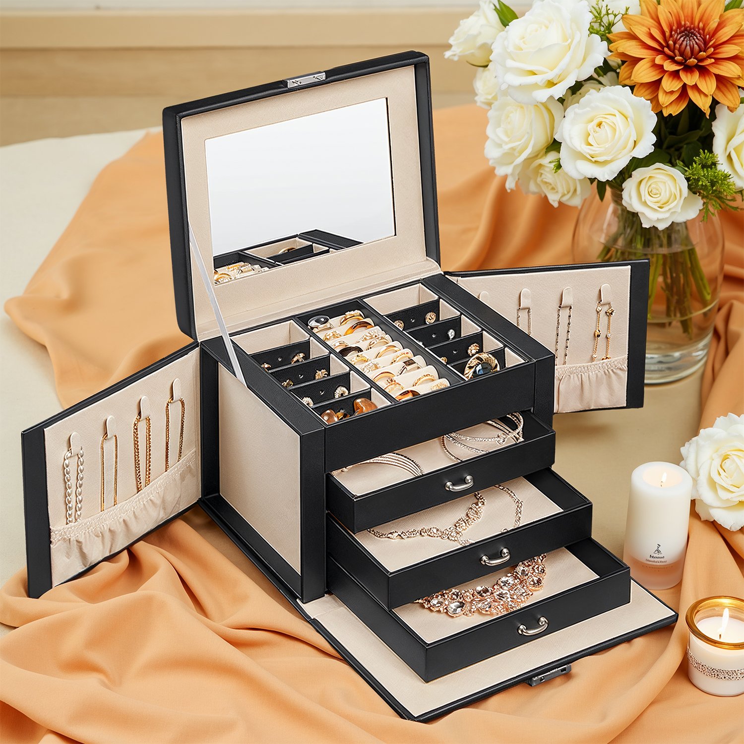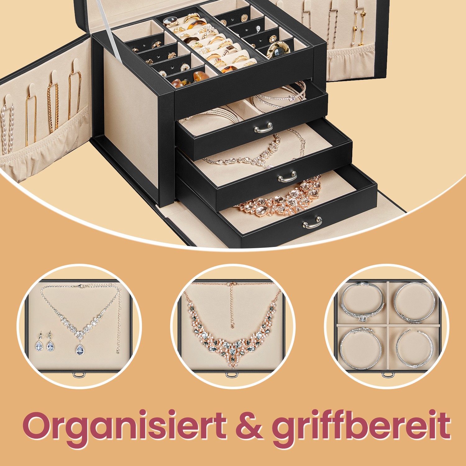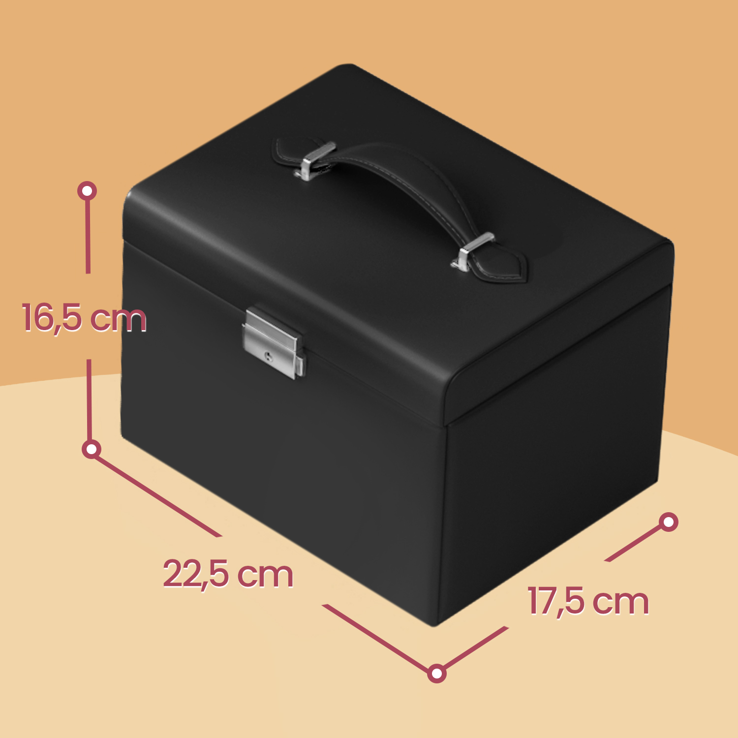 Original – for a successful gift! Phew… Are you going to show up empty-handed at your friends’ birthday party because you don’t have a good gift idea? No, no, no! Instead, choose this useful, practical, and original jewelry box and present the gift along with your best wishes! We’ll show you all the highlights of this jewelry box:The size is suitable for your entire jewelry collection. 3 drawers for bracelets and necklaces, 1 drawer with removable dividers. 10 compartments for earrings, brooches, and pendants, with removable dividers with holes for 20 stud earrings. 9 slots for rings. 8 hooks for necklaces. 2 pockets for pendants.2 keys to lock the box. Product details: Color: Black Material: MDF (medium-density fiberboard), velvet lining Size: 22.5 x 17.5 x 16.5 cm (L x W x H) Weight: 1.6 kg Scope of delivery: 1 x jewelry box 2 x keys
