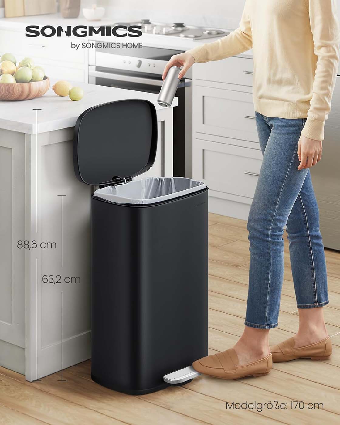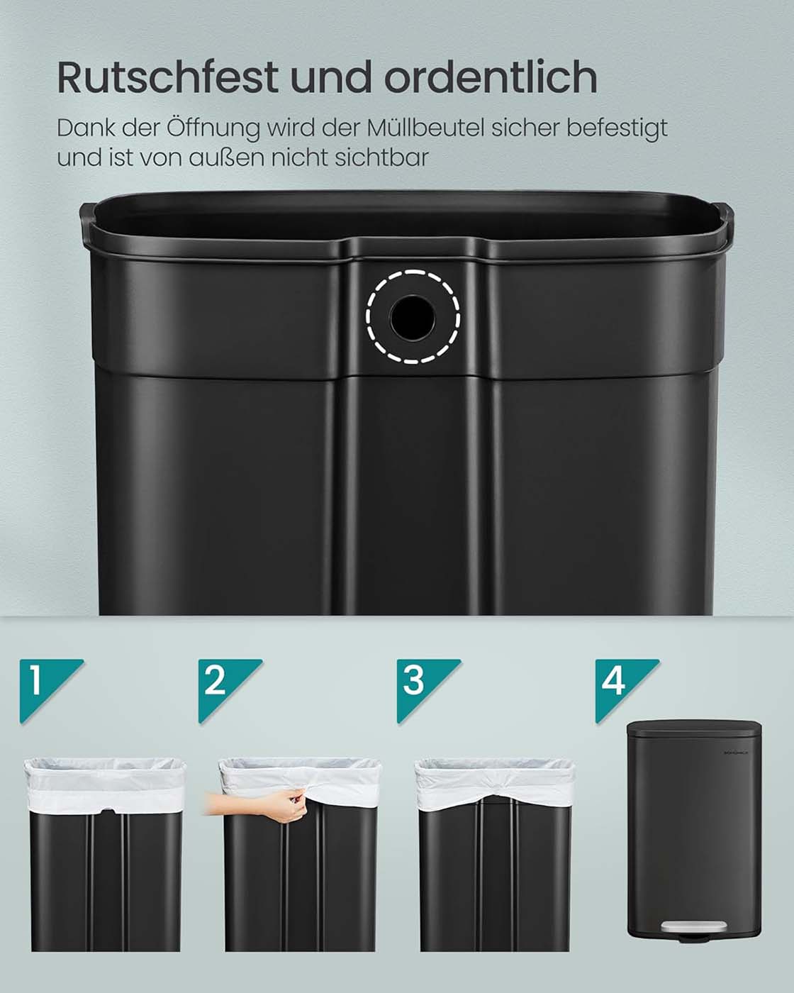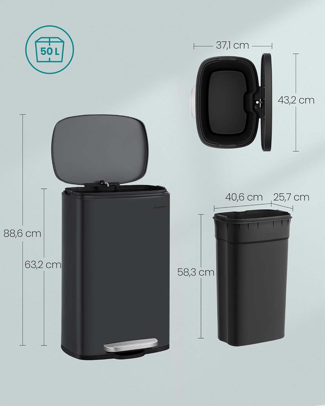 SONGMICS trash can, waste bin, 50 liters, steel pedal bin, plastic inner bucket, with hinged lid, soft close, airtight, for the kitchen, silver LTB050E01