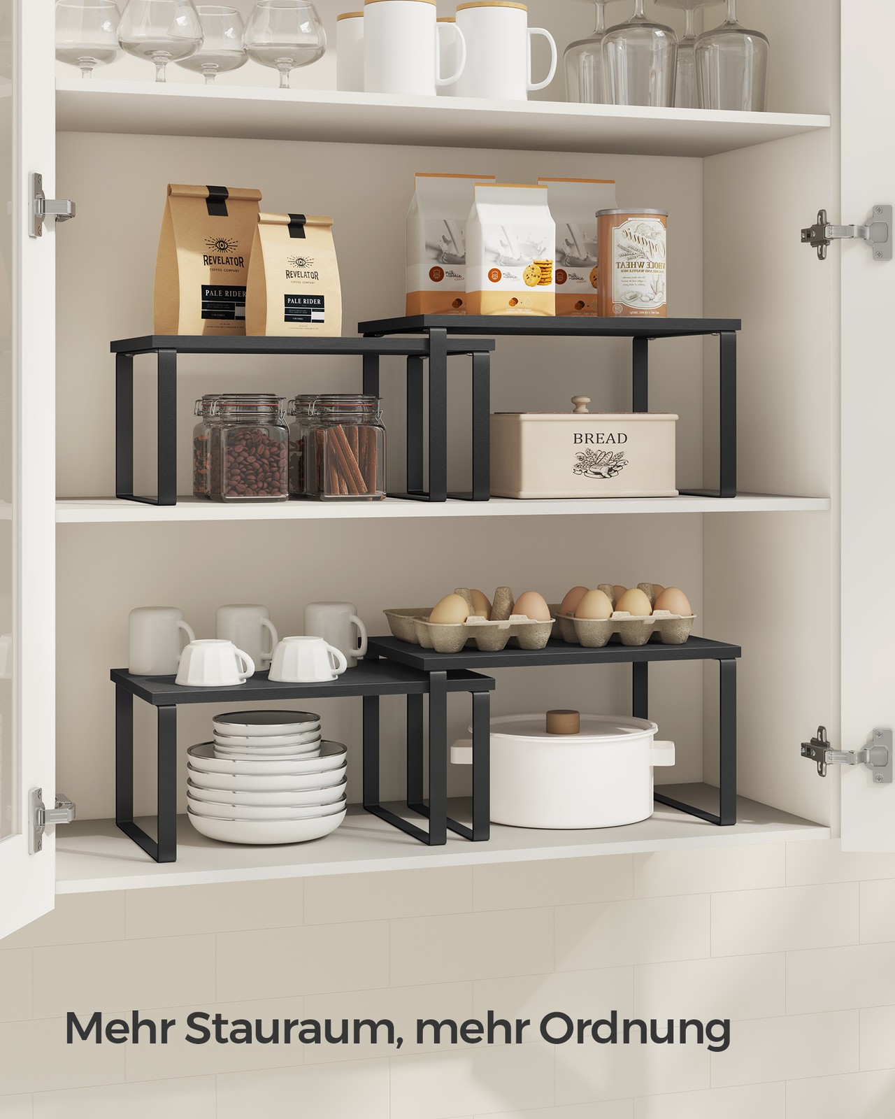 SONGMICS spice rack, set of 4 kitchen organizers, kitchen shelf, cabinet organizer for kitchen, expandable, small shelf, stackable, metal and wood-based material