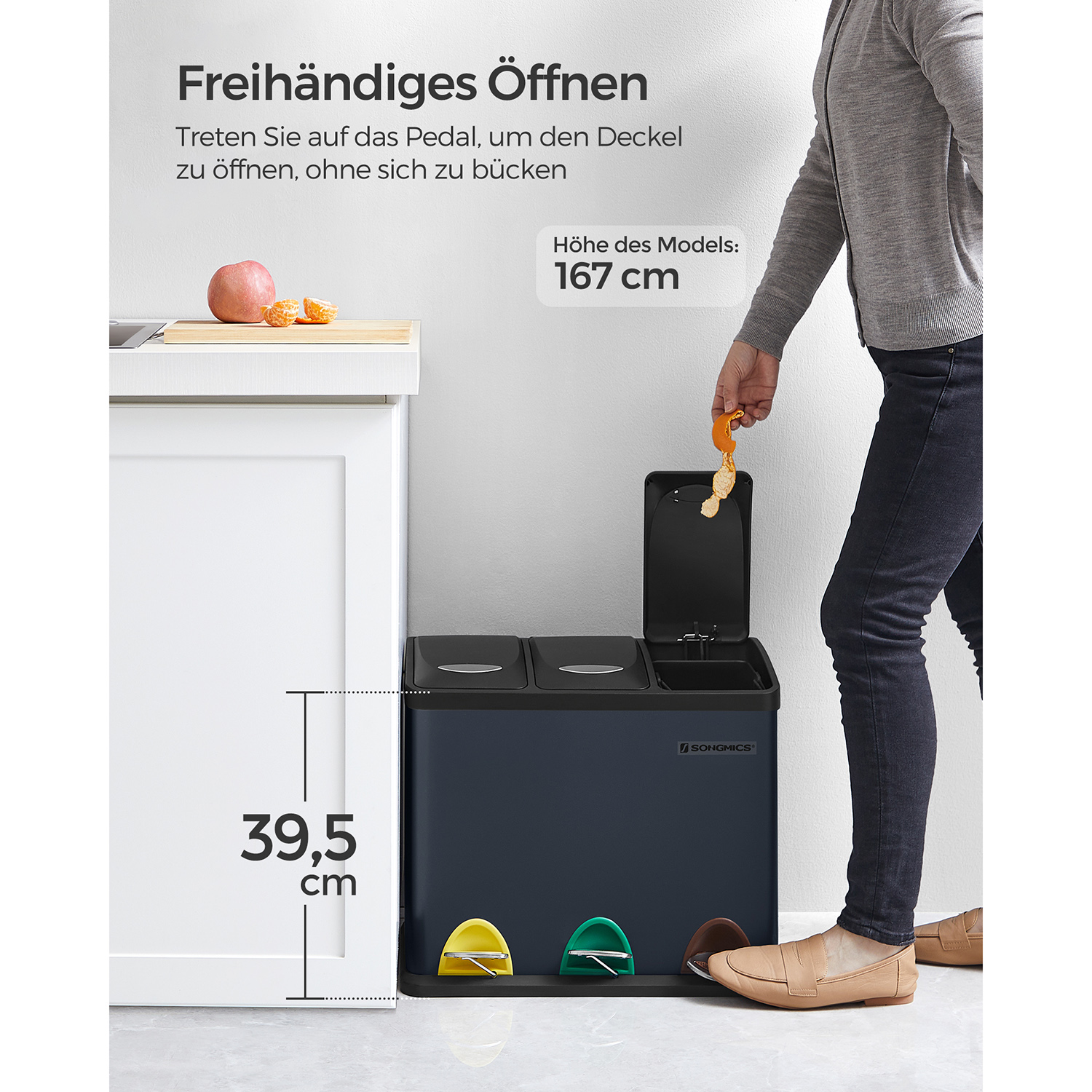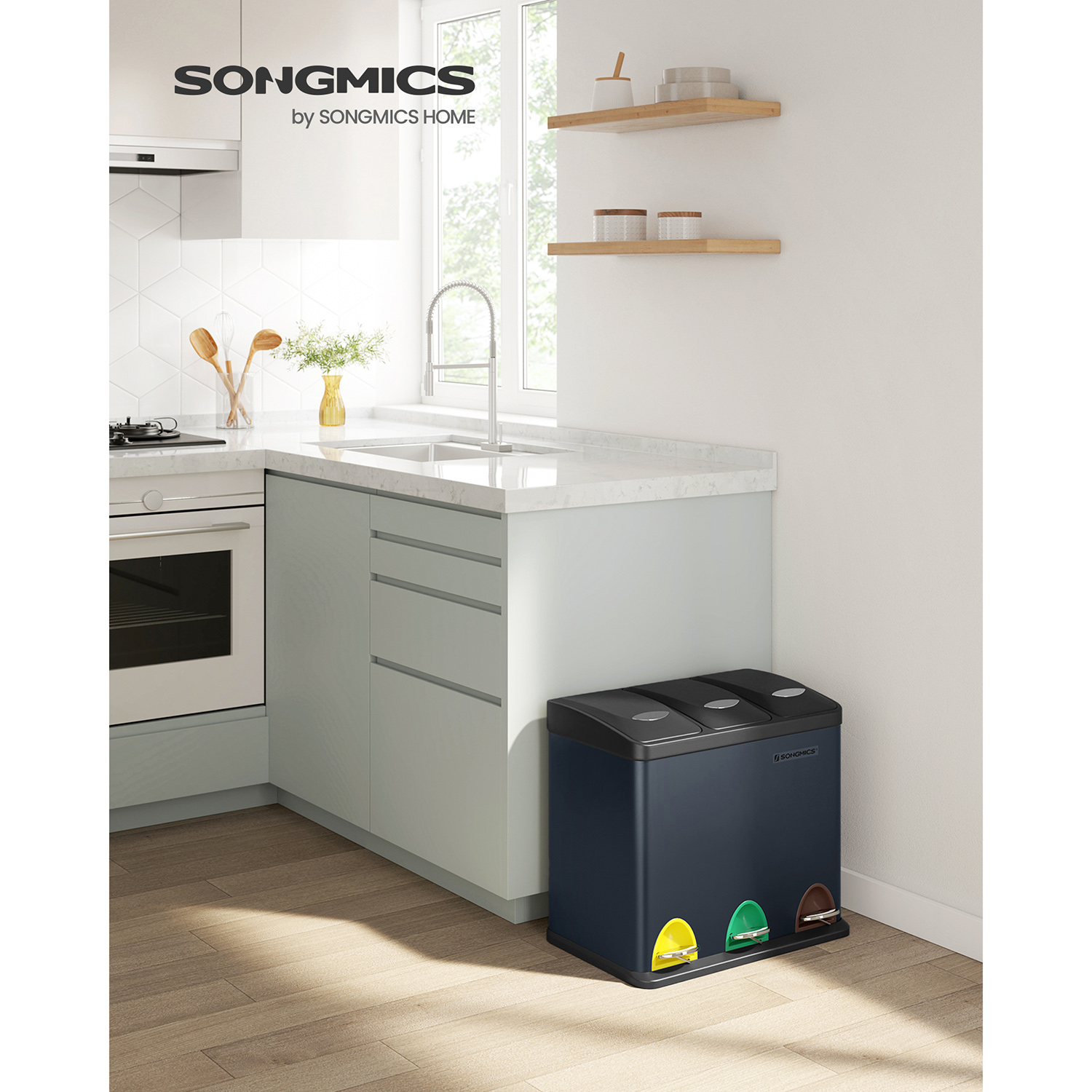 SONGMICS kitchen trash can, 3-in-1 trash can, 24 liters, waste separation, metal pedal bin, waste separation system, robust, easy to clean, steel, smoke gray LTB24GS