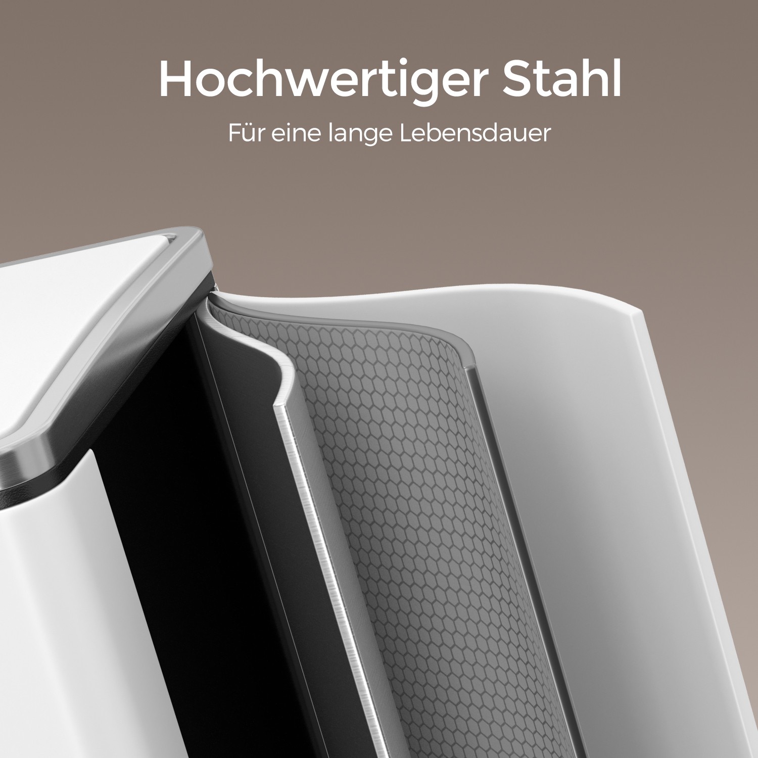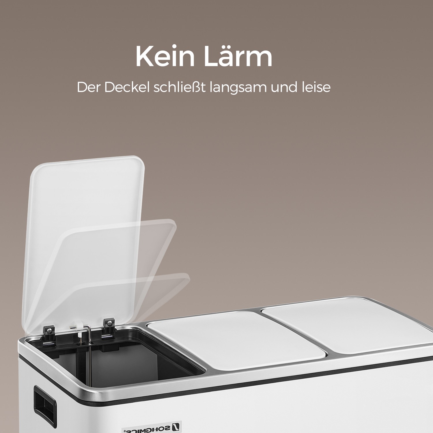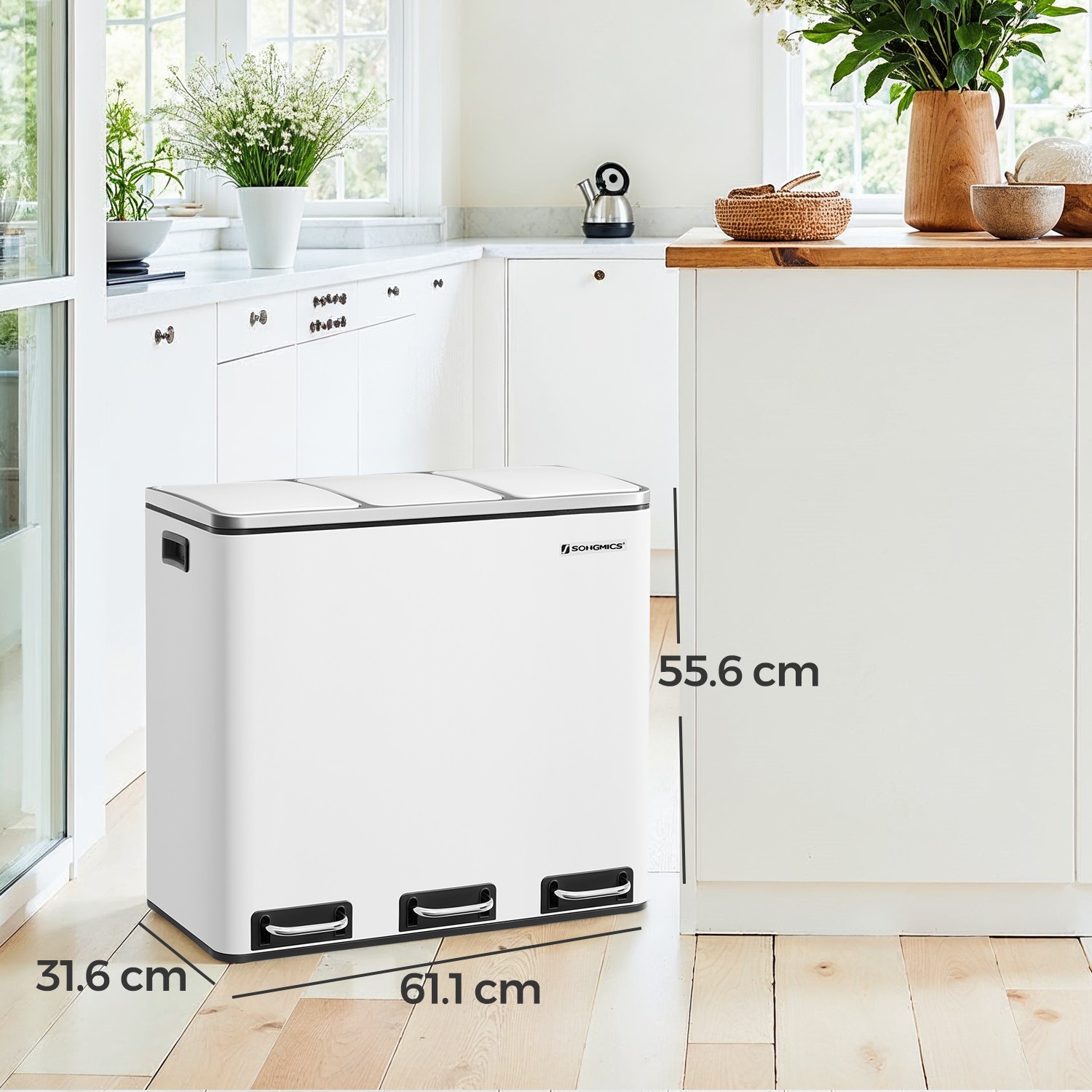 Product details: Color: White Material: Steel, PP plastic (inner bucket), ABS plastic (lid) Overall size: 61.5 x 31.5 x 56 cm (L x W x H) Size per inner bucket: 18 x 26.5 x 49 cm (L x W x H) Total height (with lid open): 84.5 cm Weight: 9.1 kg Recycling can also be easy: this pedal bin with 3 separate compartments makes it easy to sort your waste, e.g., residual waste and organic waste. All you have to do is press the pedal and throw the waste into the inner bin. You don’t even have to touch the trash can with your hands, which ensures hygiene. A “puppy- and child-proof” trash can: Does your dog often rummage through the trash can? Do your little ones frequently reach into the open container? If so, you’ll definitely want to put a stop to it. That’s where our pedal bin comes in! The lid only opens when you press the pedal. Scope of delivery: 1 x trash can 1 x instructions (DE, EN, FR, ES, IT) SONGMICS notes: Wipe the product with a damp cloth to clean it and then dry it.