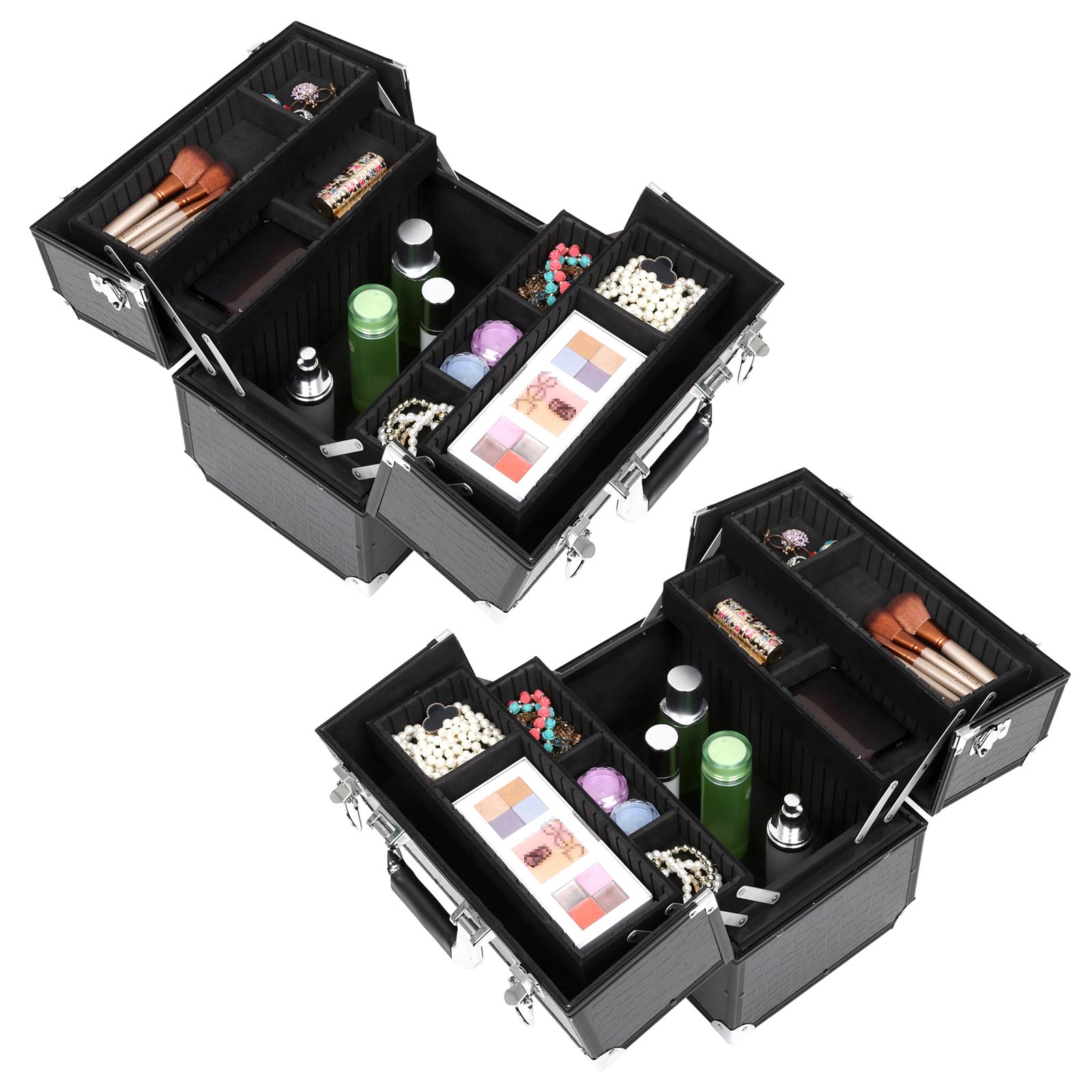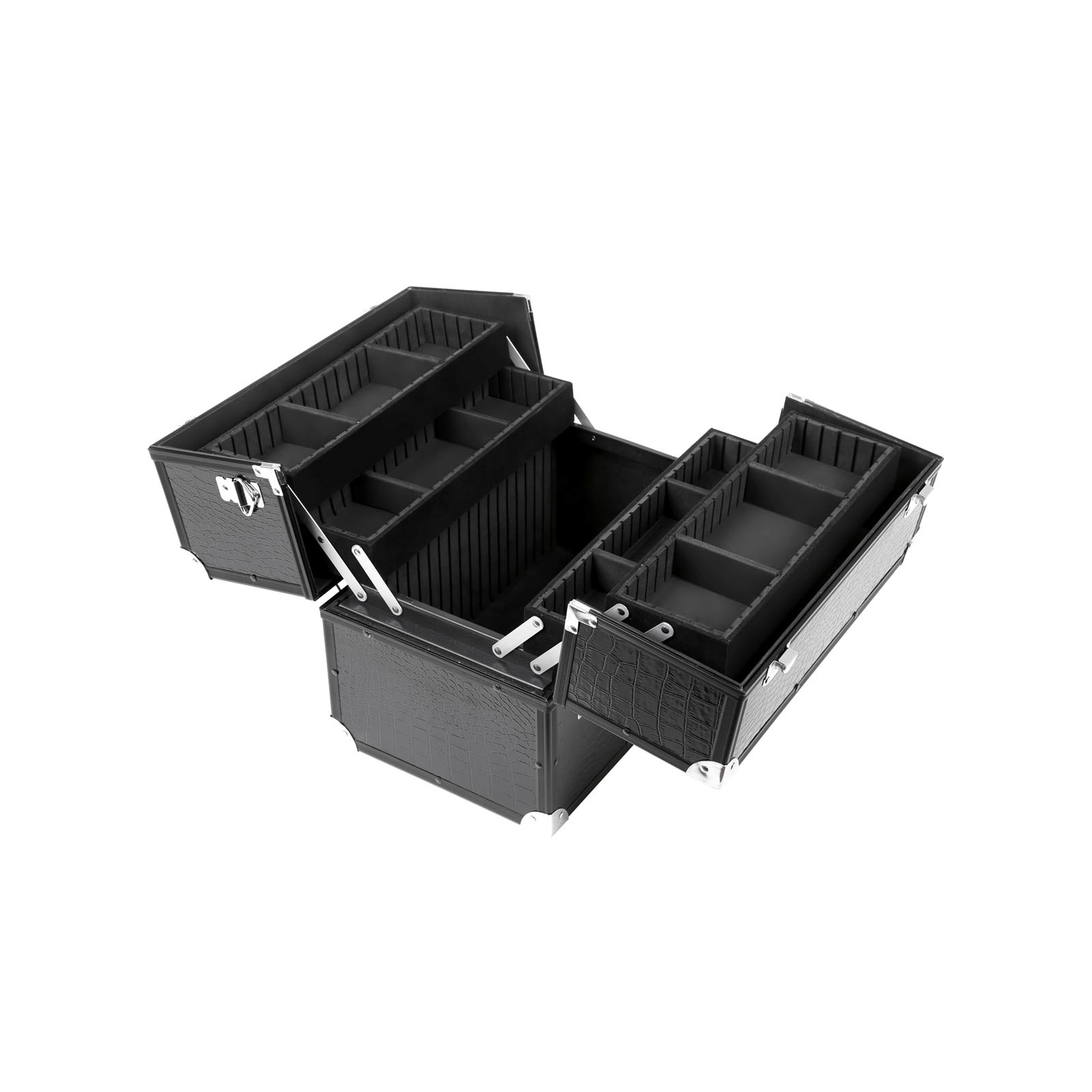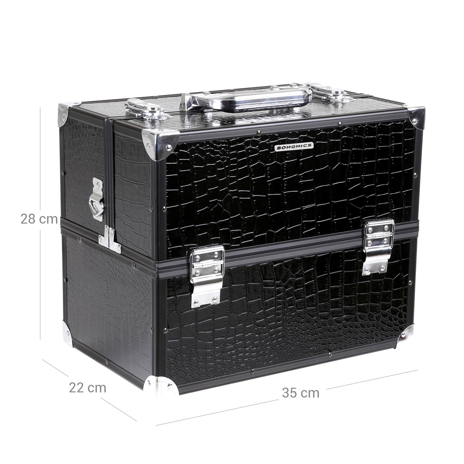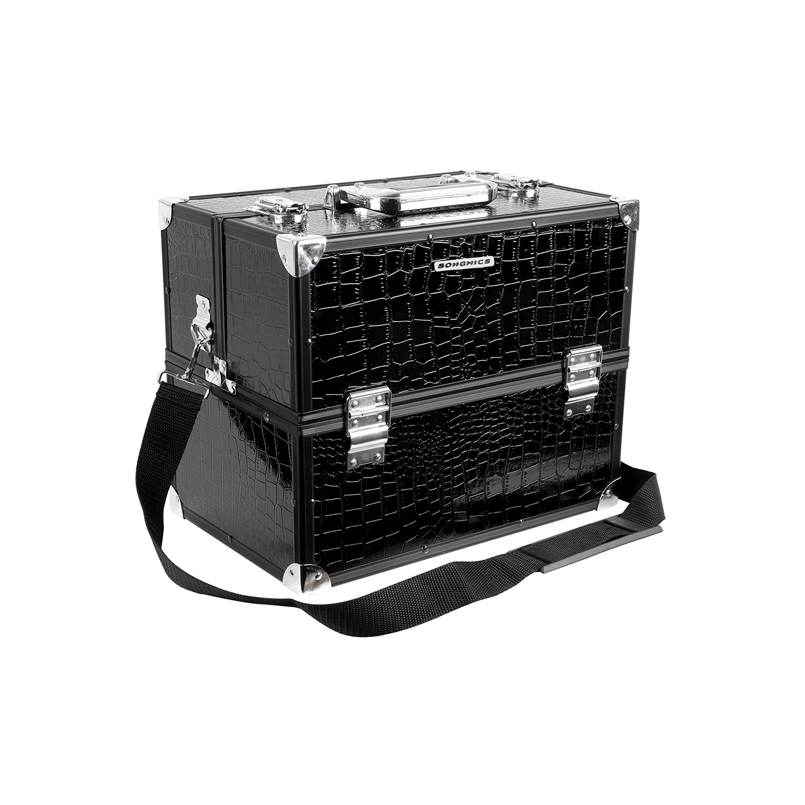 Your large bags? And can you never find the right ones when you need them? Then the Songmics makeup case is perfect for you! The black faux leather in an elegant crocodile look with black aluminum strips gives the cosmetic case a simple yet elegant appearance. The EVA-padded lining for the compartments protects the contents from bumps and scratches. It also offers plenty of storage space, especially thanks to the small compartments that are visible when opened. Three levels in the case are enough for your needs to sort all your utensils and have everything ready at your fingertips. Notes: – The two side lids are grooved at the opening edge, so please align the two aluminum strips first, then close. – Please do not place any items taller than 4.5 cm in the top compartments. – To ensure you have a suitable cosmetic case, please note the dimensions of the inner compartments before ordering. If you have any questions, please contact us. Product details: – Material: – Frame: MDF board + aluminum strips + metal corners – Covering: PU with crocodile grain – Inner lining: EVA + velvet – Handle: chrome-plated ABS plastic + rubber – Overall dimensions: 35 x 28.5 x 22 cm (W x H x D) – Dimensions of the fold-out compartment (4 x): 28.5 x 3 x 8 cm (W x H x D) – Dimensions of the lower storage space: 33 x 14 x 20 cm (W x H x D) Scope of delivery: – 1 x cosmetic case – 1 x carrying strap – 2 x keys