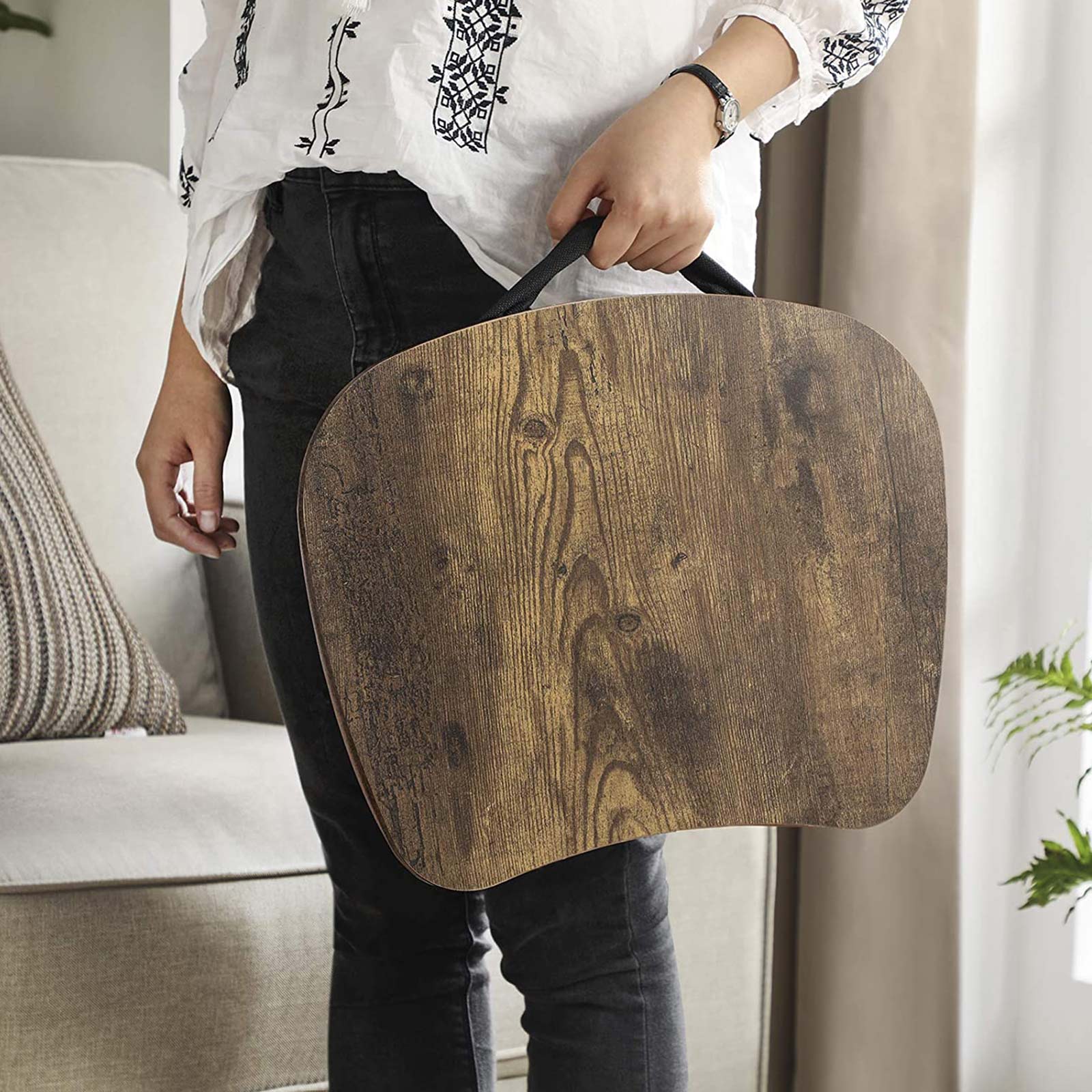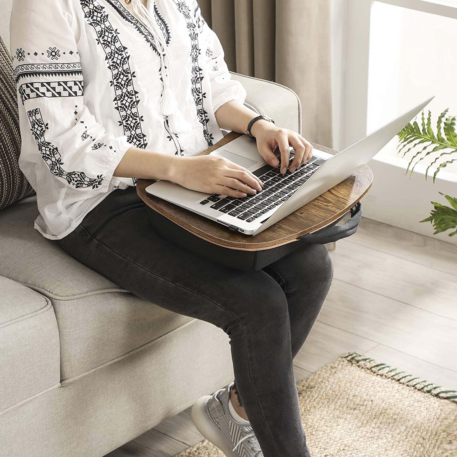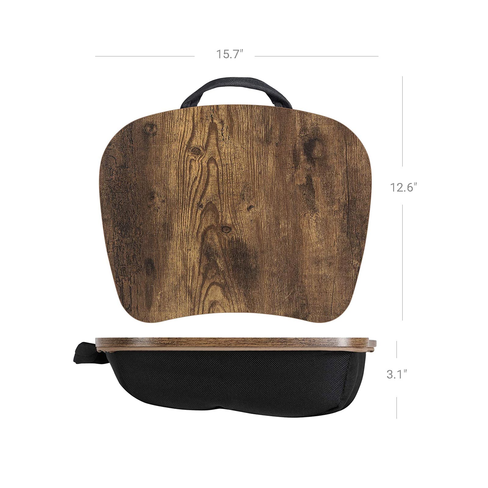 Advantages of this laptop table: Thanks to its carrying handle, this laptop table is easy to transport.The soft pad increases comfort when you place this laptop table on your legs. No assembly required. This product is ready to use immediately. Thanks to its compact size and light weight, you can carry this laptop table wherever you need it. Product details: Color: Vintage brown Material: MDF (medium-density fiberboard), foam particles Size: 40 x 32 x 8 cm (L x W x H) Weight: 1 kg Scope of delivery: 1 x laptop table SONGMICS Notes: To avoid damage, do not allow the product to come into contact with sharp objects. Do not pull too hard on the soft cushion. Keep the product away from fire.
