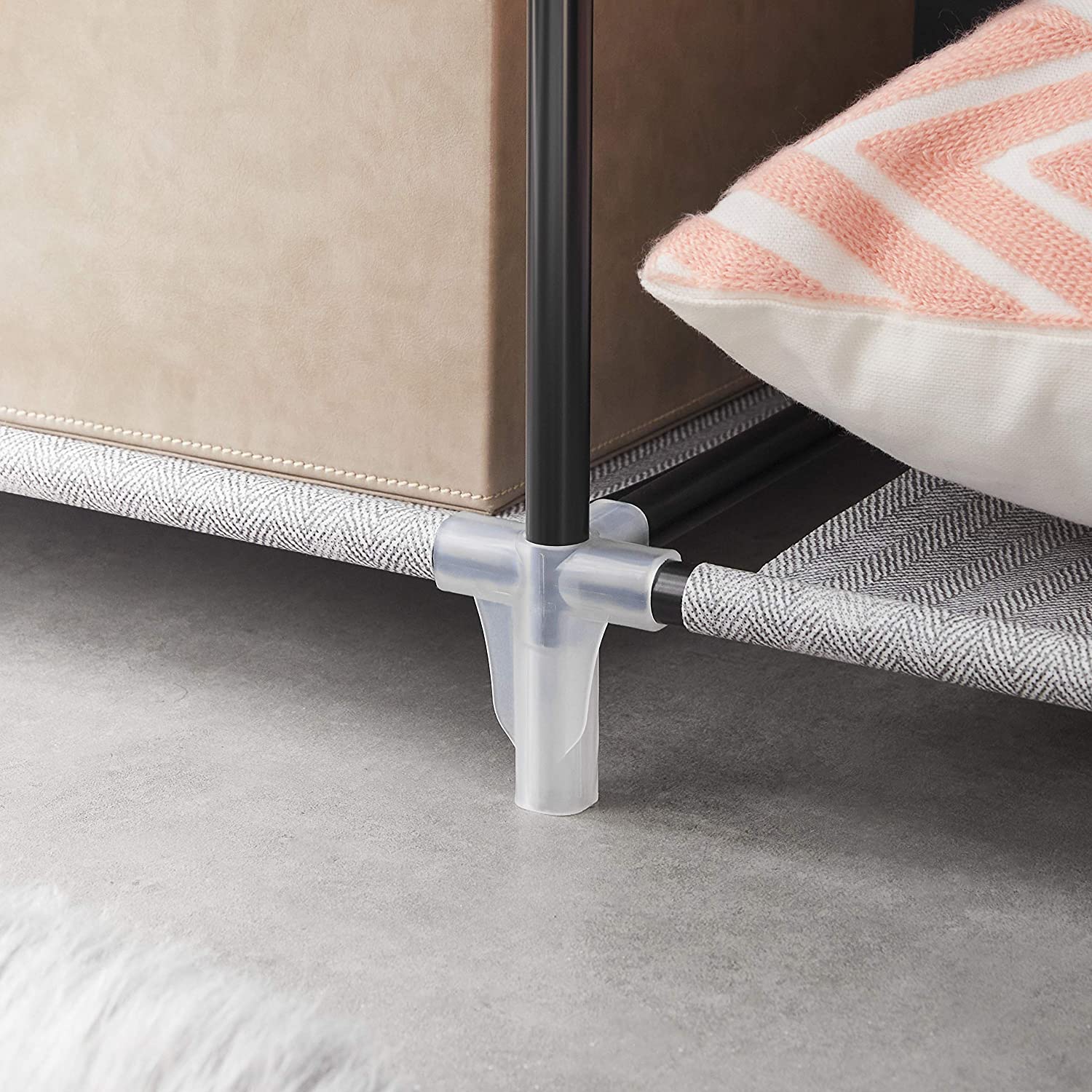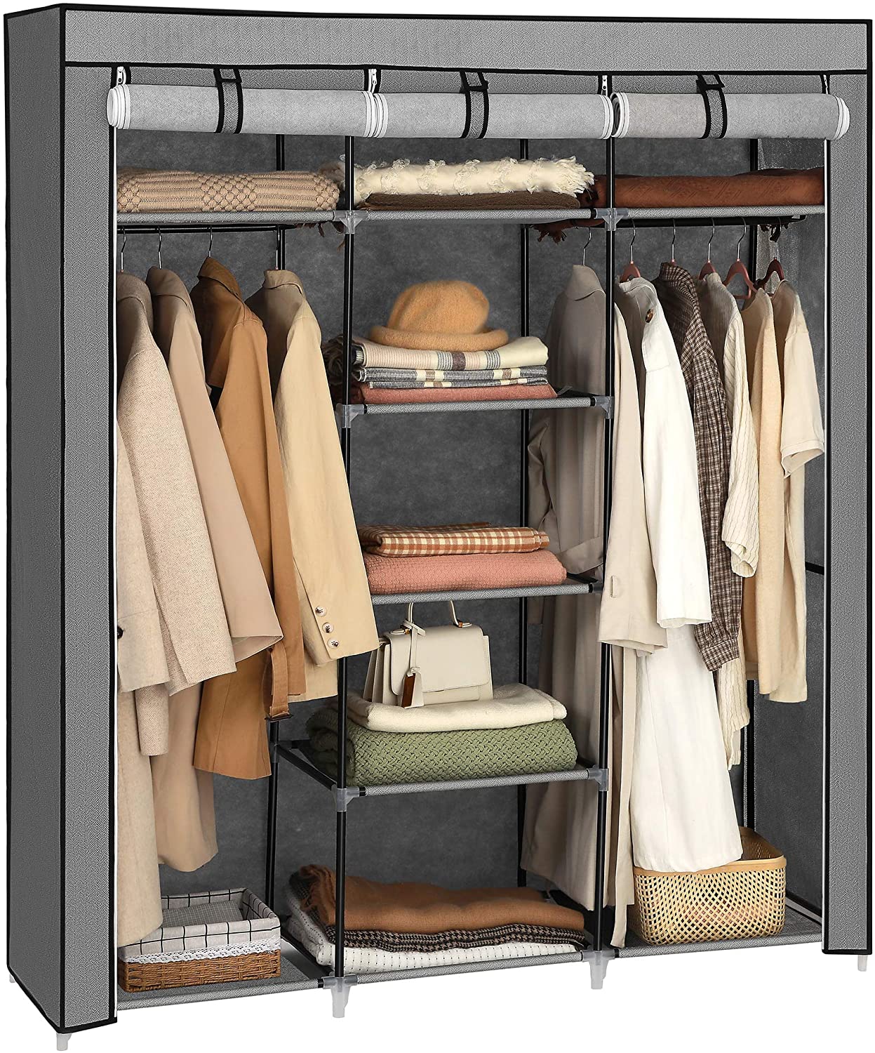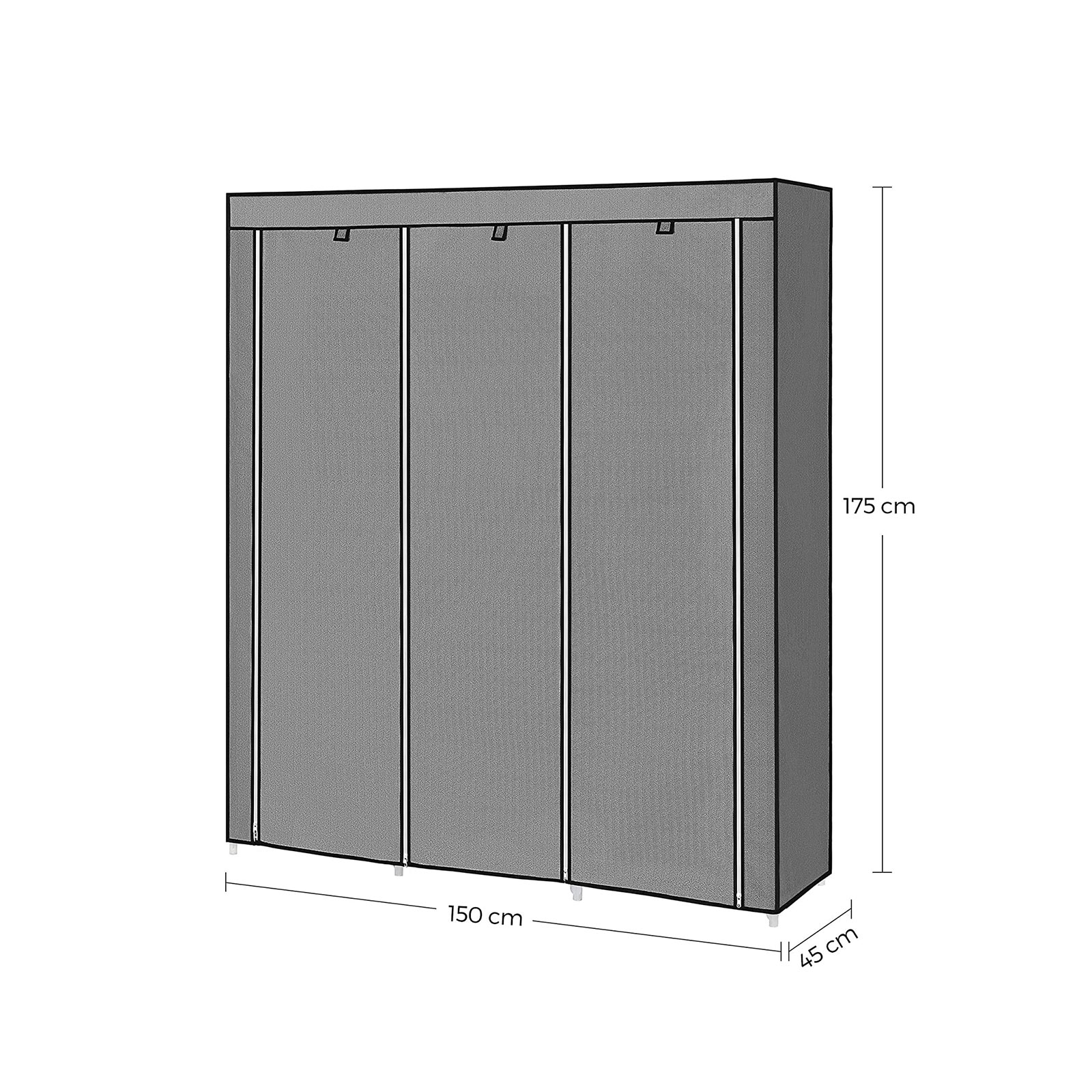 Place this fabric wardrobe in your home and spruce up your four walls. SONGMICS will never let you down! Shirts and dresses without wrinkles: With this foldable fabric wardrobe, you no longer have to search for a suitable outfit in a chaotic pile of clothes, saving you a lot of time and effort in the morning. This wardrobe is equipped with 2 clothes rails where you can hang your clothes for the next working day neatly and within easy reach. Product details: Color: Gray Material: 100 g/m² non-woven fabric, 16 mm metal tube, plastic connector Size: 150 x 45 x 175 cm (L x W x H) Weight: 4.7 kg Max. load capacity of each shelf: 5 kg Max. load capacity of the clothes rail: 15 kg Scope of delivery: 1 x fabric wardrobe 1 x instructions (DE, EN, FR, ES, IT) SONGMICS notes: Please do not use the product outdoors. For safety reasons, children are not allowed to climb on or play with the product.