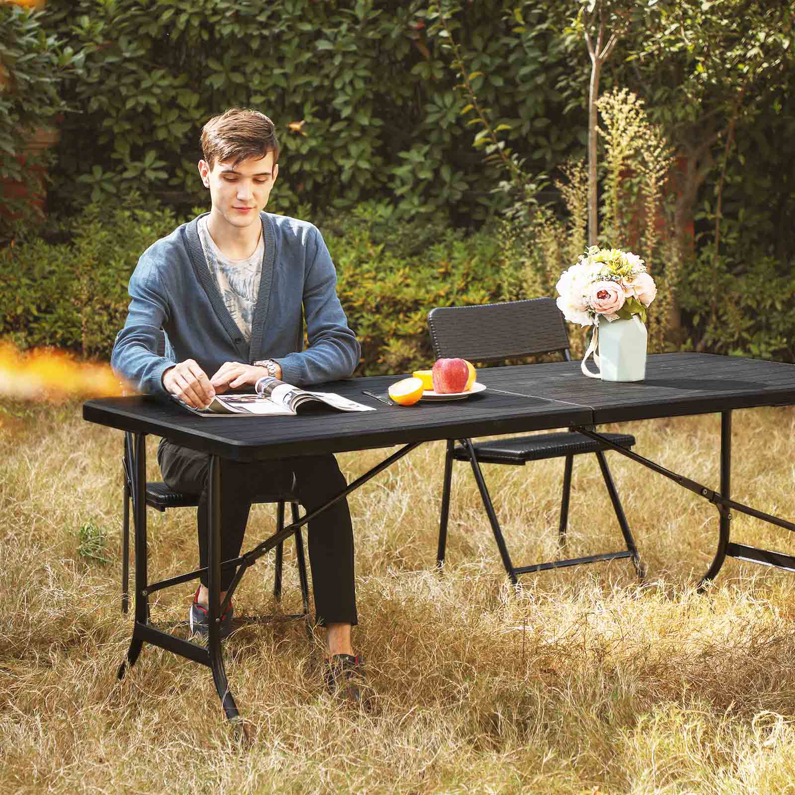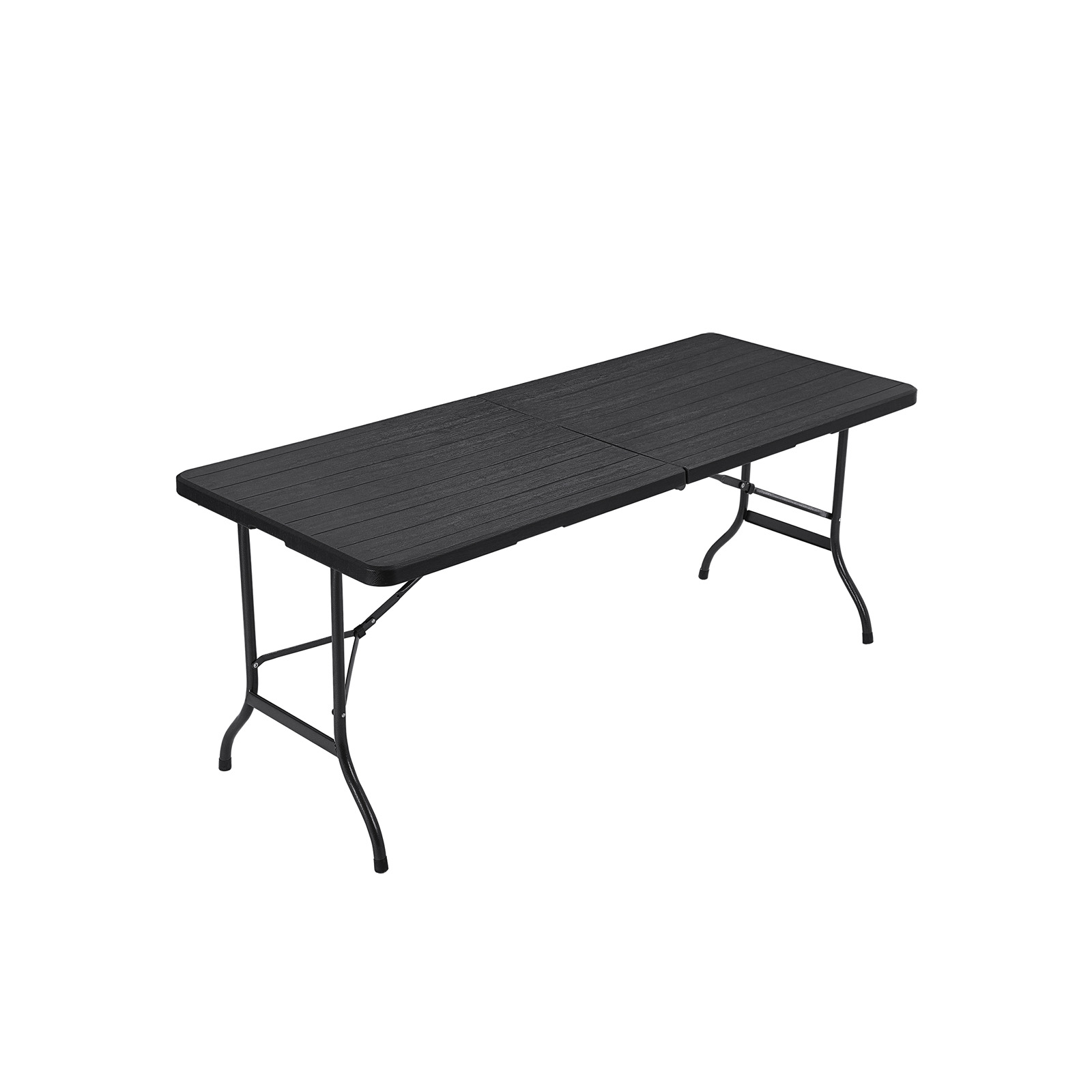 SONGMICS – This brand stands for more than just stylish and affordable furniture. We also want to provide you with practical, weatherproof, and sturdy outdoor furniture that will help you enjoy your free time even more. A folding table for all occasions If you like to spend your free time camping or in the garden, the table shown above is a stylish addition to your garden or camping furniture. The folding table with handle is also perfect for use at flea markets, as it is easy to transport. When folded, the flexible camping table measures only 90 x 75 x 8.6 cm, so it fits in your car trunk as well as in a corner of your basement or attic.Whether you want to put grilled sausages and beer on the table at the campsite or old toys and second-hand books at the flea market, the sturdy tabletop and safety latches ensure that this piece of outdoor furniture is highly stable.Take a look at the matching garden chairs from SONGMICS! Product details: Color: Black Material: Table surface: HDPE plastic (high-density polyethylene) Table legs: Powder-coated iron Size: 180 x 75 x 74 cm (L x W x H) Folded size: 90 x 75 x 8.6 cm (L x W x H) Weight: 12.5 kg Max. load capacity: 70 kg Scope of delivery: 1 x folding table 1 x instructions (DE, EN, FR, ES, IT) SONGMICS notes: Please do not expose the product to strong sunlight for long periods of time.Please do not lift or move the table while using it. There is a risk that it may fold up unintentionally, causing injury or objects to fall.